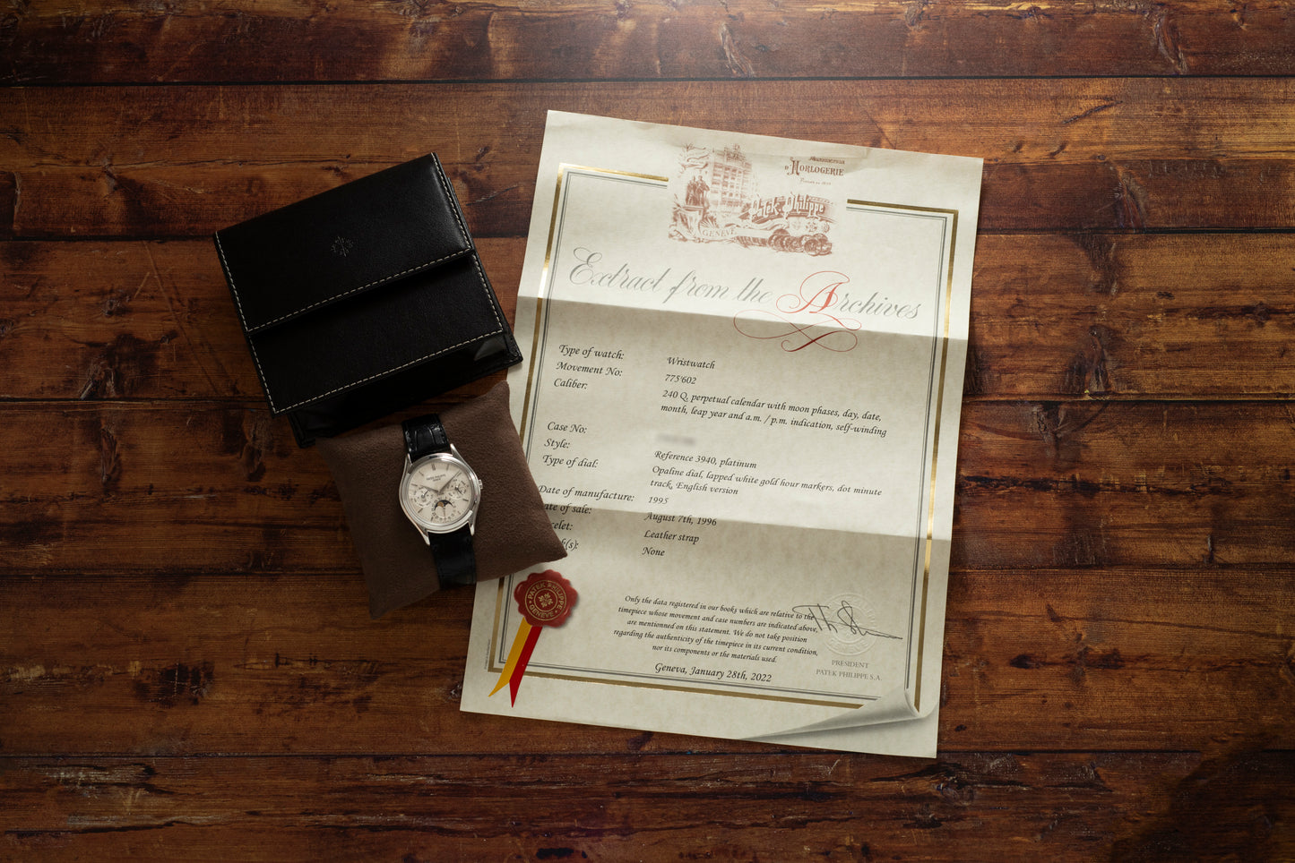 This 3940P is powered by the in-house Patek Philippe Calibre 240Q movement with micro rotor, and comes equipped with a black Patek Philippe alligator leather strap with a white gold Patek Philippe buckle. Its case is in excellent condition showing only light handling wear. Further, it’s complete with an extract from the archives confirming production in 1995 and sale in 1996.