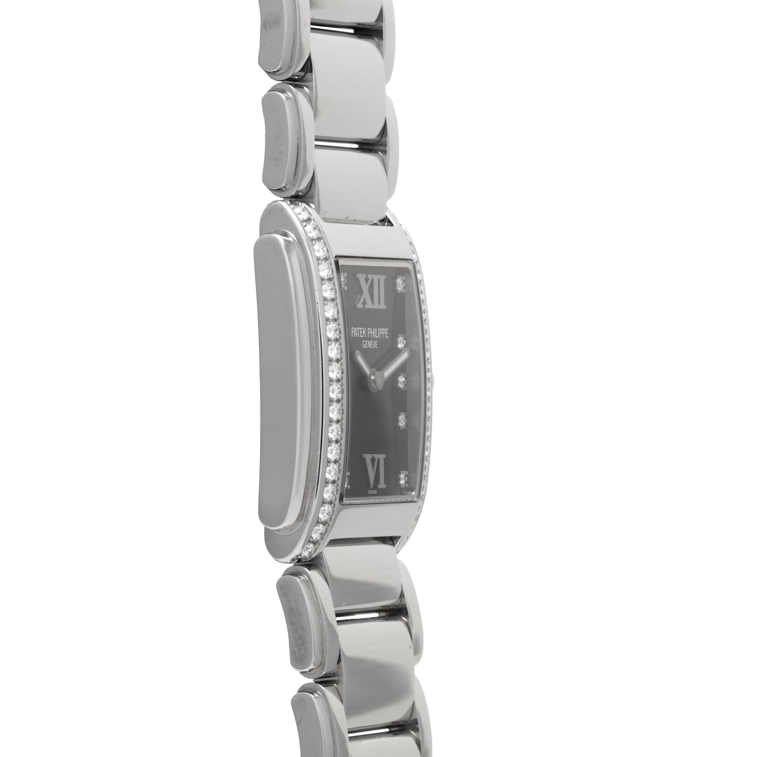 This particular Twenty-4, a Reference 4910/10A-001 from circa 2013, features a 25mm, rectangular stainless steel case with a 14mm lug width, a Calatrava-signed crown, polished and diamond-decorated bezel, a black diamond dial with matching handset, and a multi-link stainless steel bracelet.