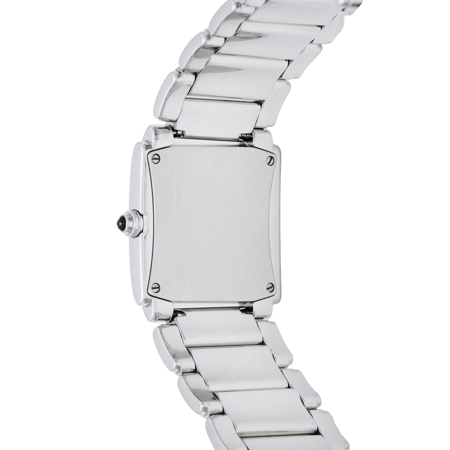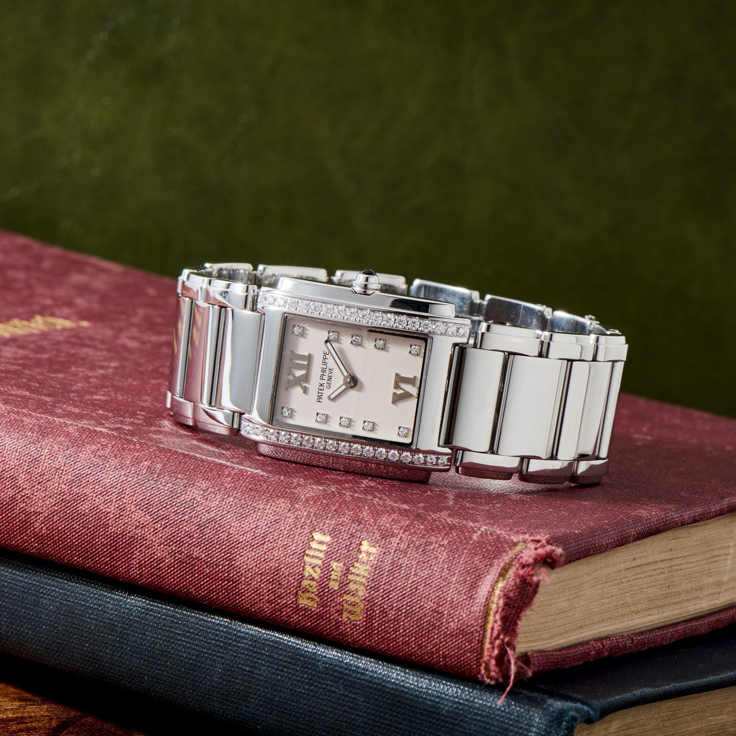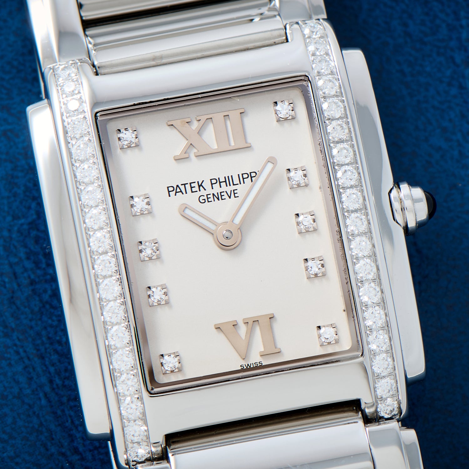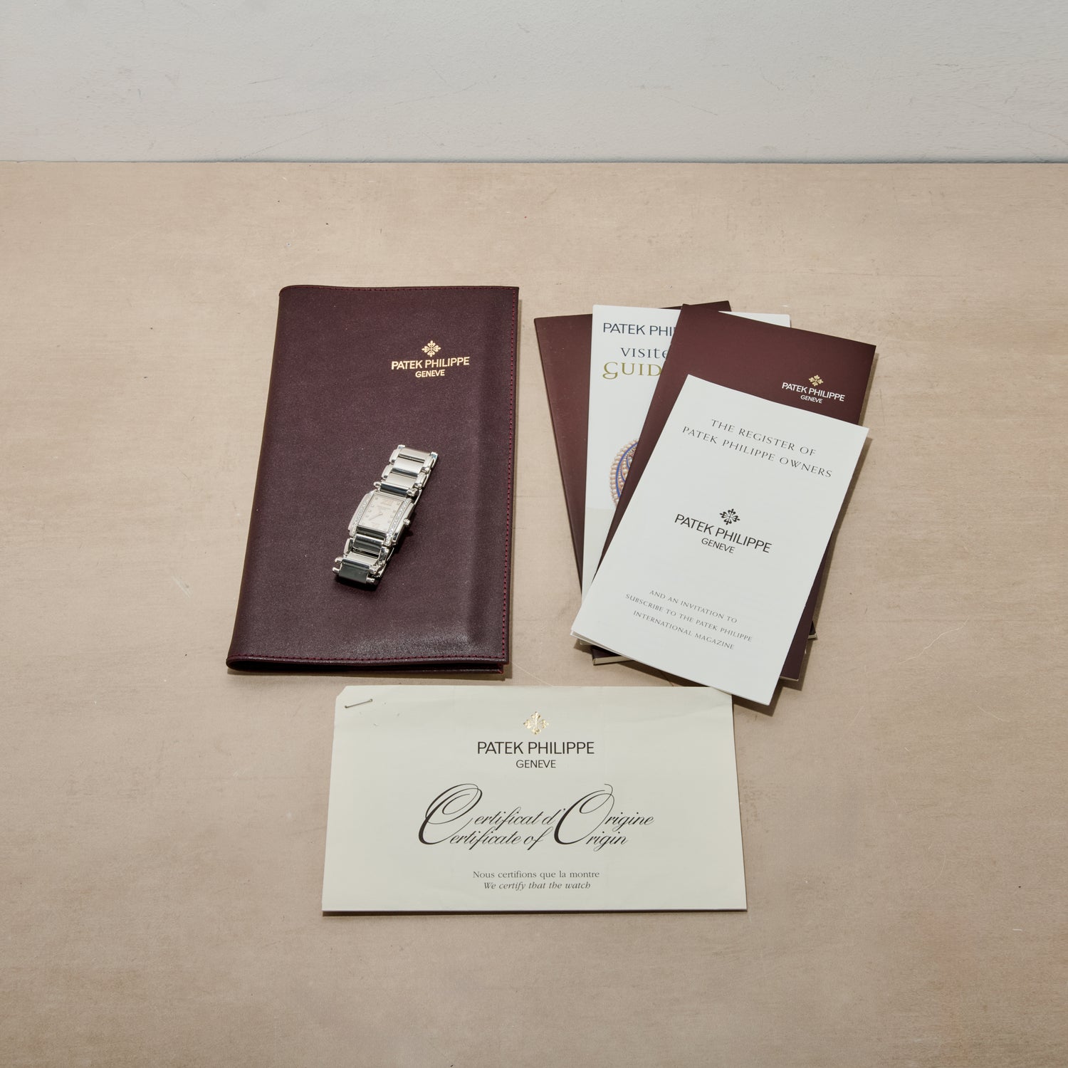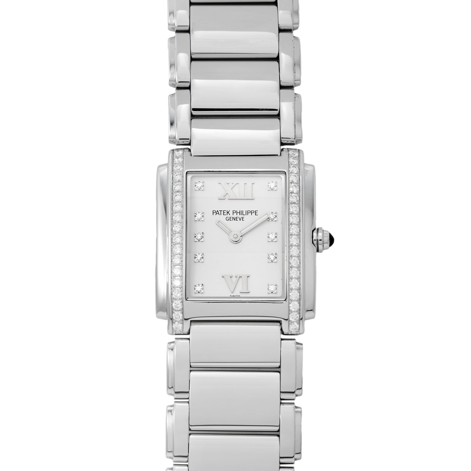 This particular Twenty-4, a Reference 4910/10A-011 from circa 2003, features a 25mm, rectangular stainless steel case with a 14mm lug width, a Calatrava-signed crown, polished and diamond-decorated bezel, a cream dial with matching handset, and a multi-link stainless steel bracelet.
