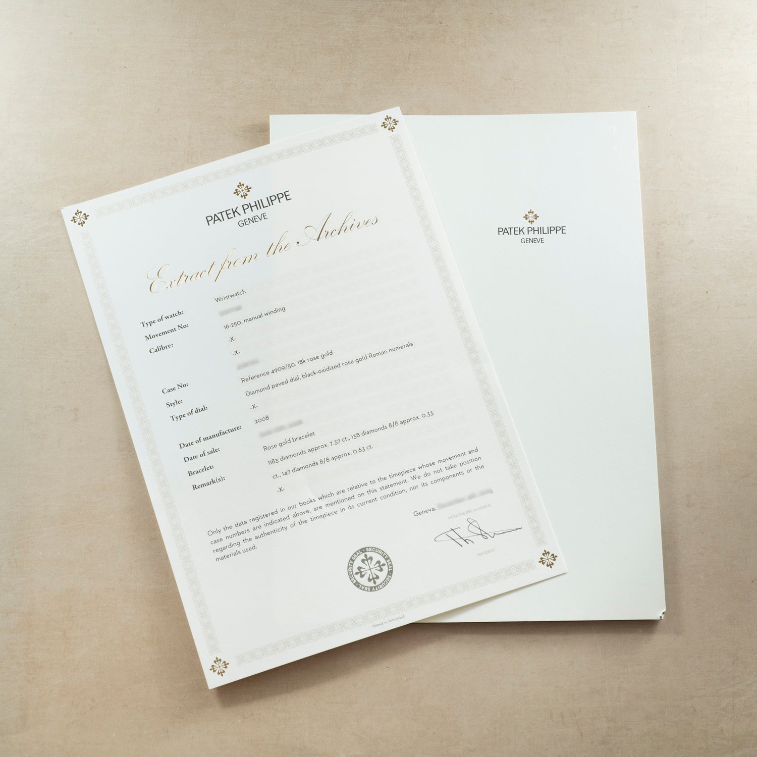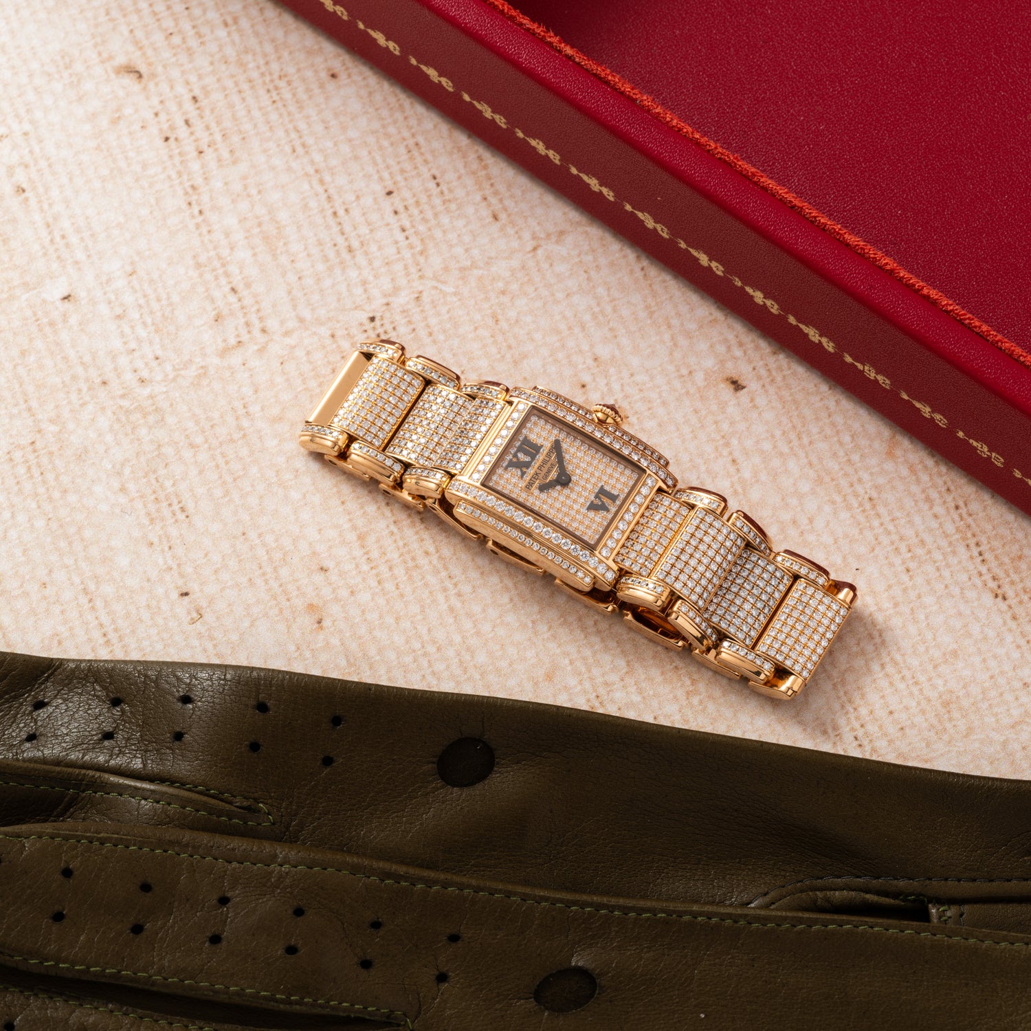 This particular Twenty-4, a Reference 4909/50R-001, features a 22mm, rectangular rose gold case with an exceptional diamond set case, dial, and bracelet, all done by Patek's factory.