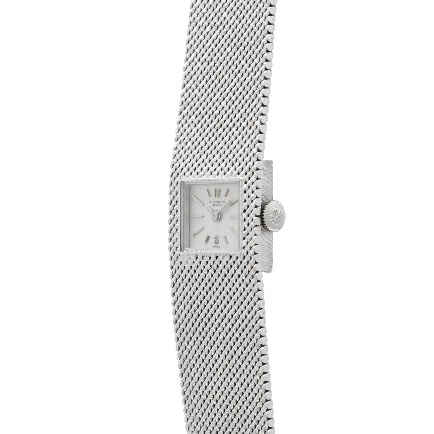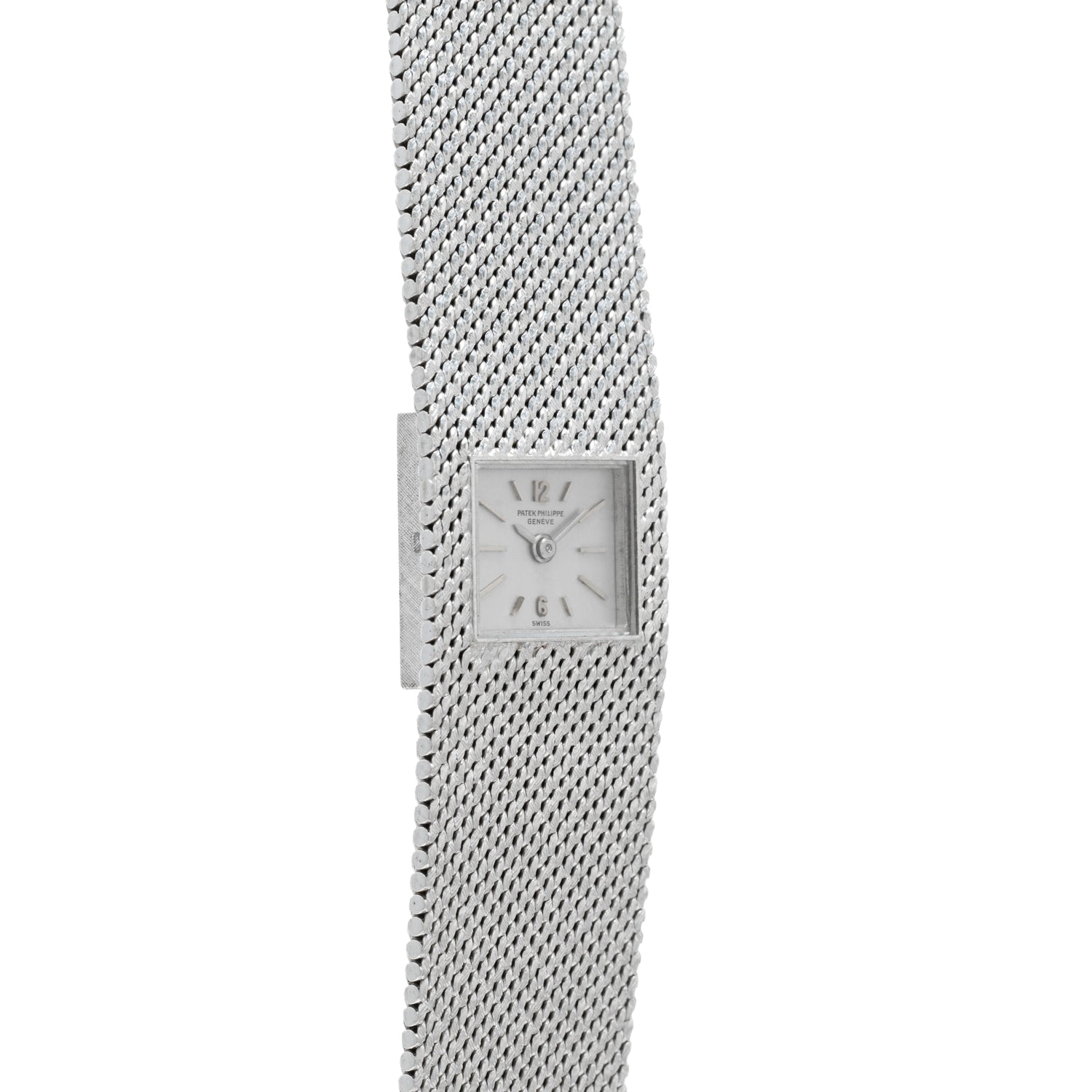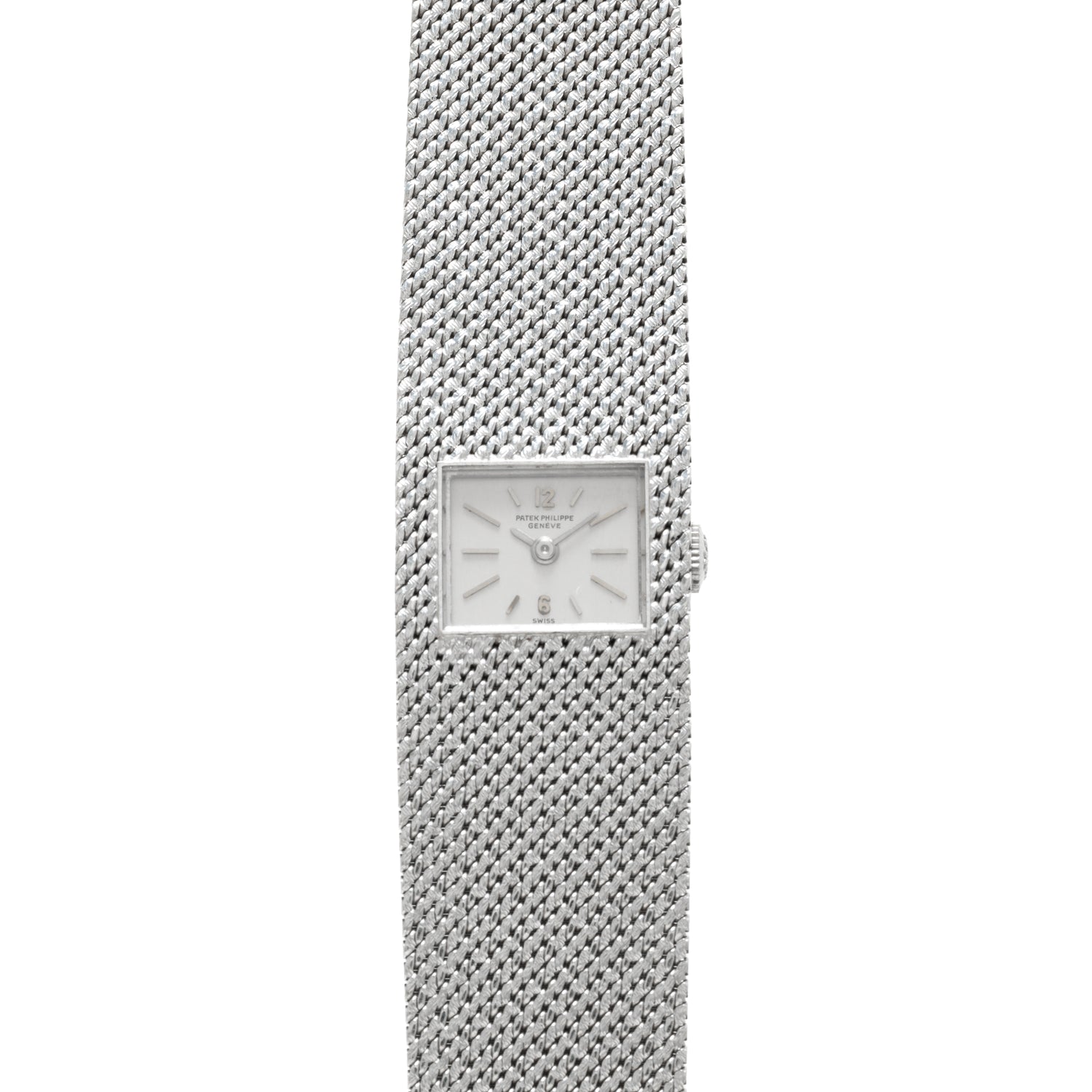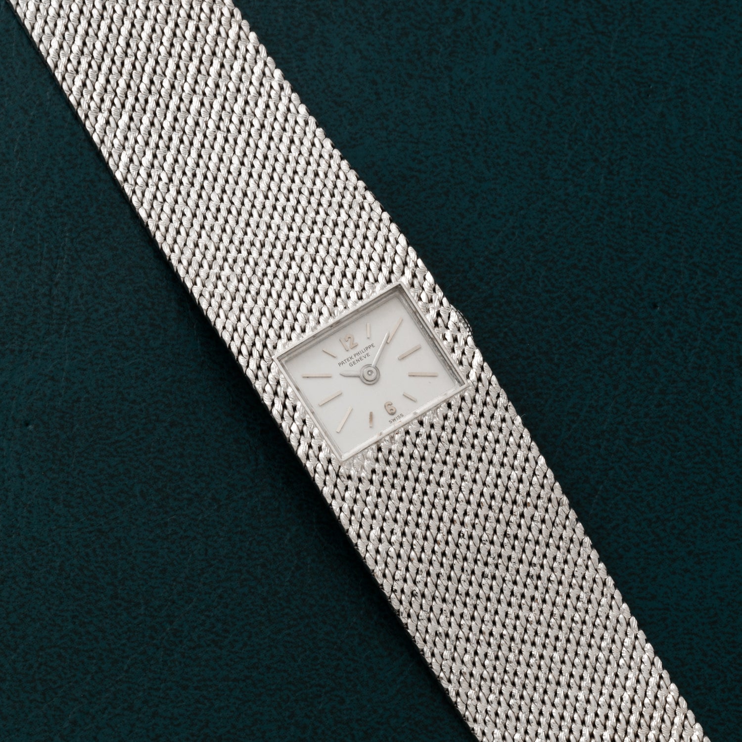 Housed in a 20mm white gold case with an integrated bracelet, it's produced in a sumptuous 'woven' texture that gives it the look of a piece of fine fabric. Set within the center of the case/bracelet is a rectangular dial in a patinated champagne color with applied 'baton' and Arabic indices and a 'pencil' handset. A signed crown, acrylic crystal, and a fold-over clasp round out its elegant design, while a hand-wound movement from Patek Philippe keeps the profile thin.