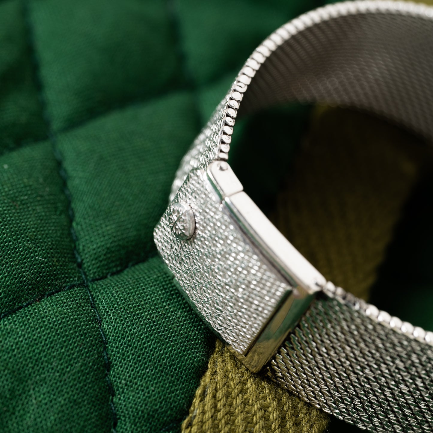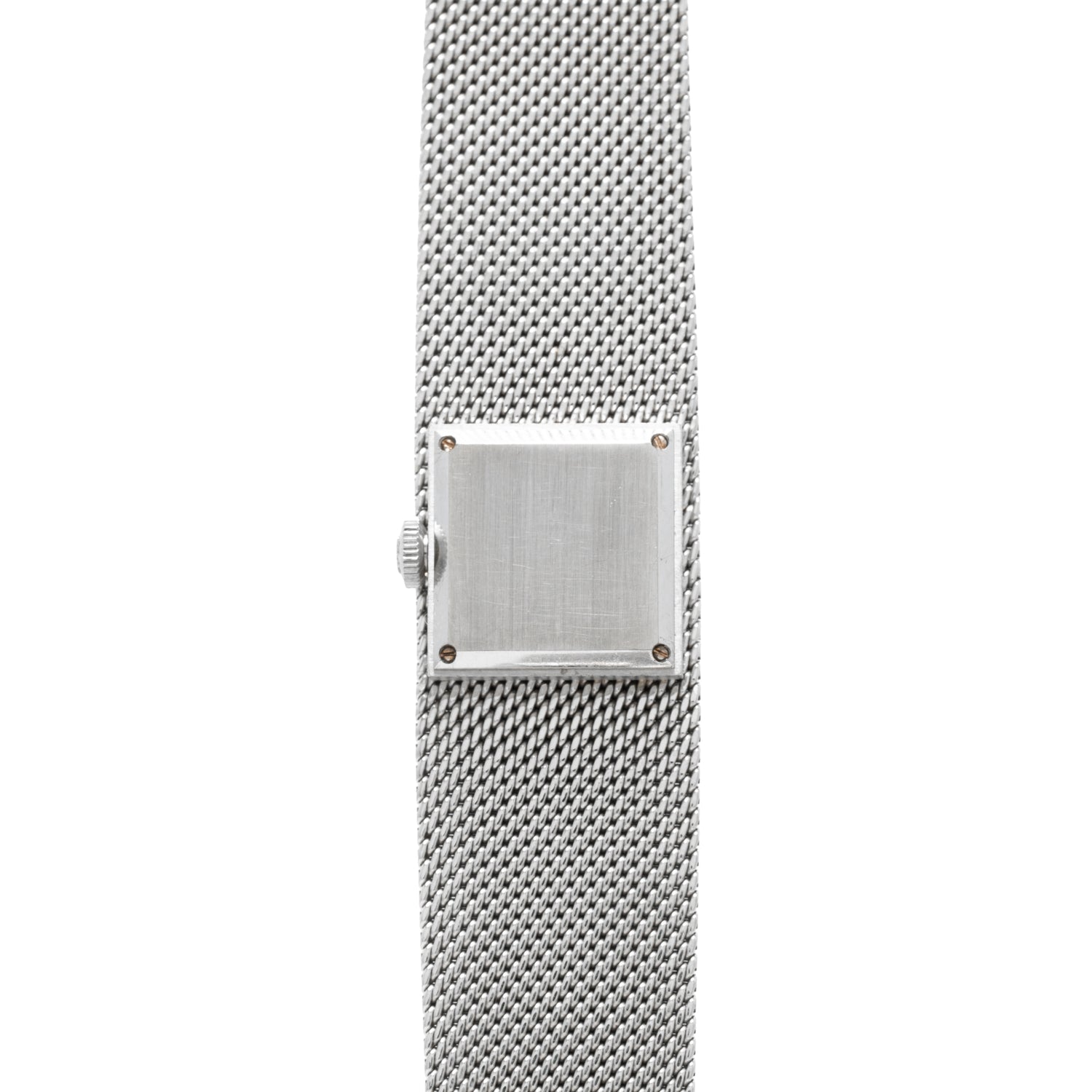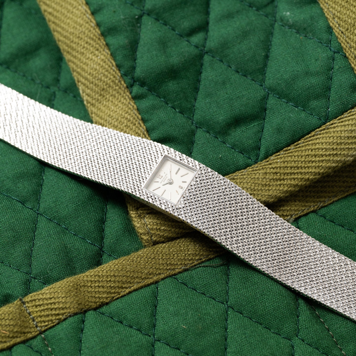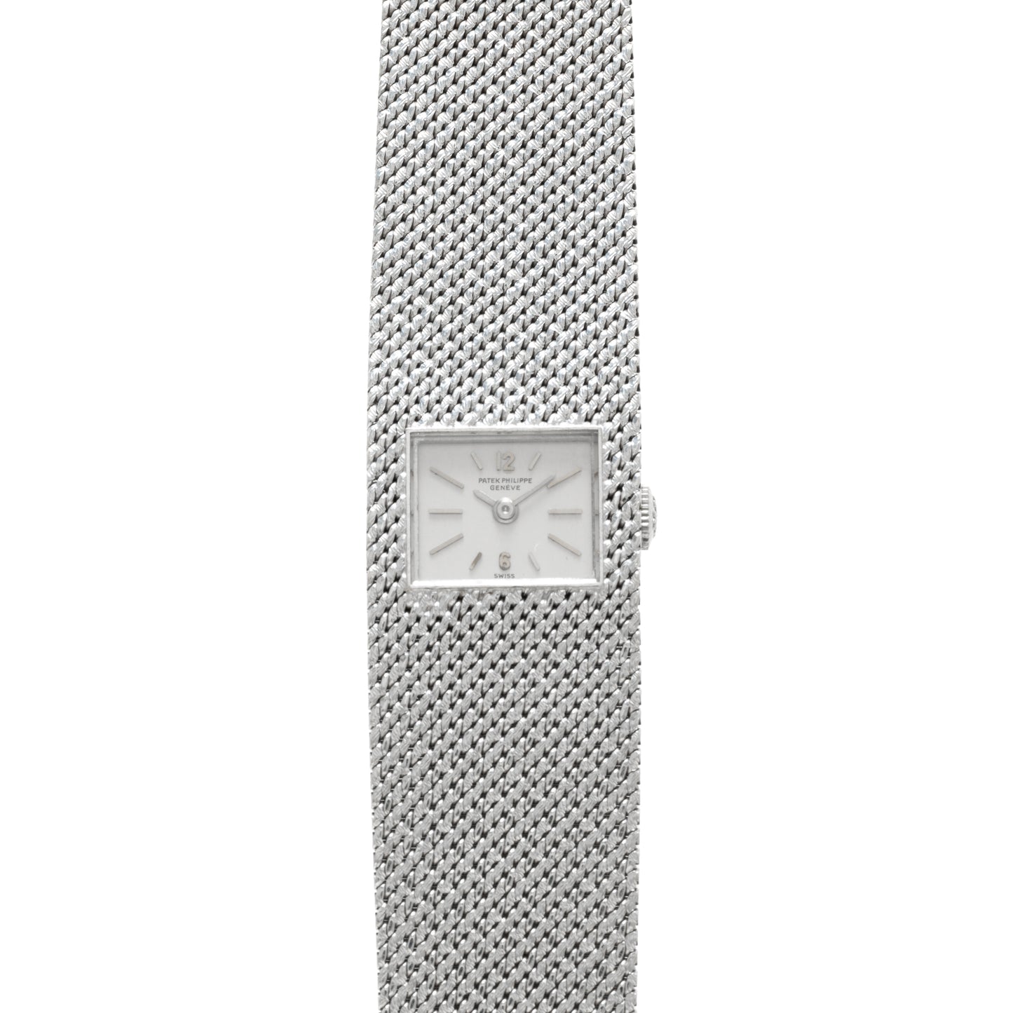 Housed in a 20mm white gold case with an integrated bracelet, it's produced in a sumptuous 'woven' texture that gives it the look of a piece of fine fabric. Set within the center of the case/bracelet is a rectangular dial in a patinated champagne color with applied 'baton' and Arabic indices and a 'pencil' handset. A signed crown, acrylic crystal, and a fold-over clasp round out its elegant design, while a hand-wound movement from Patek Philippe keeps the profile thin.