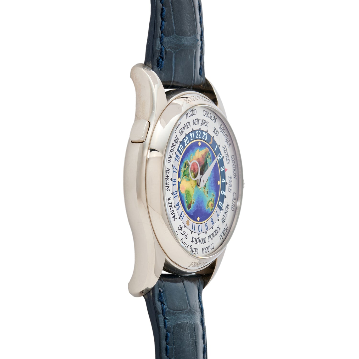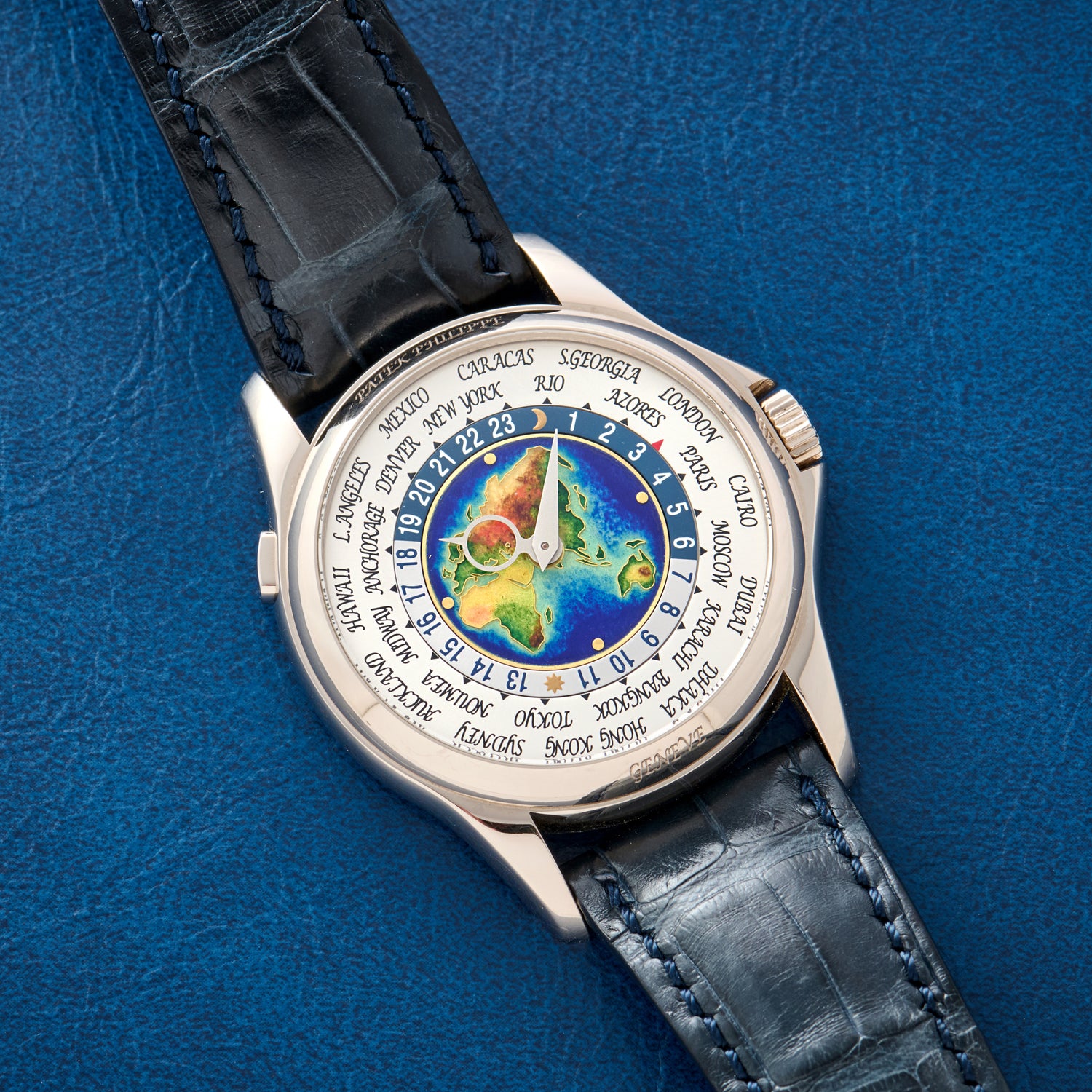 Enter the Patek Philippe 5131G-001, a modern realization of that legacy. Crafted in 18K white gold, its 39.5mm case frames a cloisonné enamel map depicting the Americas, Asia, and Australia — each cell of color fired, cooled, and coaxed into brilliance. A two-tone 24-hour ring (blue for night, silver for day) rotates in harmony with a city ring controlled by the 10 o’clock pusher, allowing the wearer to see the world at a glance.