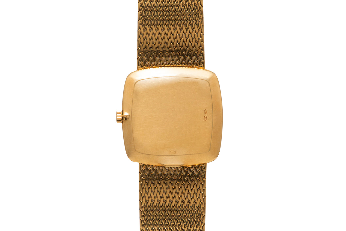 Dating to circa the late 1970s, this particular piece features a square 28mm 18k yellow gold case with an excellent integrated yellow gold 'hammered'-finished mesh bracelet, a signed crown, and a sunburst champagne dial with printed black 'Roman' indices and a matching black pencil handset. Powered by Patek Philippe's Calibre 177 manual-winding movement, it’s quite simply a piece of horological art.