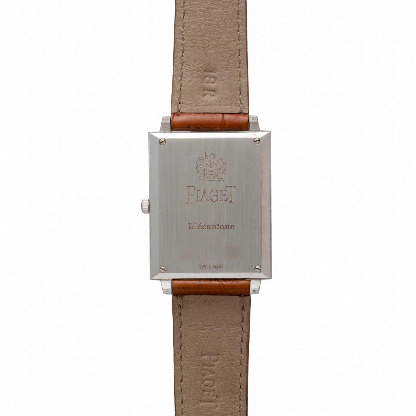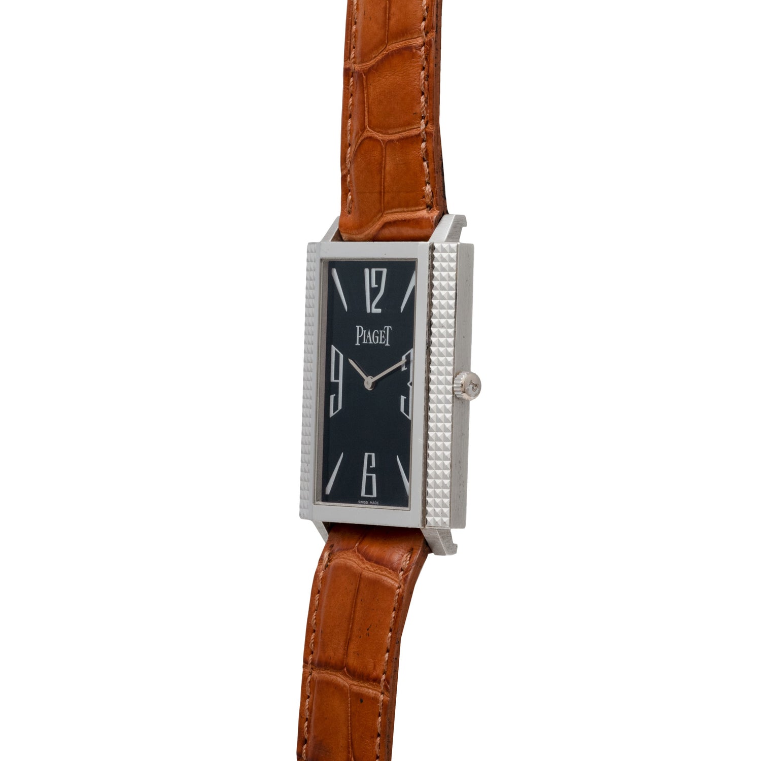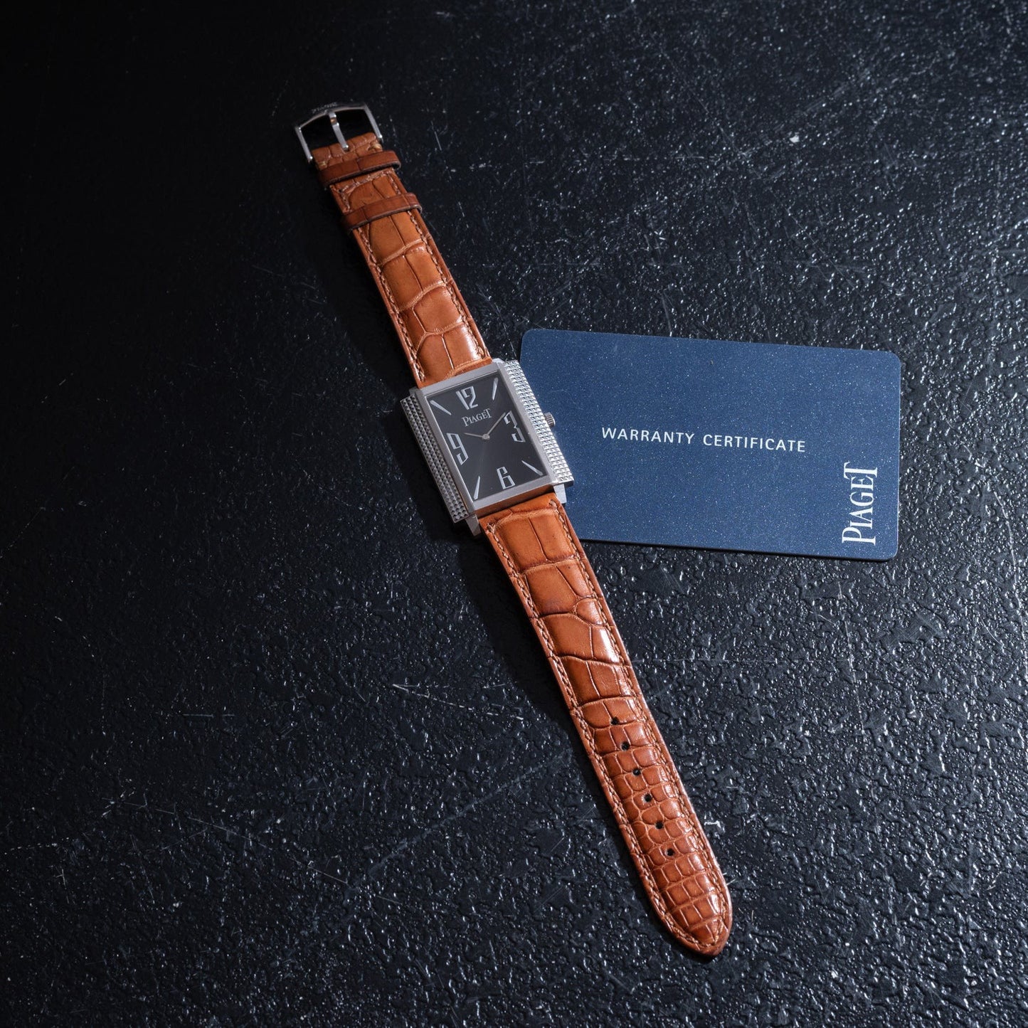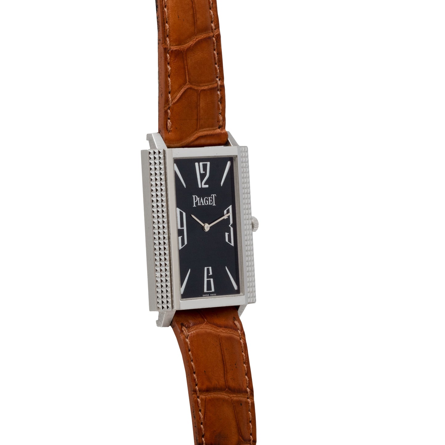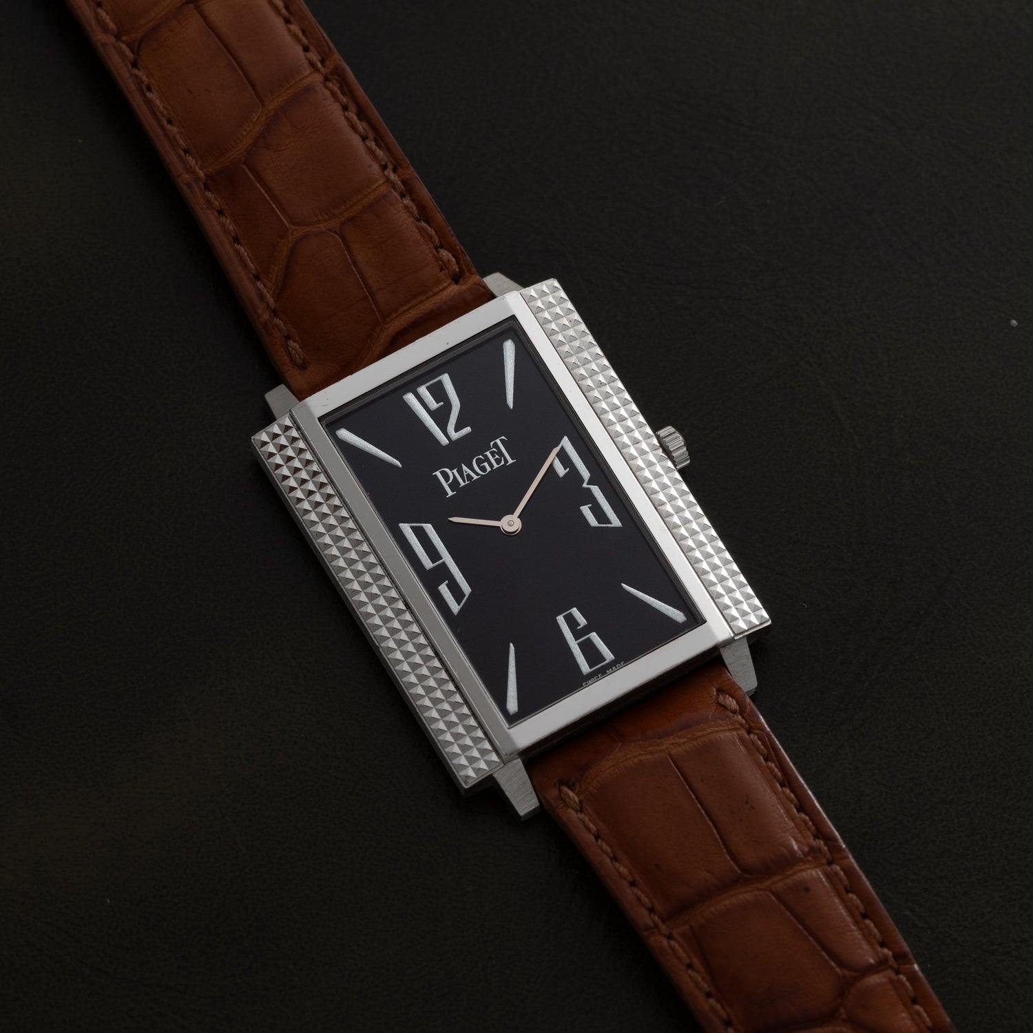 Housed in a 28mm 18K white gold, stepped case with a fantastic 'hobnail' pattern, signed crown and sapphire crystal, this Piaget features a striking black dial with quadrant indices and jumbo hour markers.