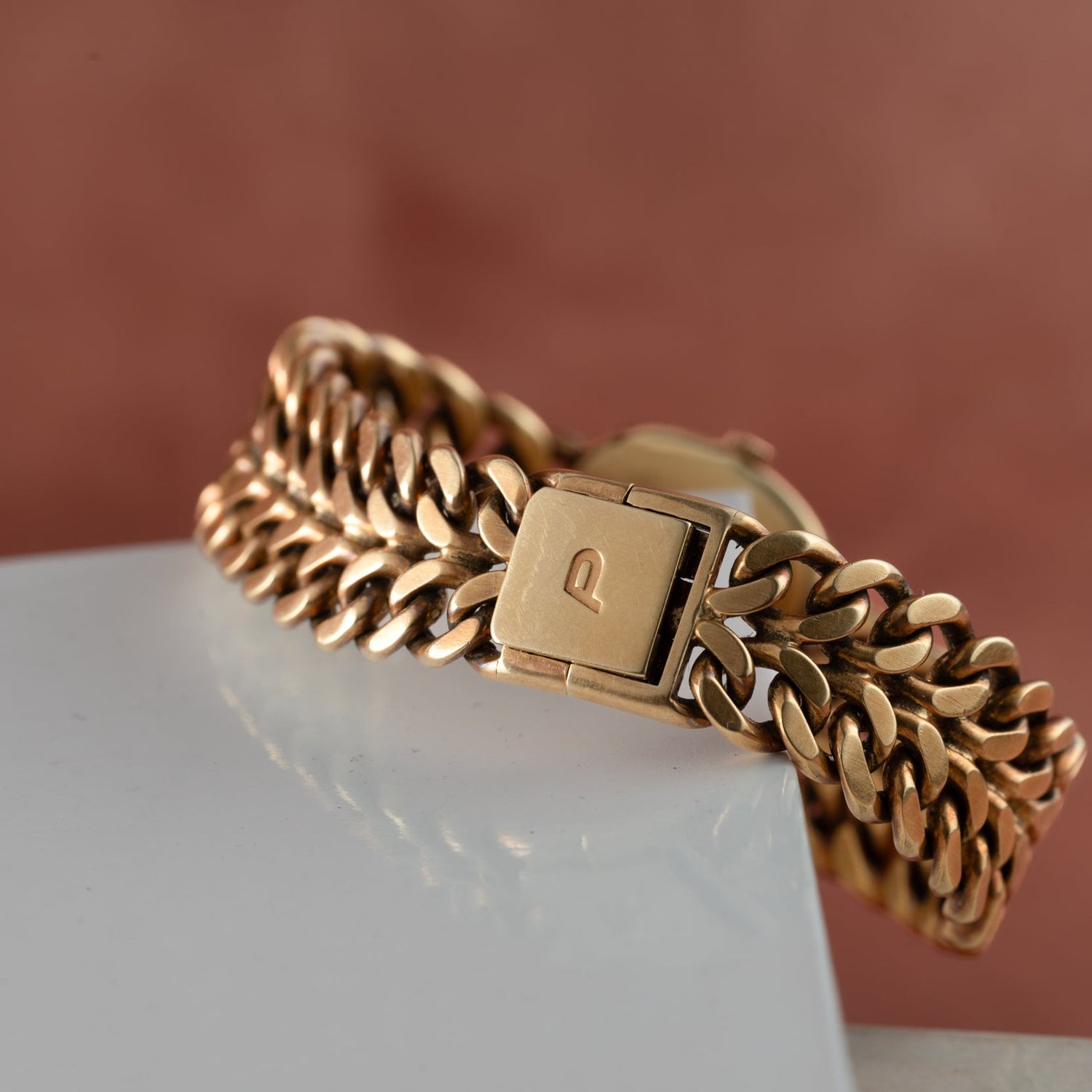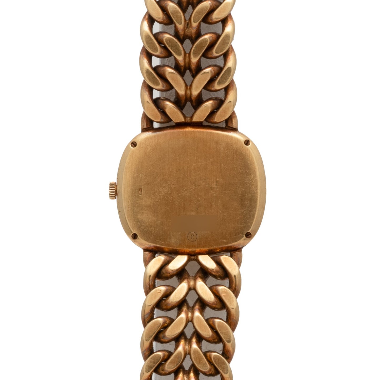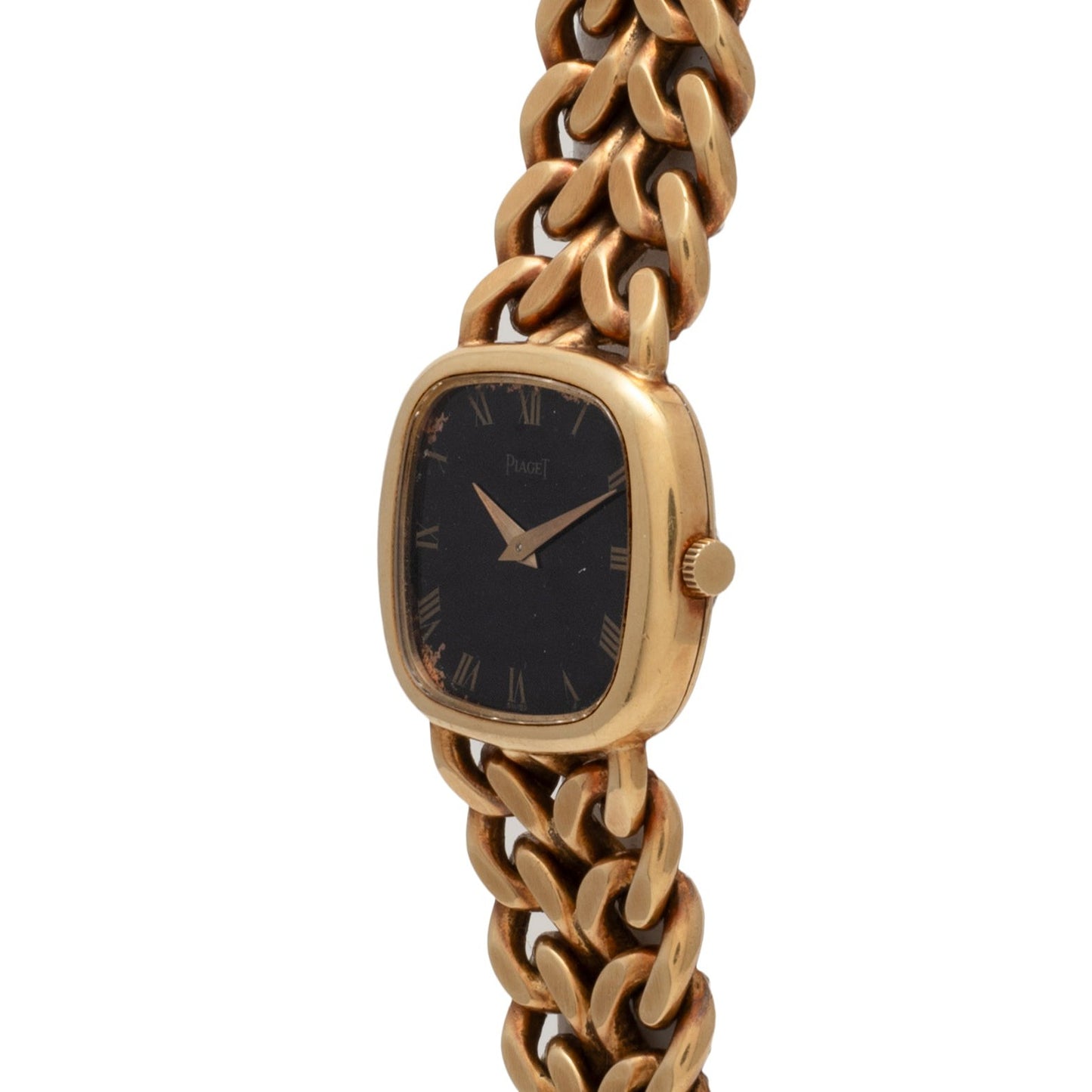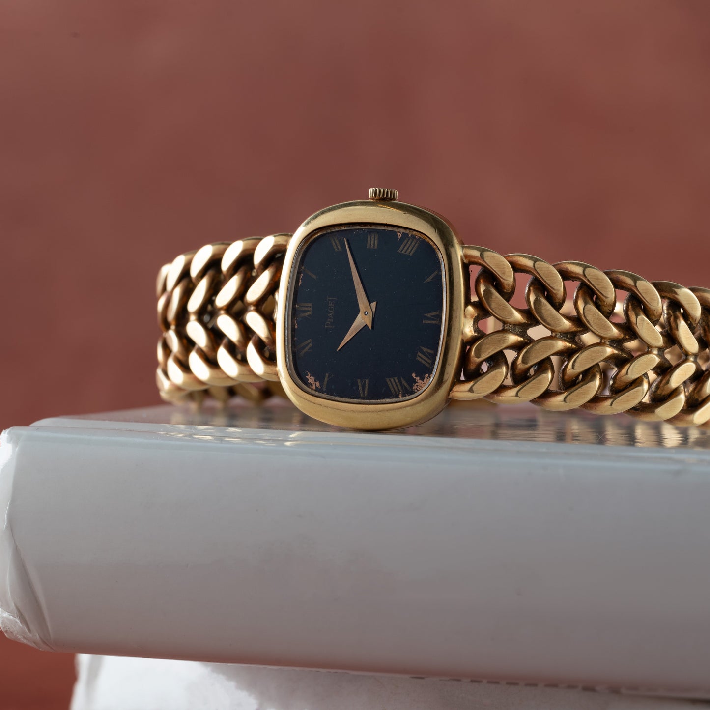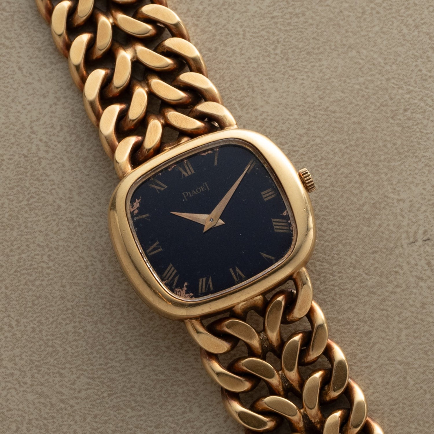 Housed in a 26mm 18Kyellow gold case, this piece features a sapphire crystal; a correct, unsigned crown; and a bold, chain-link integrated bracelet with a signed hook and lock clasp. When it comes to stylized integrated bracelets, no one in the game does it better than Piaget. This bracelet is more substantial — not just in terms of weight in gold, but its personality and presence on the wrist.