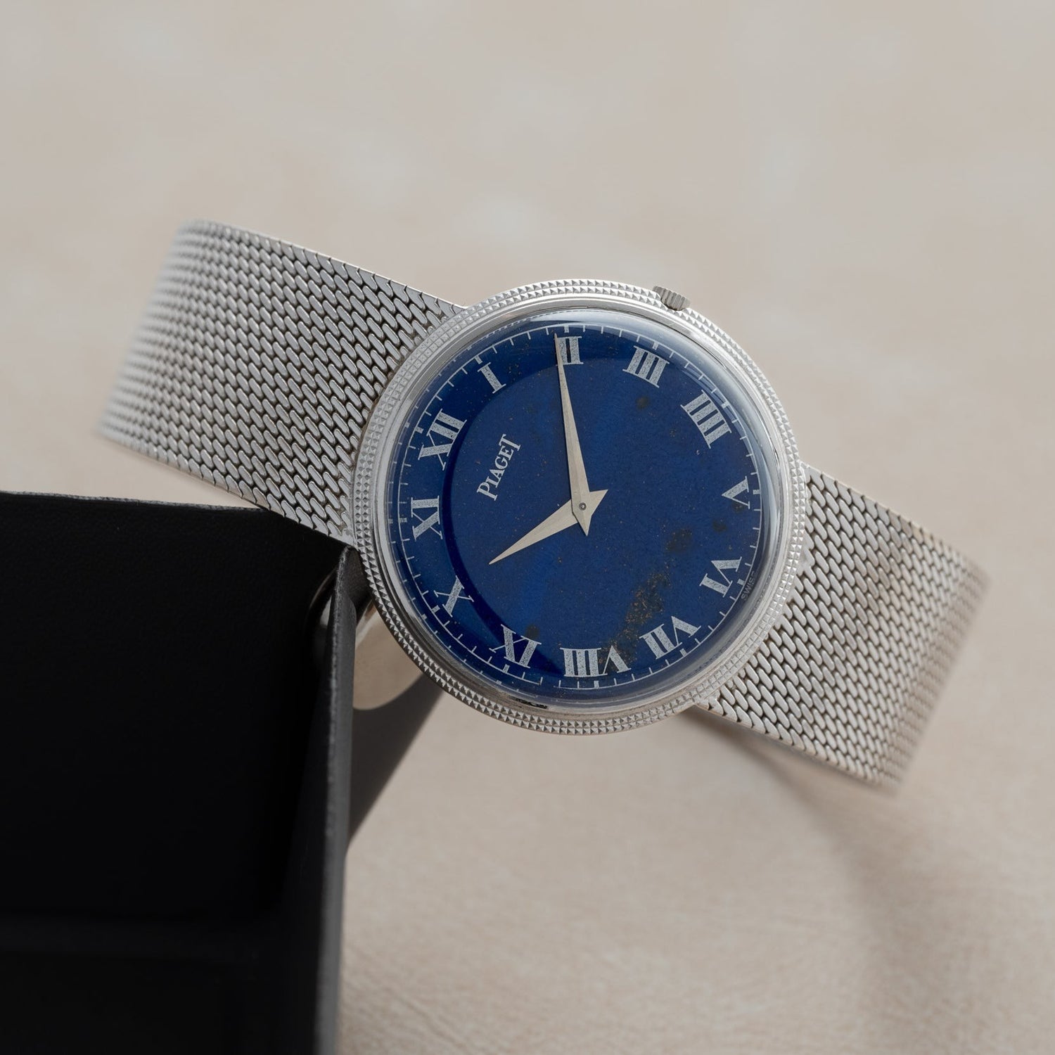 Housed in a 31mm, white gold case with 'hobnail' finishing and a matching integrated white gold 'mesh' bracelet with a signed clasp, this piece features a standout blue 'Lapis Lazuli' stone dial with printed silver 'Roman' numerals, a white gold 'dauphine' handset, a mineral crystal, and a manual winding movement within.