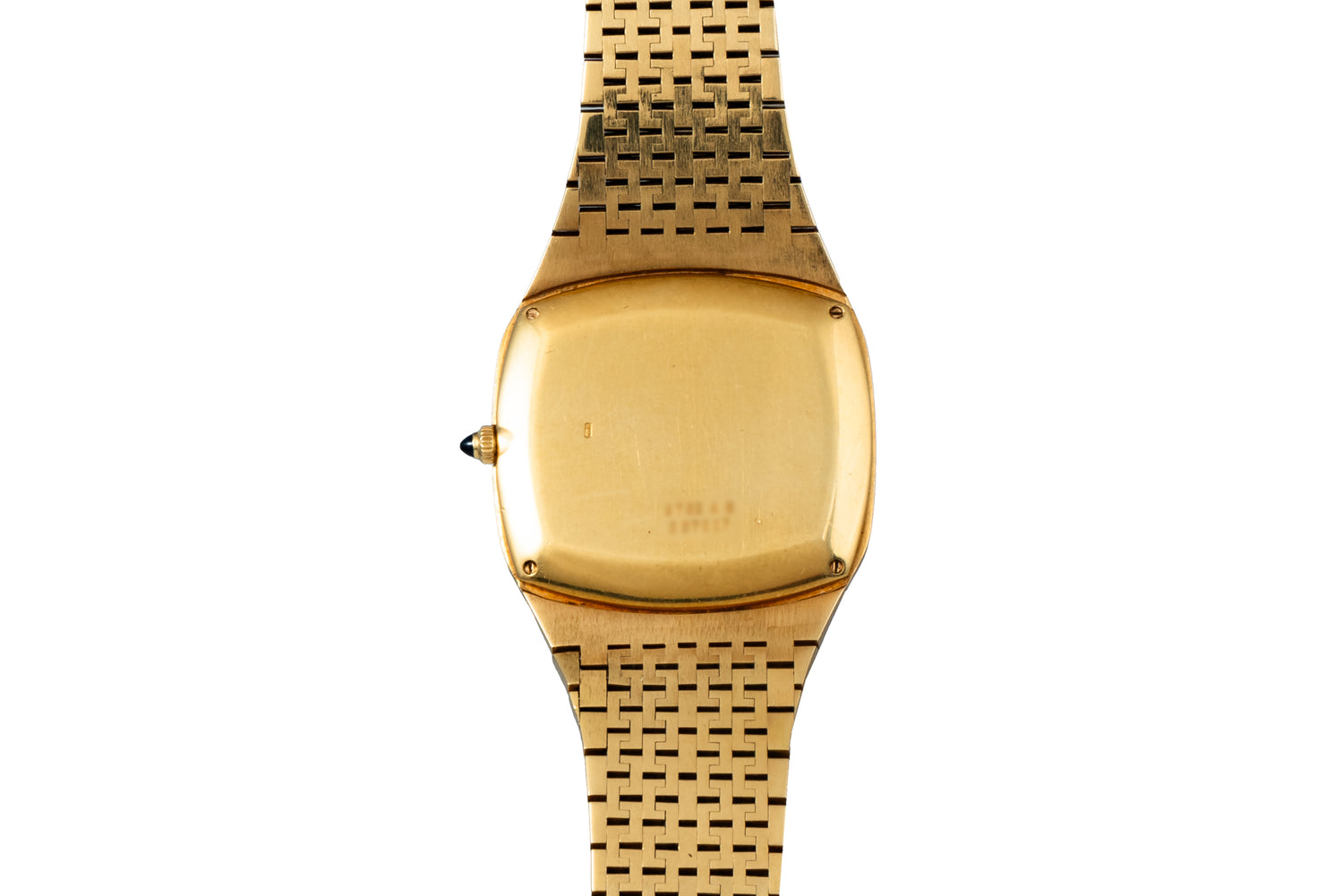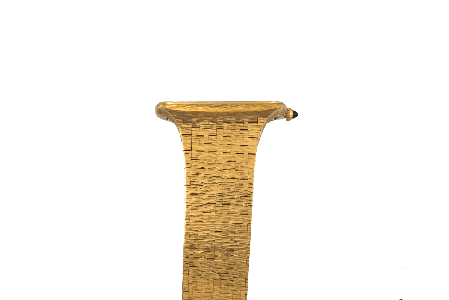 Housed in a 32mm, yellow gold 'tv' case with a stunning 'florentine' finishing throughout and a matching integrated yellow gold bracelet with a signed clasp, this piece features a wildly cool 'obsidian' stone dial with a yellow gold 'dauphine' handset, an 'onyx' cabochon crown, a mineral crystal, and a manual winding movement within.