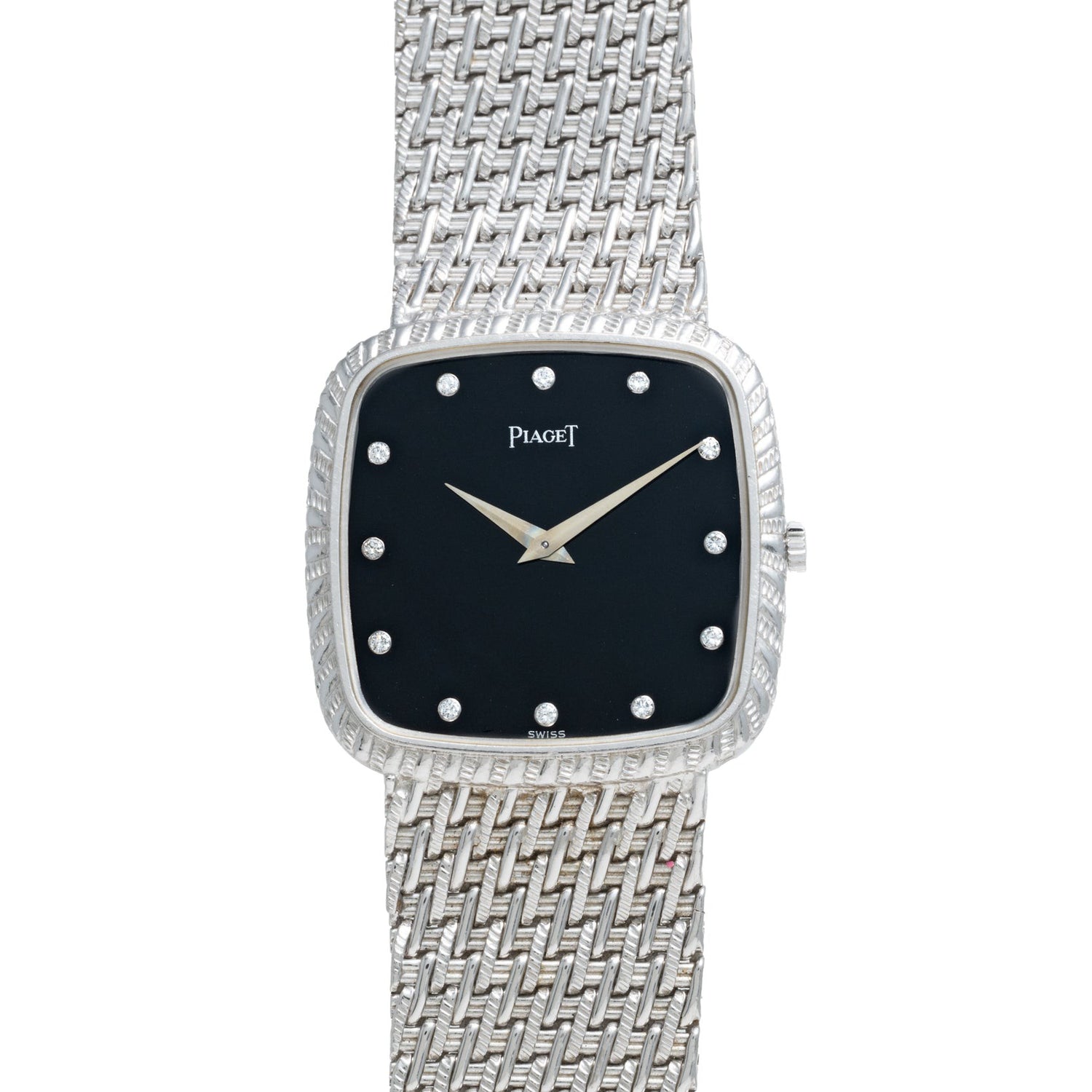 Housed in a 30.5mm 18K white gold case with a hand-finished textured bezel and a fantastic, integrated 'woven' white gold bracelet with a signed hook and lock clasp, this Piaget features a stunning onyx dial with diamond hour markers and matching gold dauphine handset.
