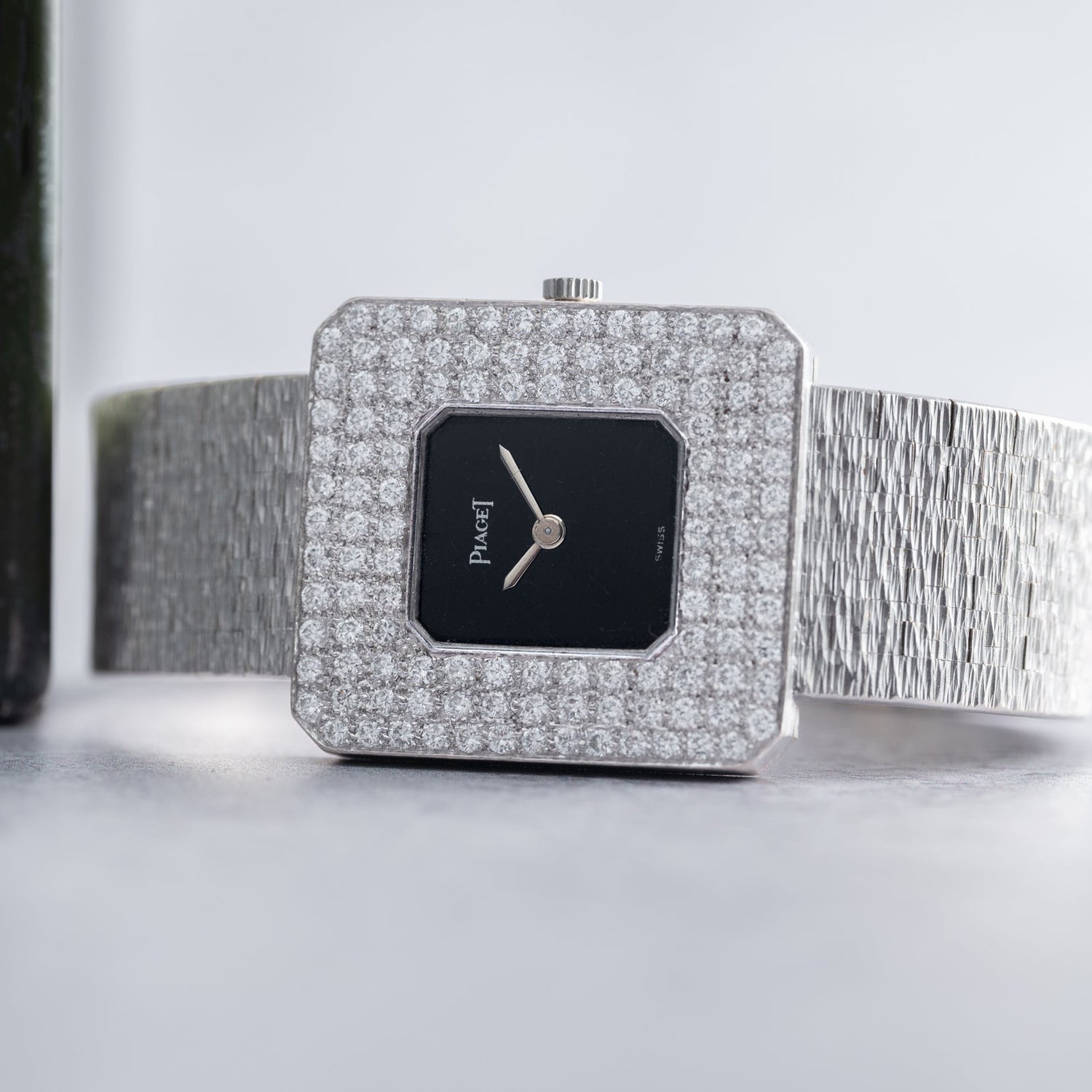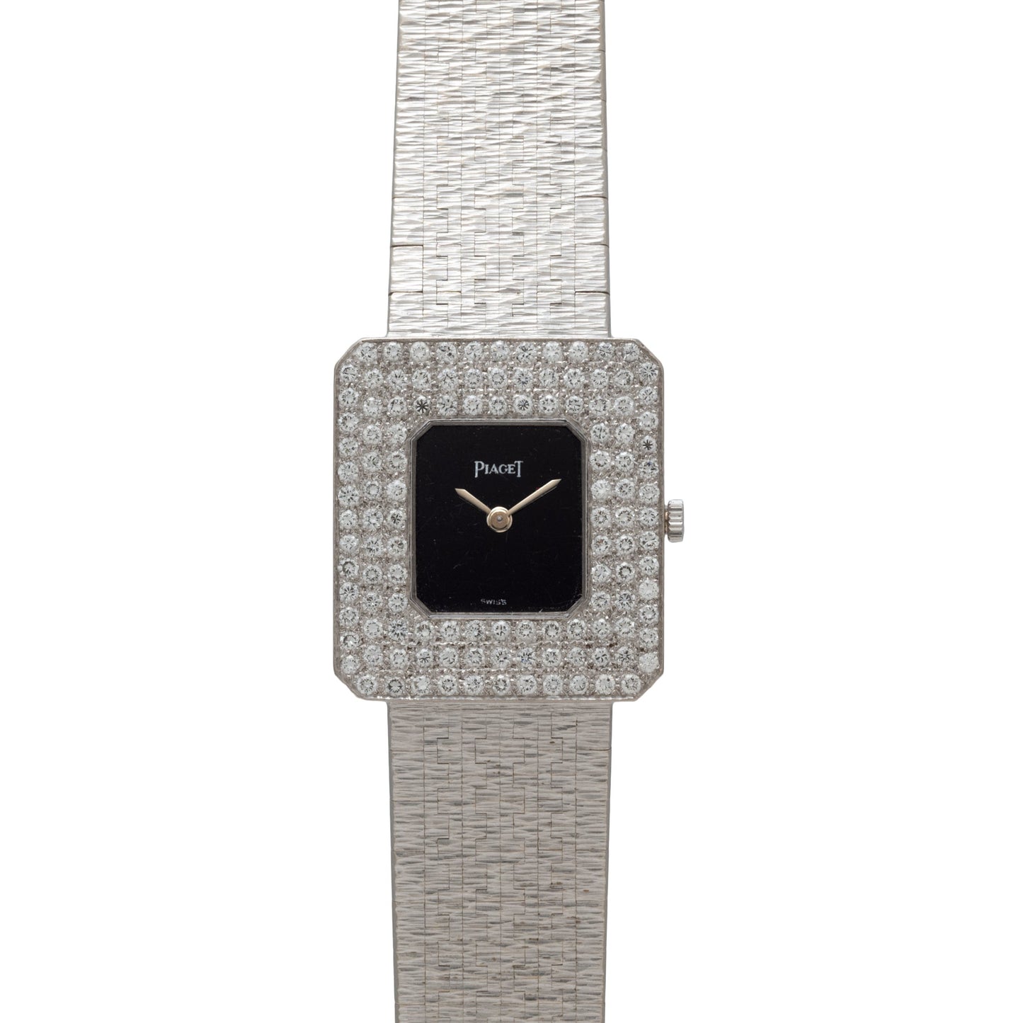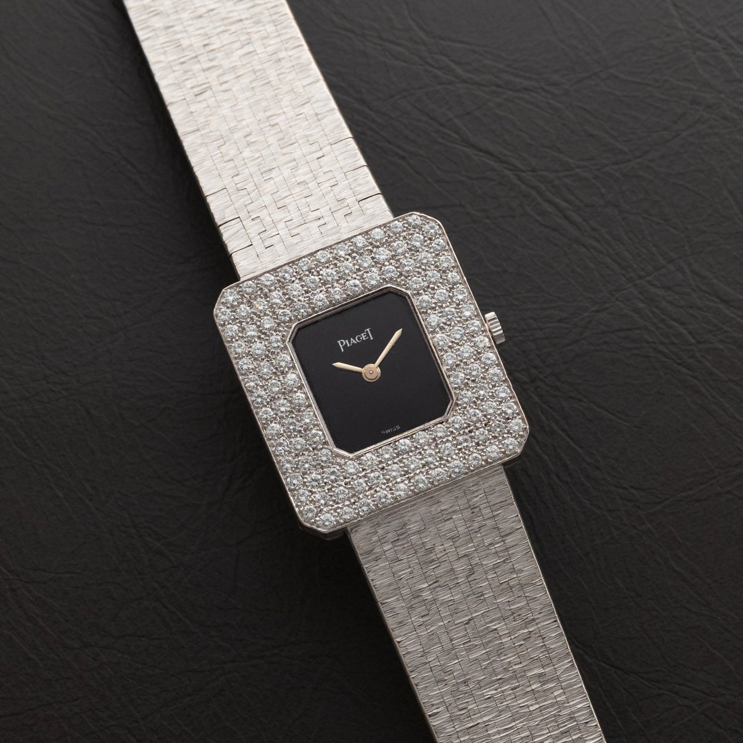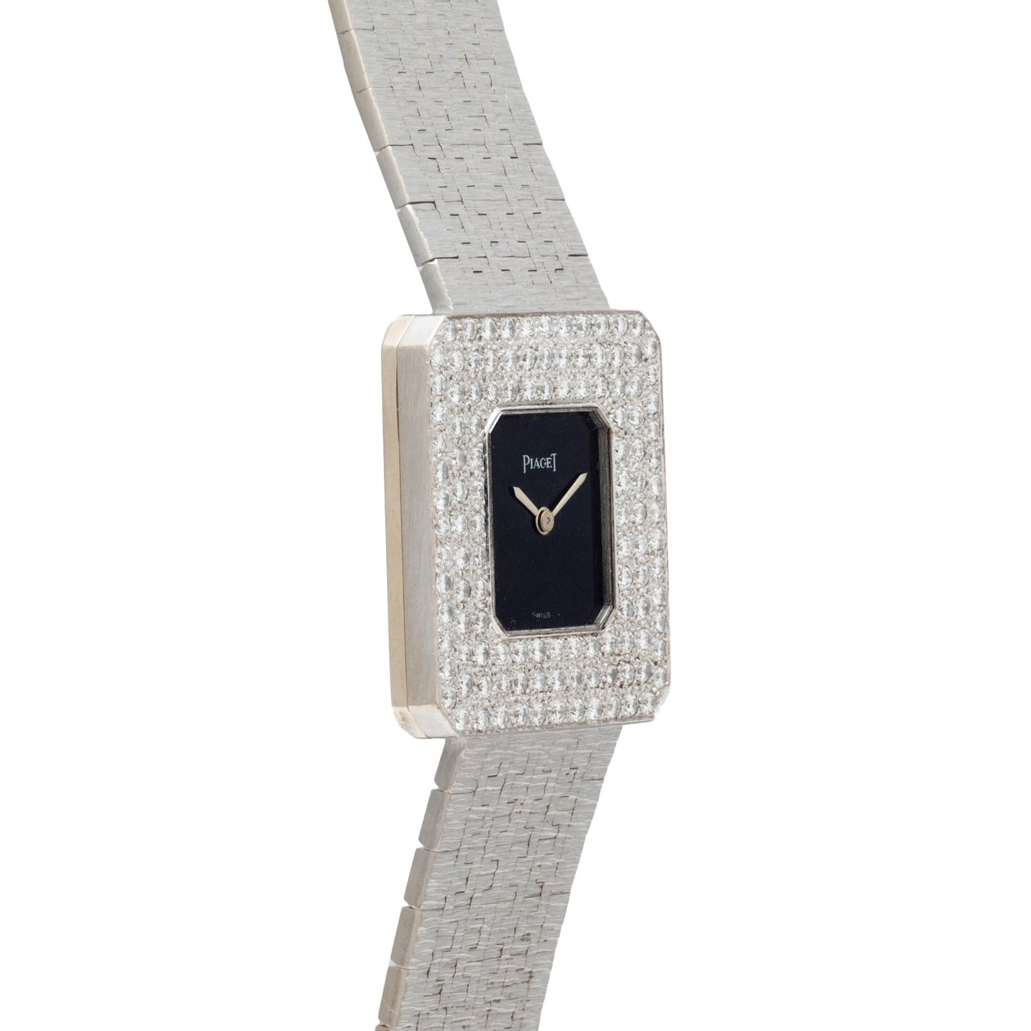 Housed in a 18K white gold case with a fantastic diamond-set bezel and onyx dial, this Piaget possesses a striking presence unlike any other piece. To complement the eye-catching dial and bezel, this watch features a 18K white gold integrated bracelet with 'bark' texturing.
