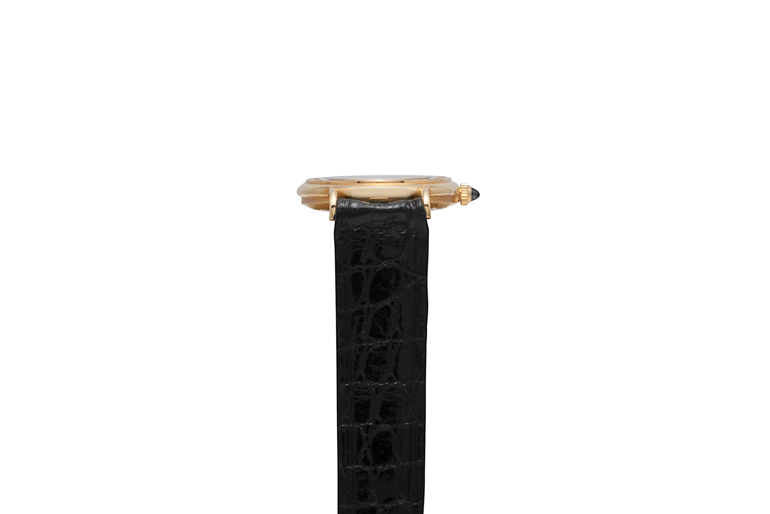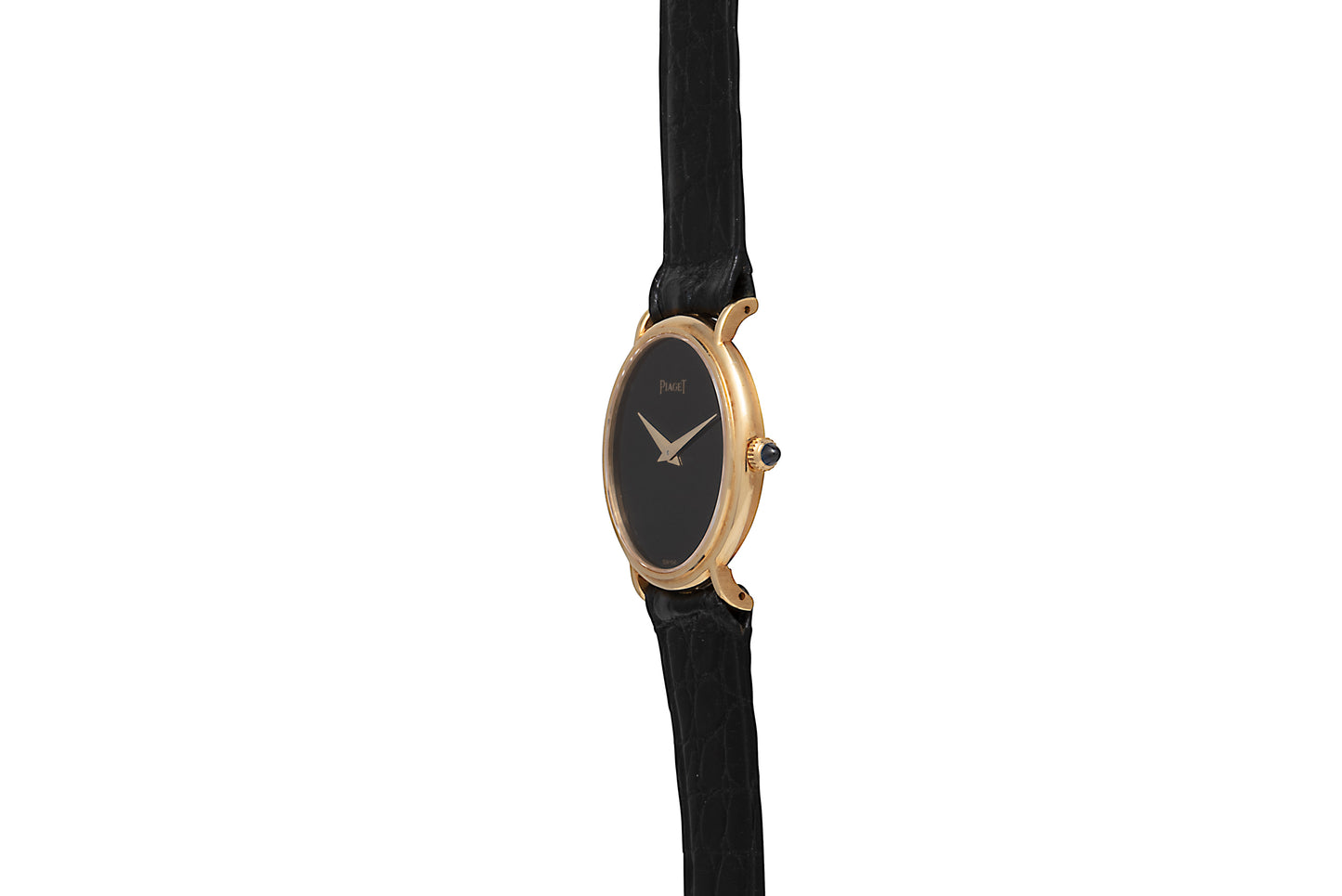 Housed in a 24mm, yellow gold oval case with a mineral crystal, this piece features a deep black Onyx stone dial with a matching 'dauphine' handset, a manual winding movement within, and a signed black crocodile strap with a signed yellow gold pin buckle.
