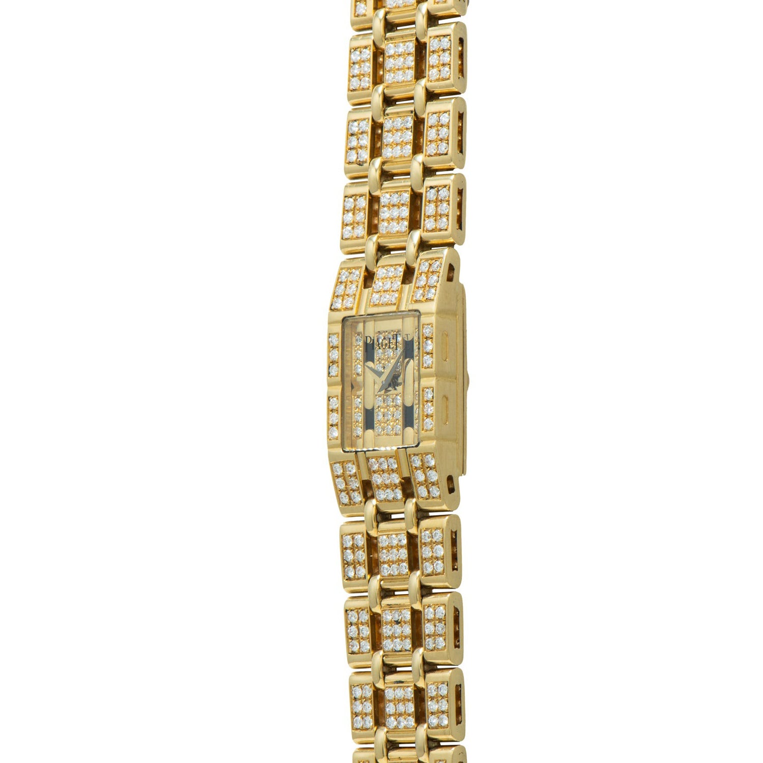 Housed in a 20mm 18K yellow gold case set with diamonds, this piece has an integrated two bracelet with alternating gold and diamond links. This Polo has a diamond and gold two-tone dial with a matching 'dauphine' handset, a sapphire crystal, and an entirely handy quartz movement within. Notably, the pattern of the bracelet seamlessly continues straight through the dial.