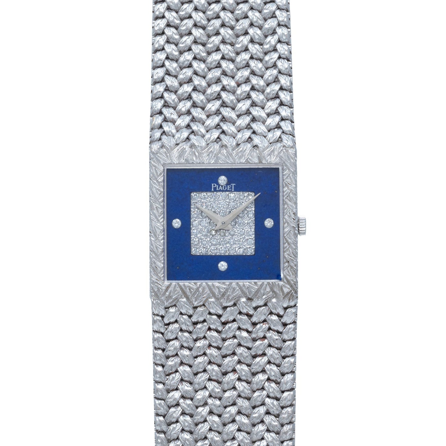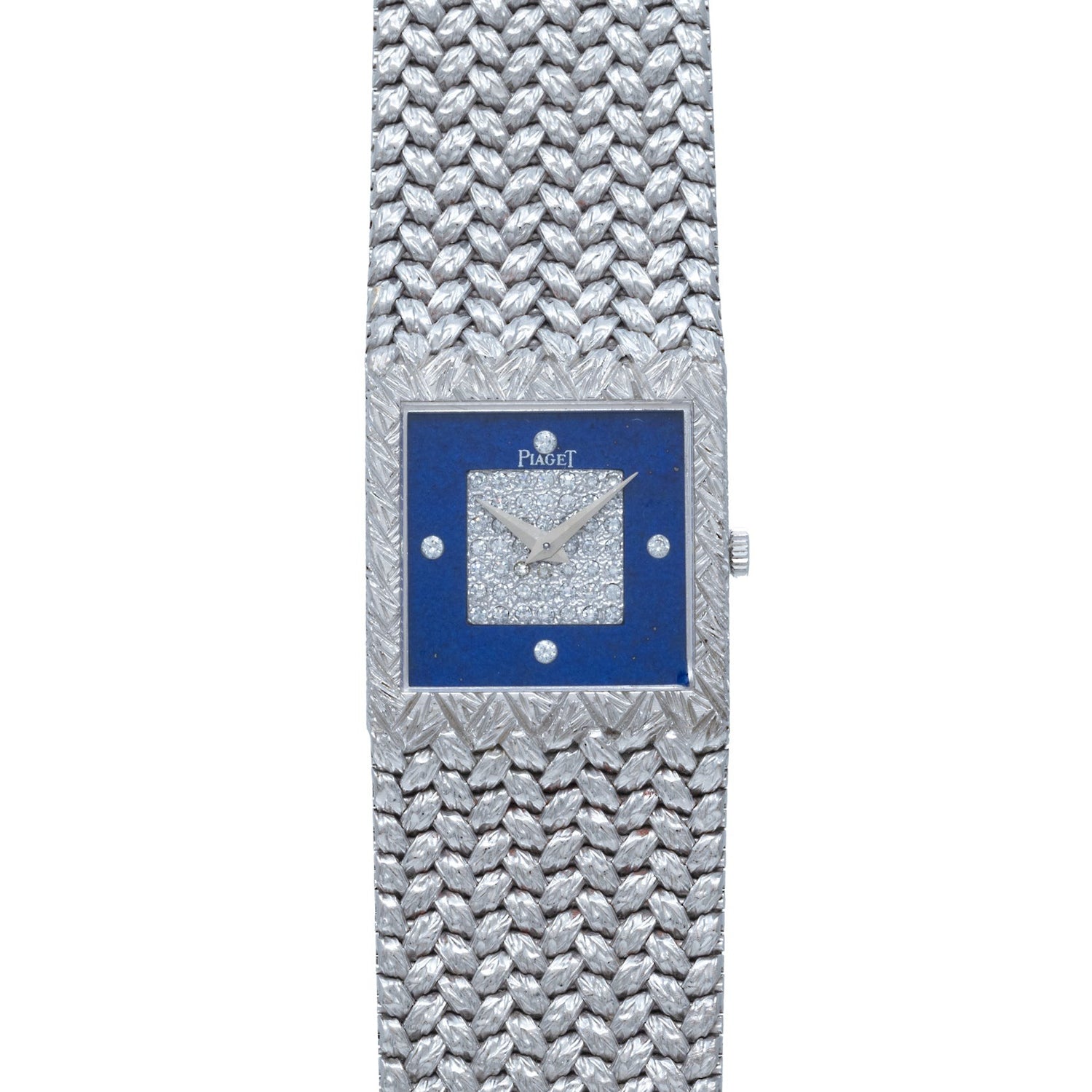 Housed in a 24mm, 18K white gold case with a fantastic, integrated white gold bracelet, this Piaget features a striking lapis lazuli dial with a matching 'dauphine' handset, and Piaget's iconic cal. 9P movement within. This piece features applied diamond quadrant markers and at the center of the dial, applied pave diamonds set into a gold base.