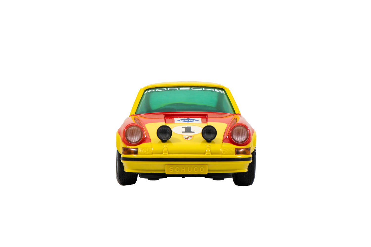 This battery operated Rallye Porsche 911 R produced by Schuco, a legend in the world of toymaking and known for their hand crafted, faithfully reproduced model cars, dates back to the 1960s. Made in Germany, it features the curvaceous 911 silhouette that we know and adore, and an eye-catching red and yellow racing livery. Measuring approximately 10” x 4" x 3", it has more than enough presence to be eye-catching, but is equally subtle, seamlessly fitting into any display space.