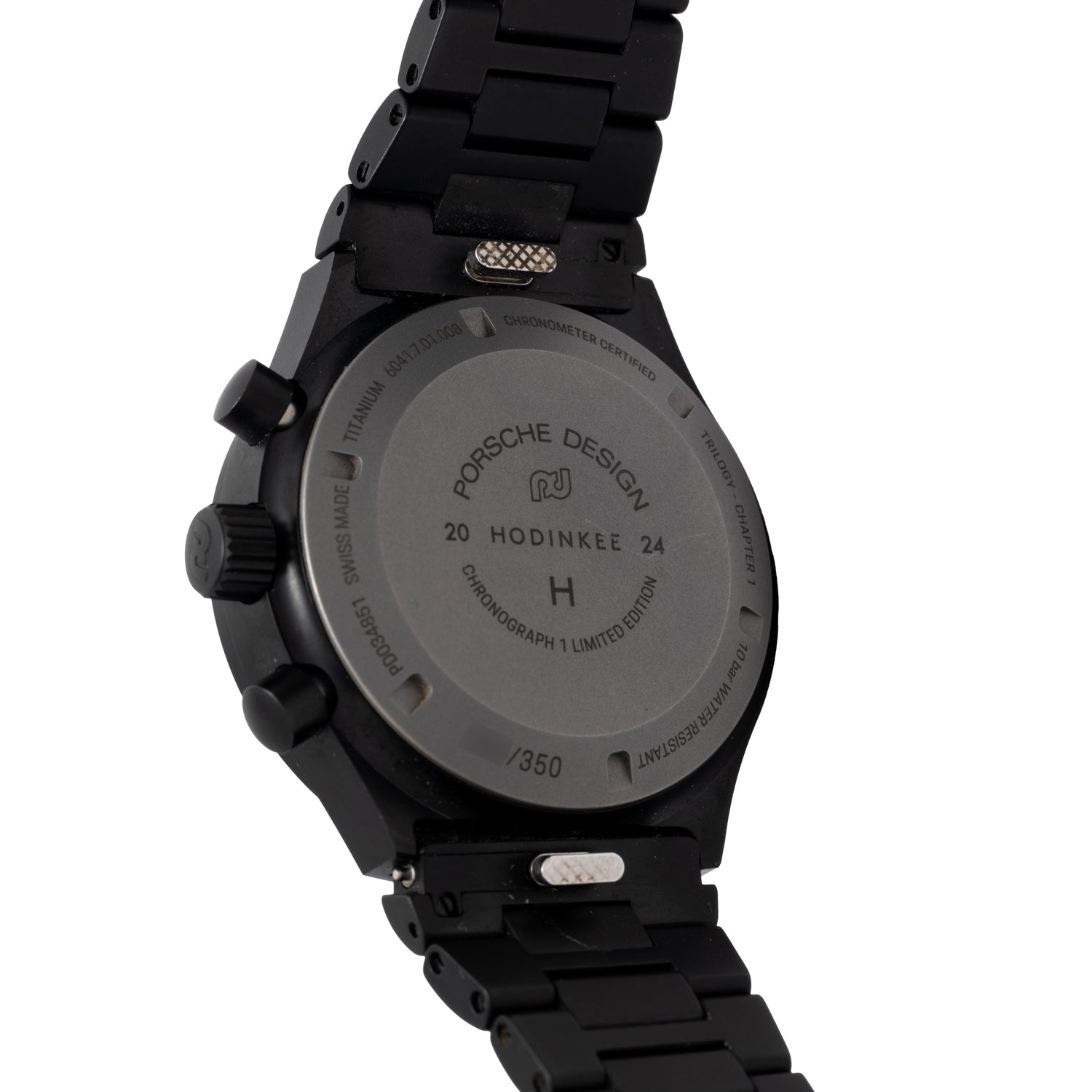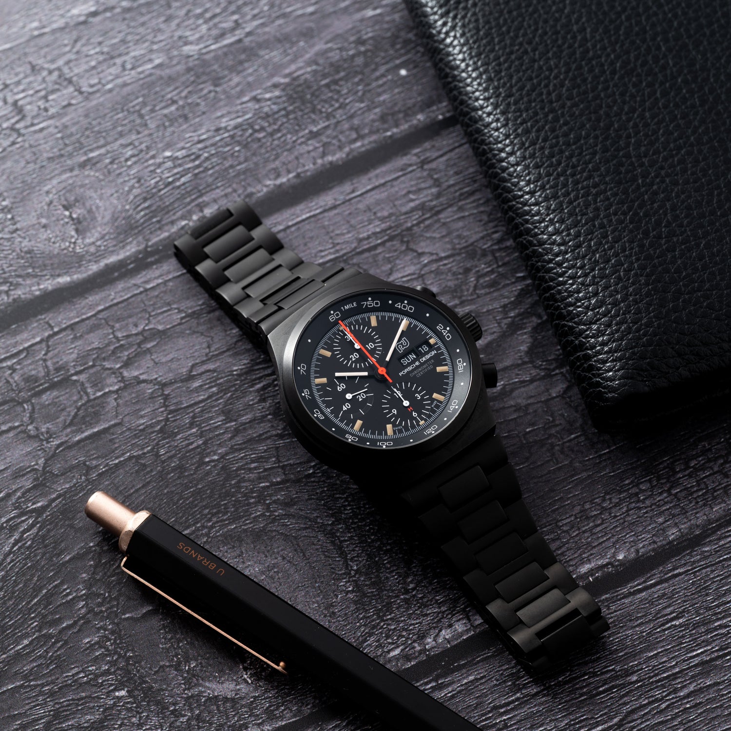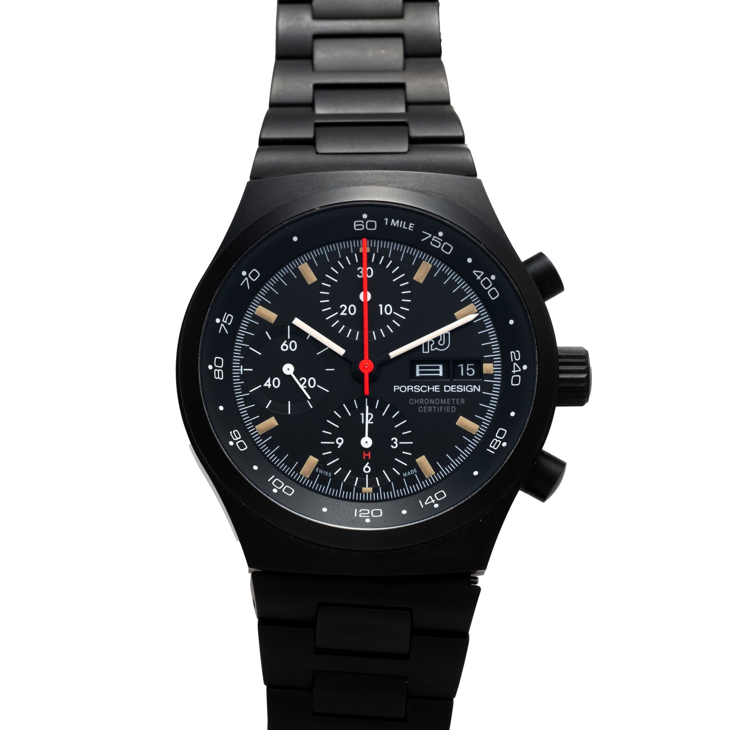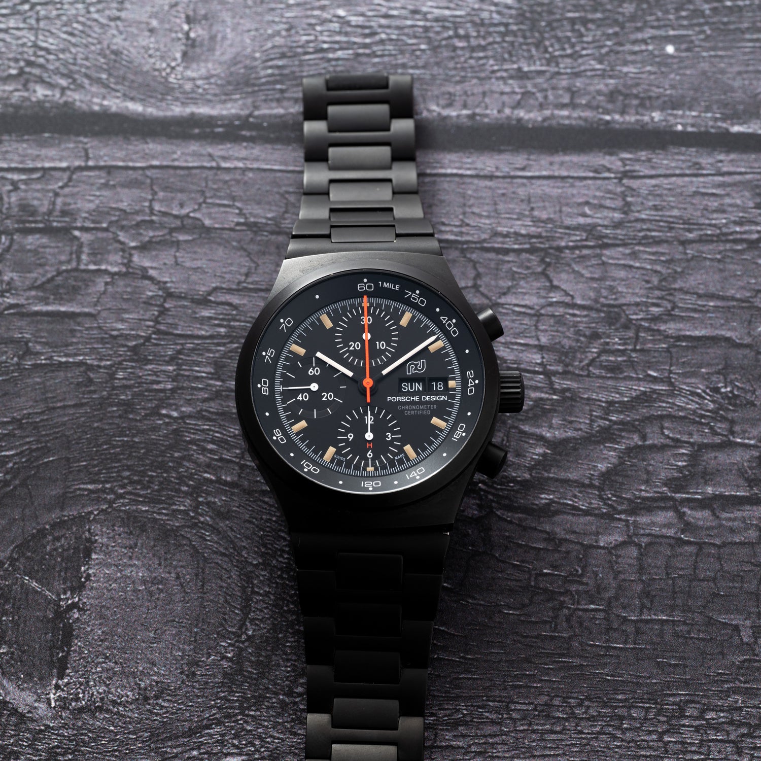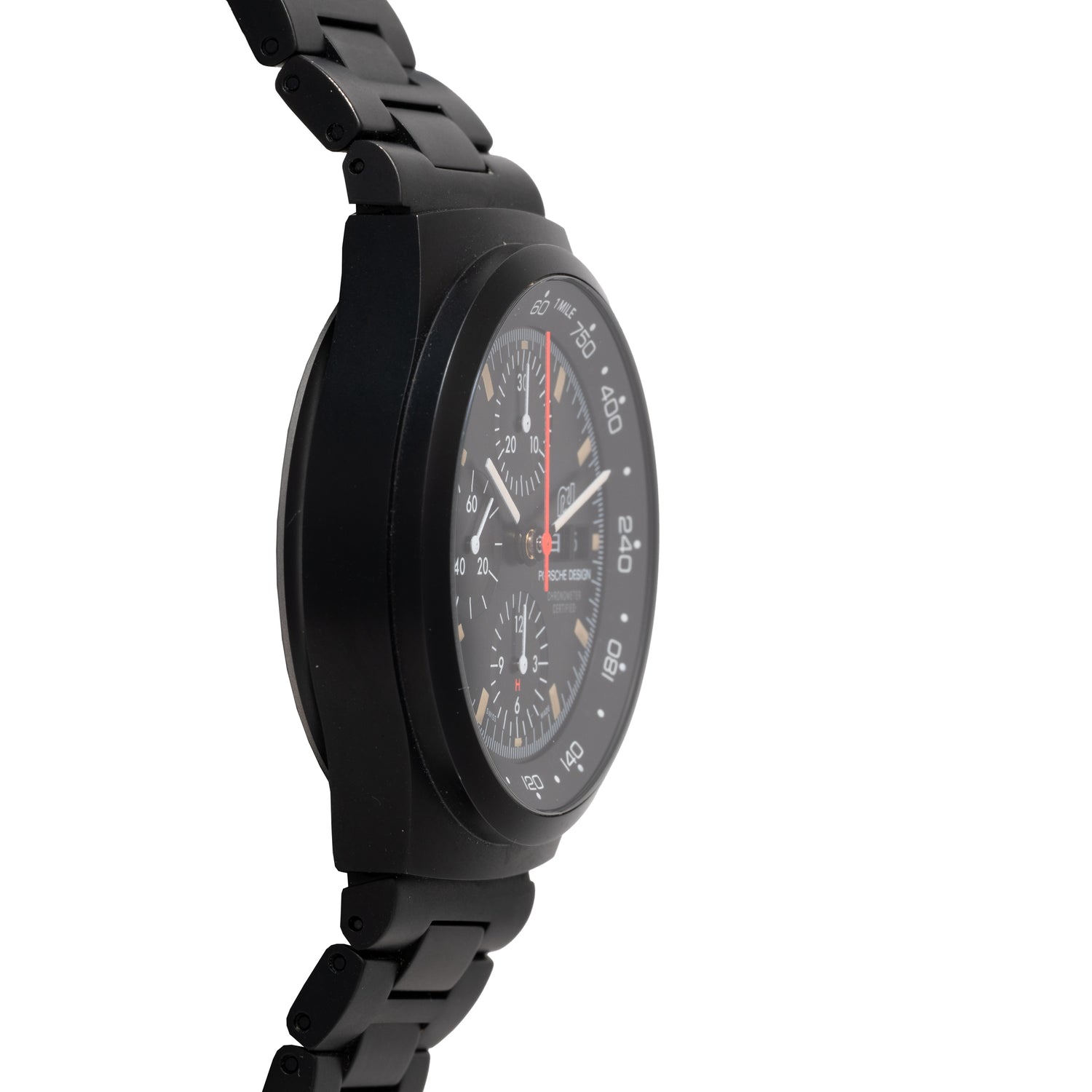 This particular Porsche Design Chronograph is a modern reproduction, housed in a 41mm black titanium carbide, tonneau-shaped case with a signed crown, a sapphire crystal, dual barrel pushers, and a smooth bezel. It features a matte black dial with an inner mile scale bezel, luminous indices, a matching, modified ‘sword’ handset, a triple-register chronograph, and a day-date display. Paired to a matching, titanium carbide bracelet with a signed blade clasp, it’s powered by the Porsche Design WERK 0L140, COSC Certified caliber, perhaps one of the most significant and interesting automatic chronograph calibers ever developed.