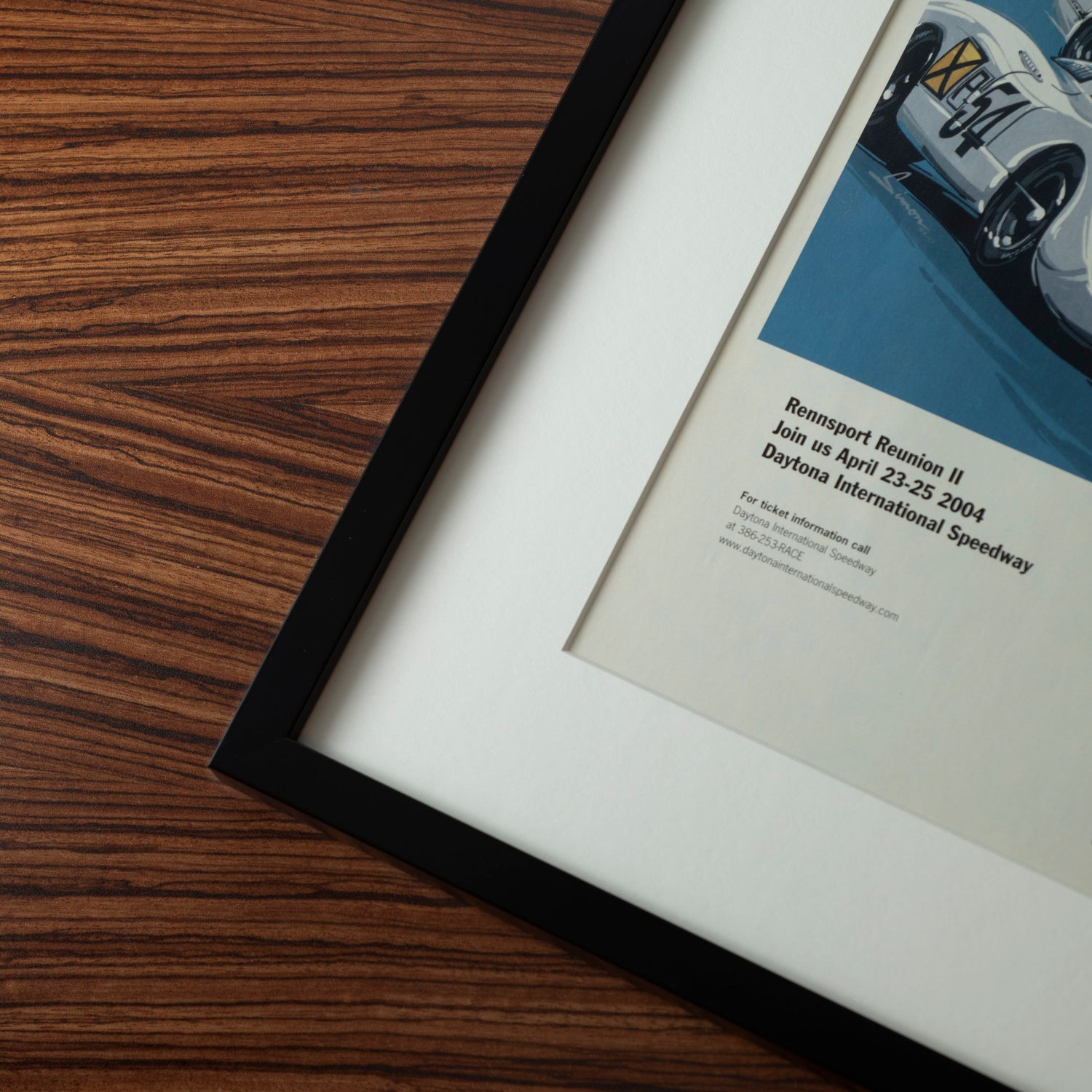 This ad beautifully displays a trio of Porsche track cars and an invitation in bold lettering to attend the second-ever Rennsport Reunion at the Daytona International Speedway.