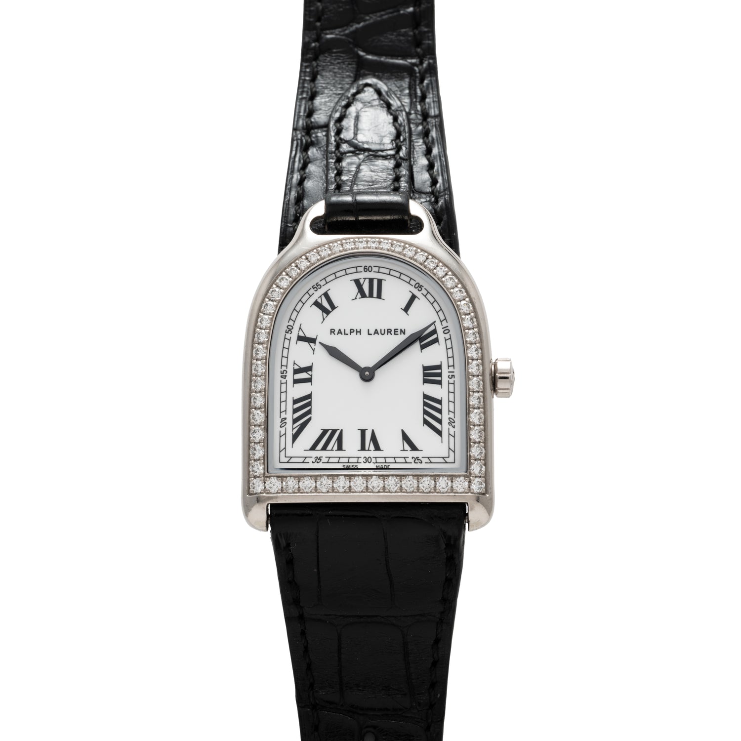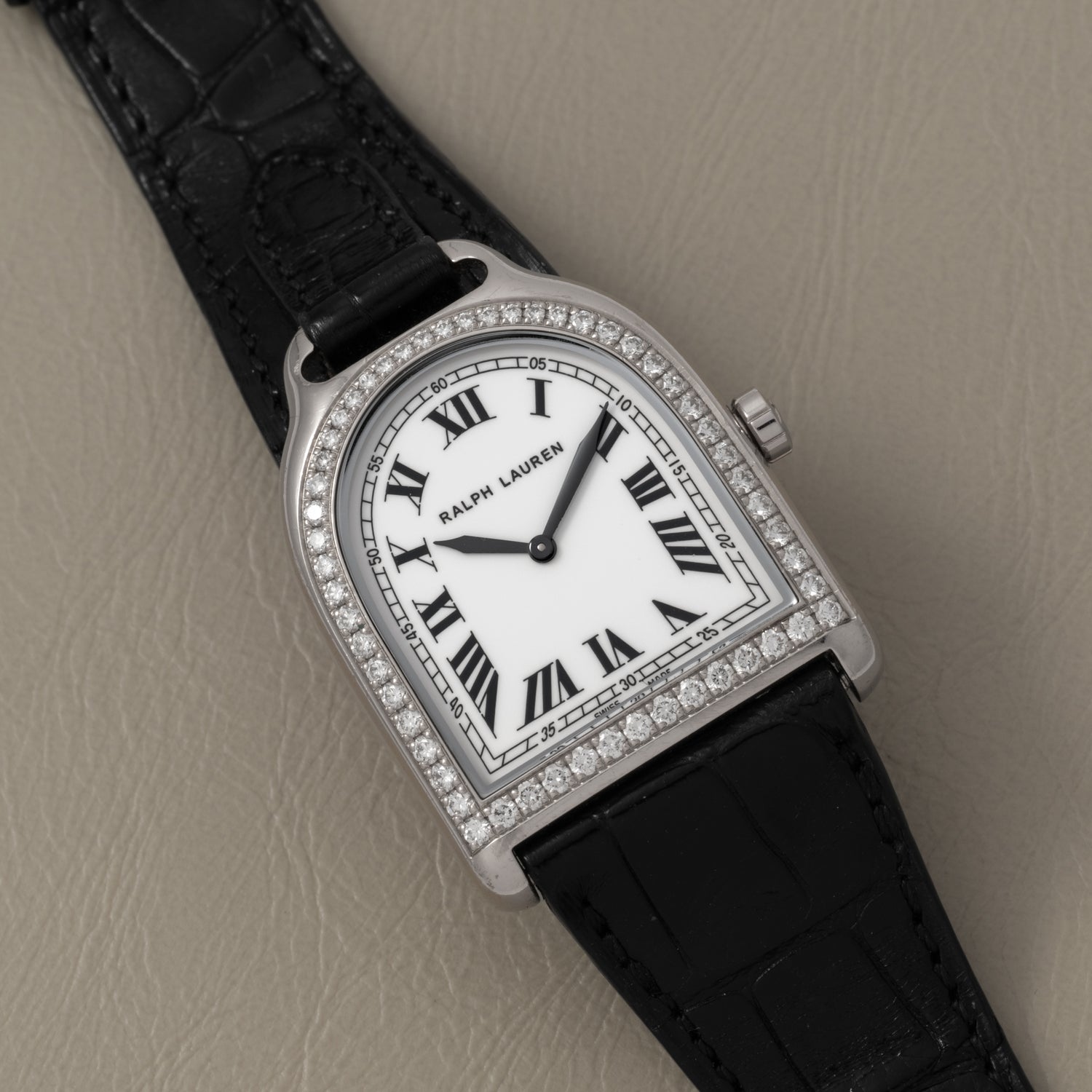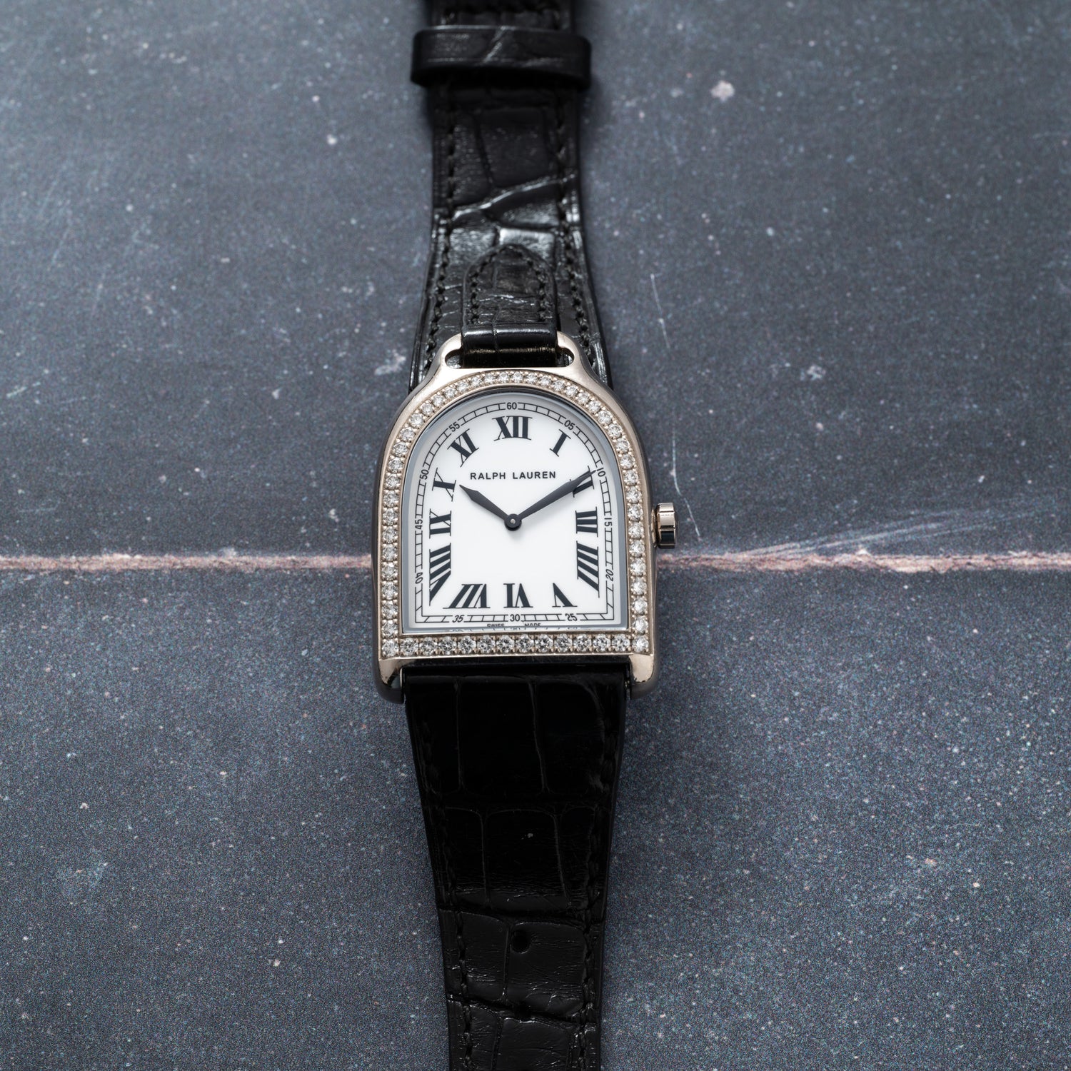 The particular Ralph Lauren watch we have here, a Stirrup, combines Lauren's love for all things equestrian with his appreciation for classic dress watch design. Measuring 28mm in white gold, its stirrup-shaped case features a gorgeous diamond-set bezel, a flat cabochon crown, and a sapphire crystal. Its handsome white dial, meanwhile, boasts an outer 'railroad' minute track, black 'Roman' numerals, and an black 'sword' handset.