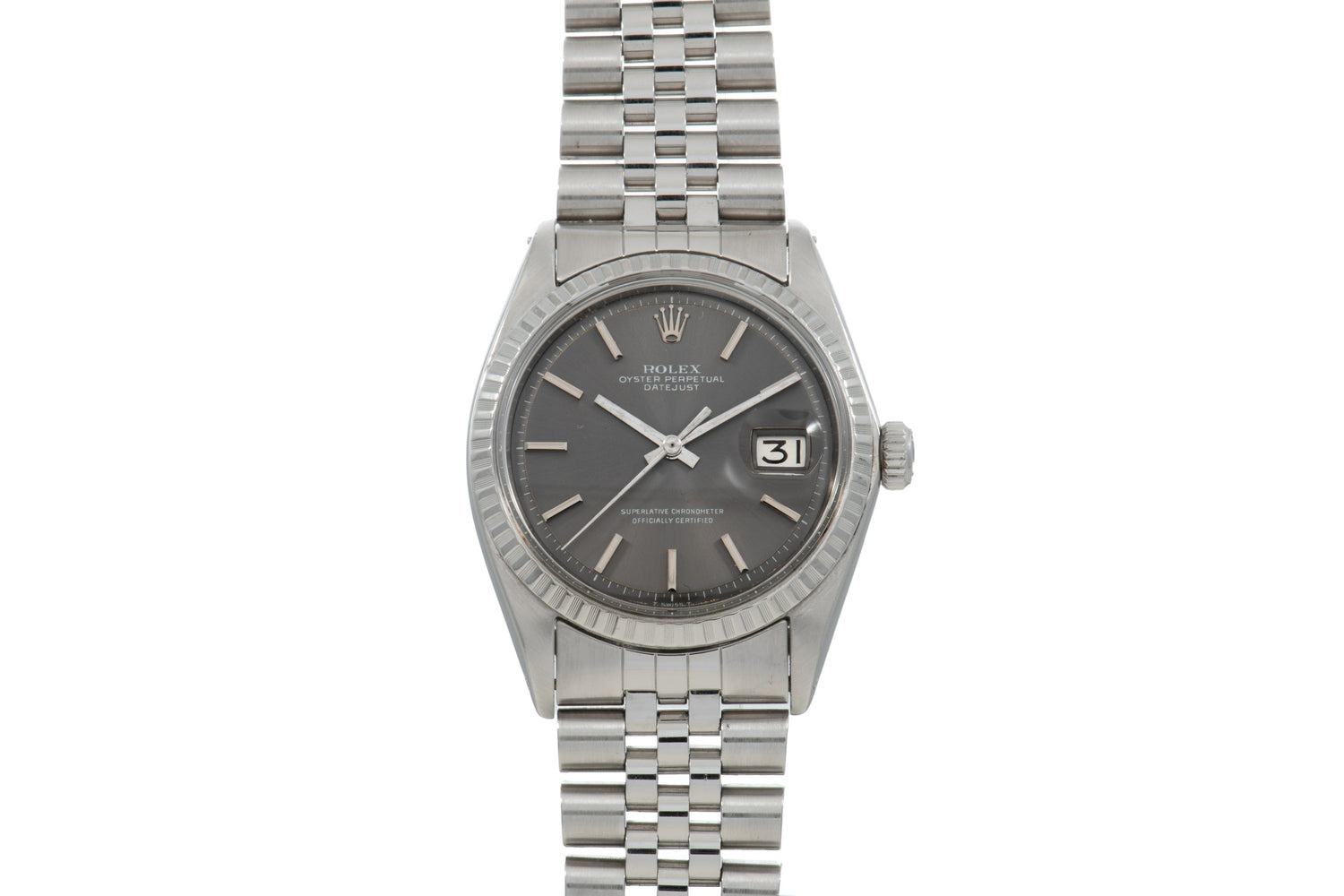 This particular example, a Reference 1603, dates to circa 1968 and features a not all that often seen — non-luminous sunburst grey dial with applied indices, a matching handset, an engine-turned stainless steel bezel, and a stainless steel Jubilee bracelet with a signed blade clasp.