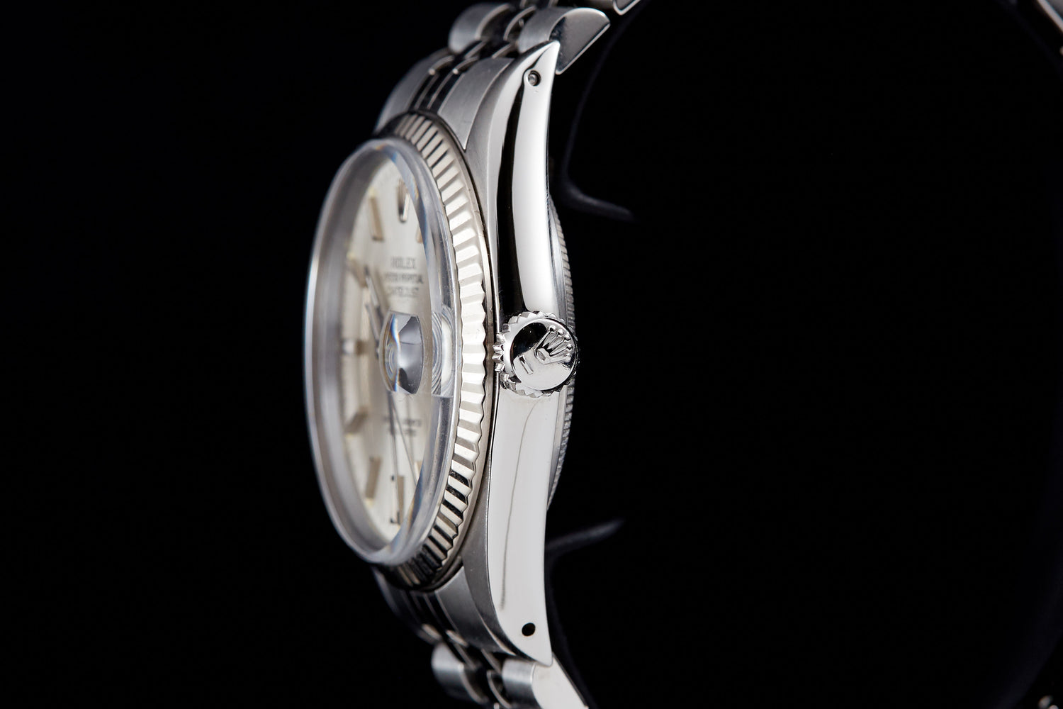 This particular Datejust, Ref. 16014, dates from approximately 1985 and features a classic 36mm Oyster case, silver sunburst dial and a crisp white gold fluted bezel. It also comes with Tritium luminescent material and a quickset date feature making it a perfect neo-vintage model combining vintage looks and modern functionality.