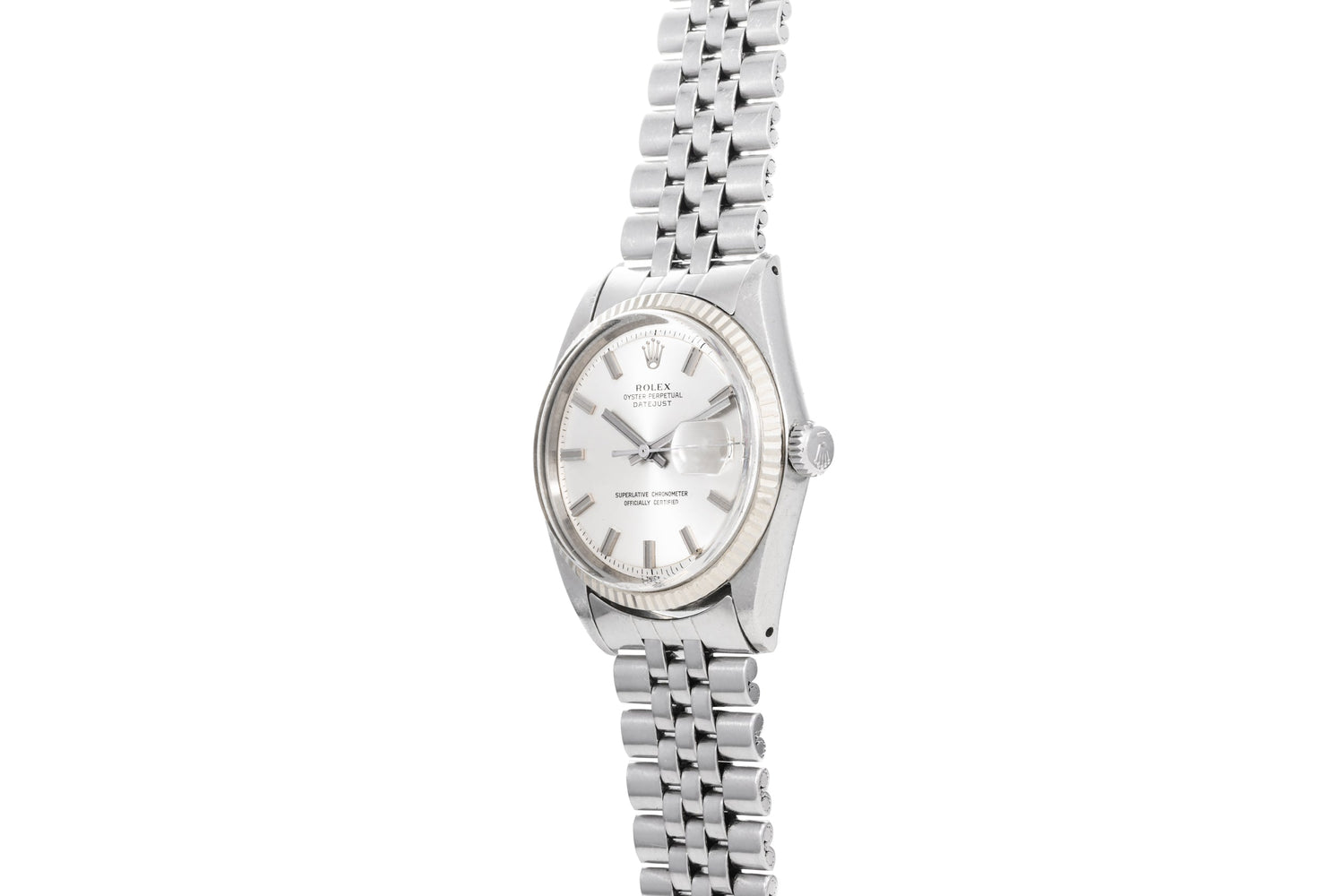 This particular timepiece, a Reference 1601, dates to circa 1971 and features a lovely, non-luminous sunburst silver dial with applied 'wide boy' indices with a matching handset, a fluted white gold bezel, and a folded link Jubilee bracelet with signed blade clasp.