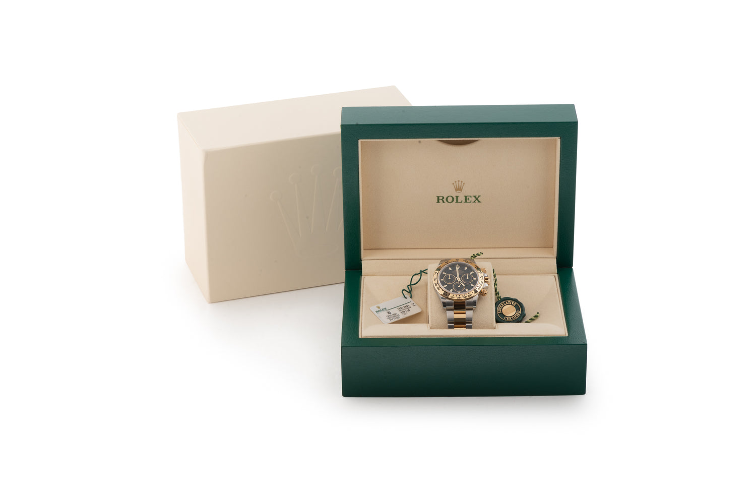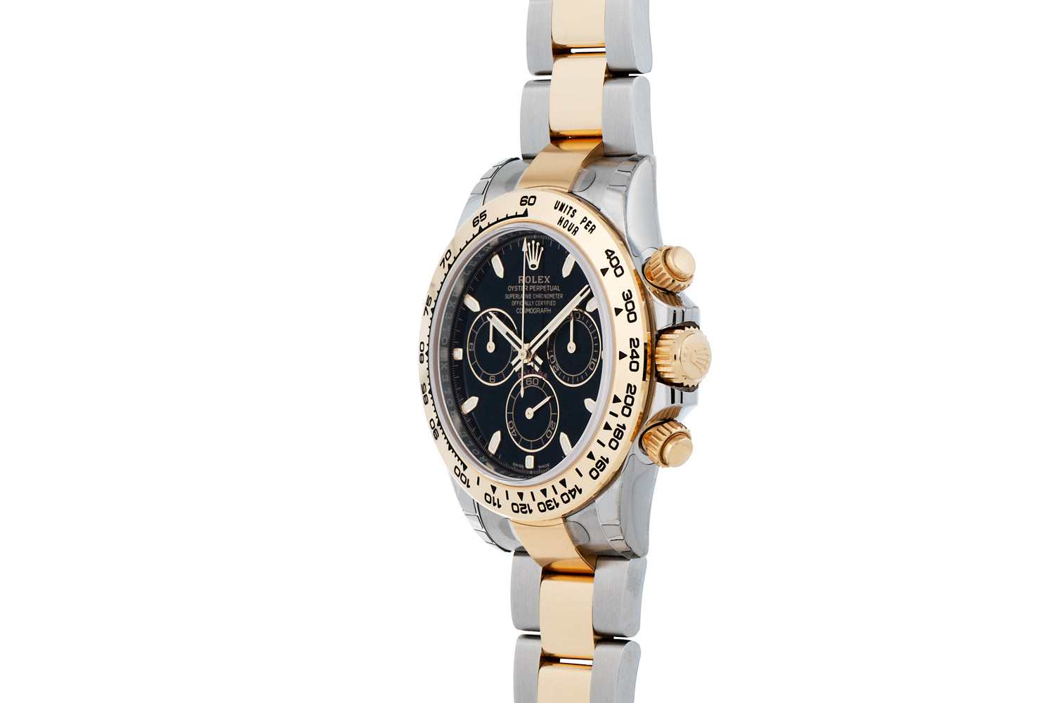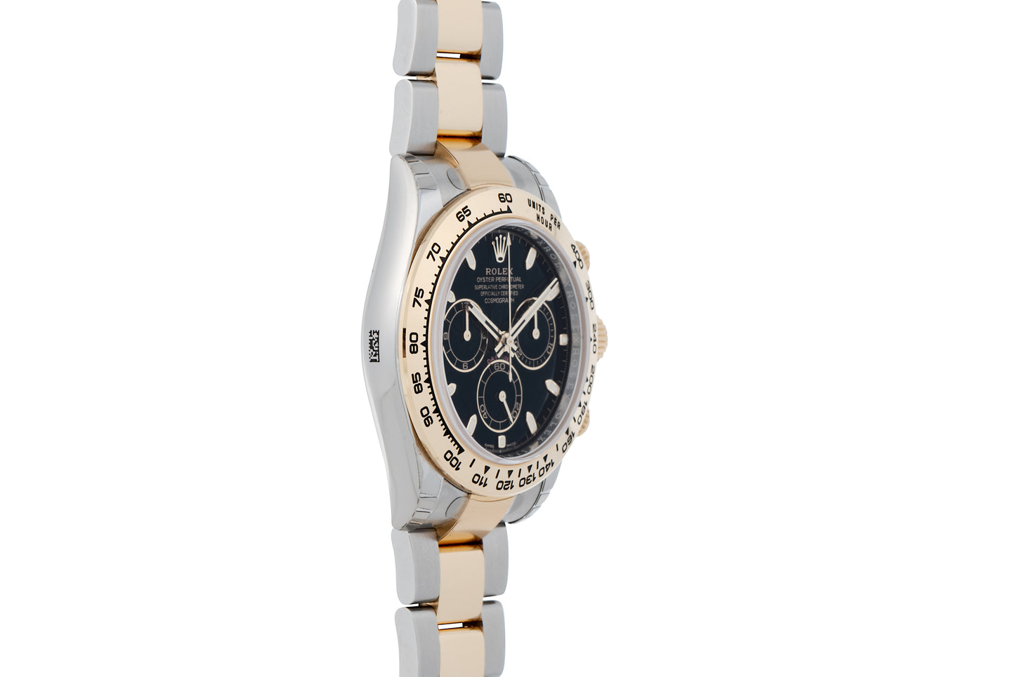 This particular example, a Reference 116503, features a two-tone 18K yellow gold and steel construction with a sapphire crystal, a deep glossy black luminous dial with gold subsidiary register rings and matching handset, and Rolex's in-house Calibre 4130 automatic-winding chronograph movement.