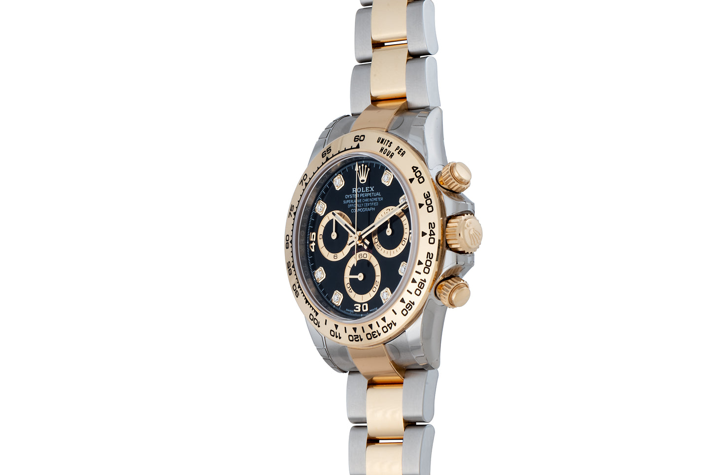 This particular example, a Reference 116503, features a two-tone 18K yellow gold and steel construction with a sapphire crystal, a deep glossy black dial with gold subsidiary register rings and factory applied diamond indices with matching handset, and Rolex's in-house Calibre 4130 automatic-winding chronograph movement.