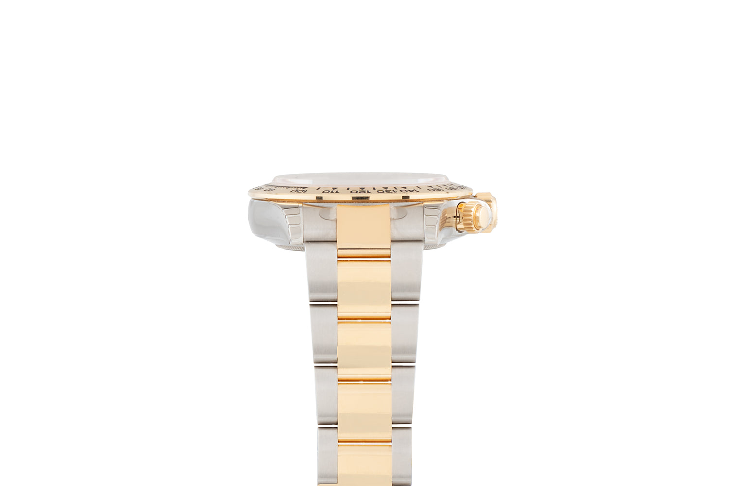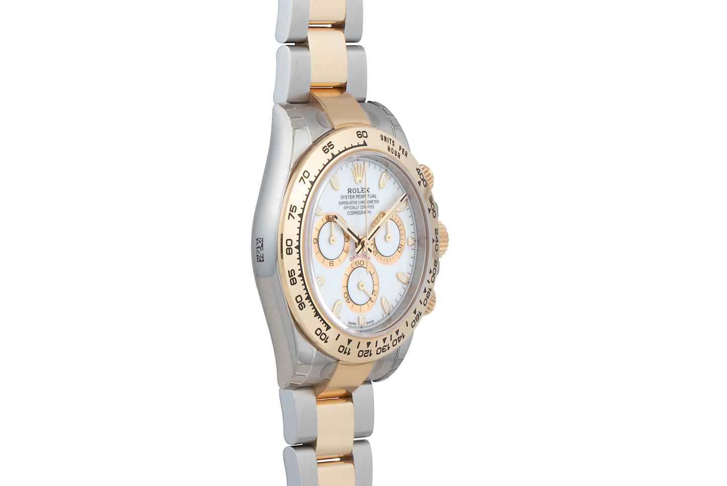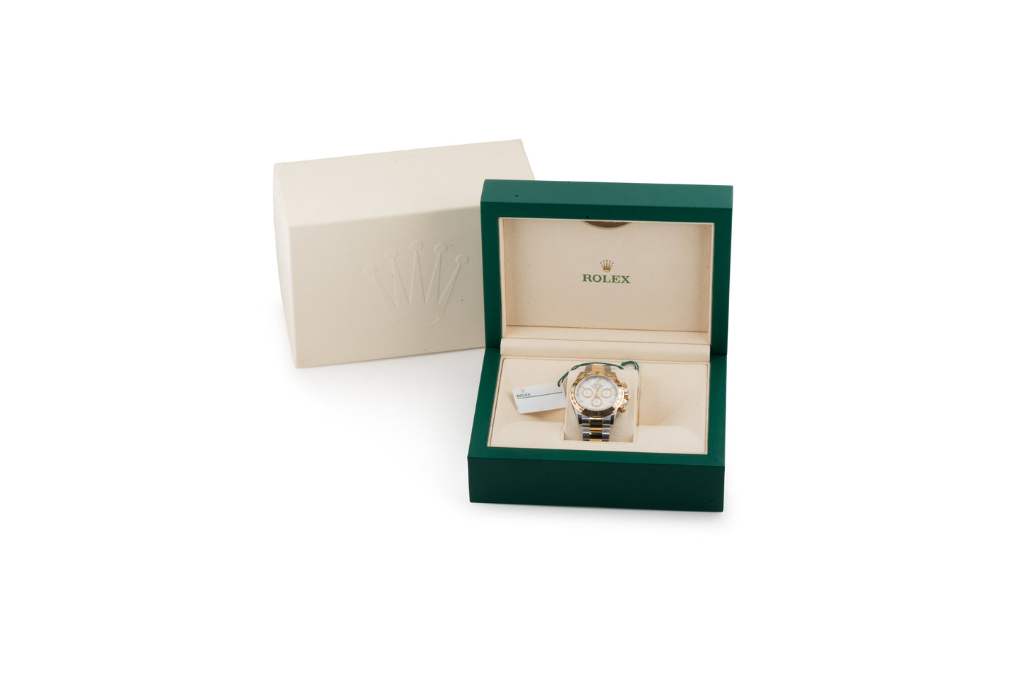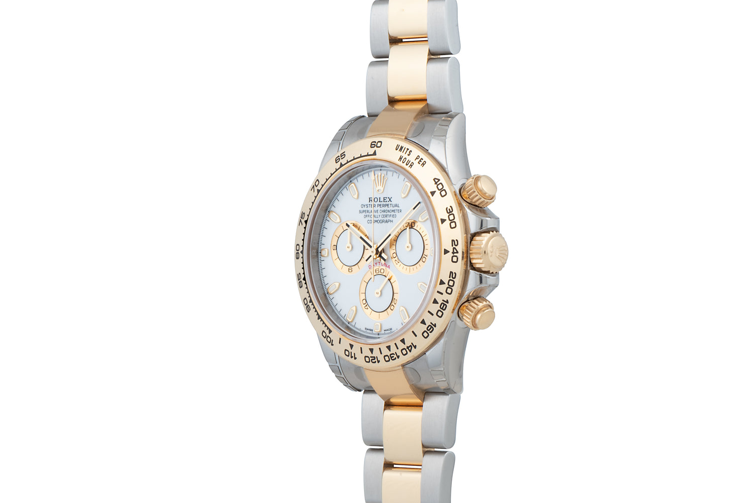 This particular example, a Reference 116503, dates to circa the 2010s and features a two-tone 18K yellow gold and steel construction with a sapphire crystal, a crisp, white dial with gold subsidiary register rings and matching handset, and Rolex's in-house Calibre 4130 automatic-winding chronograph movement.