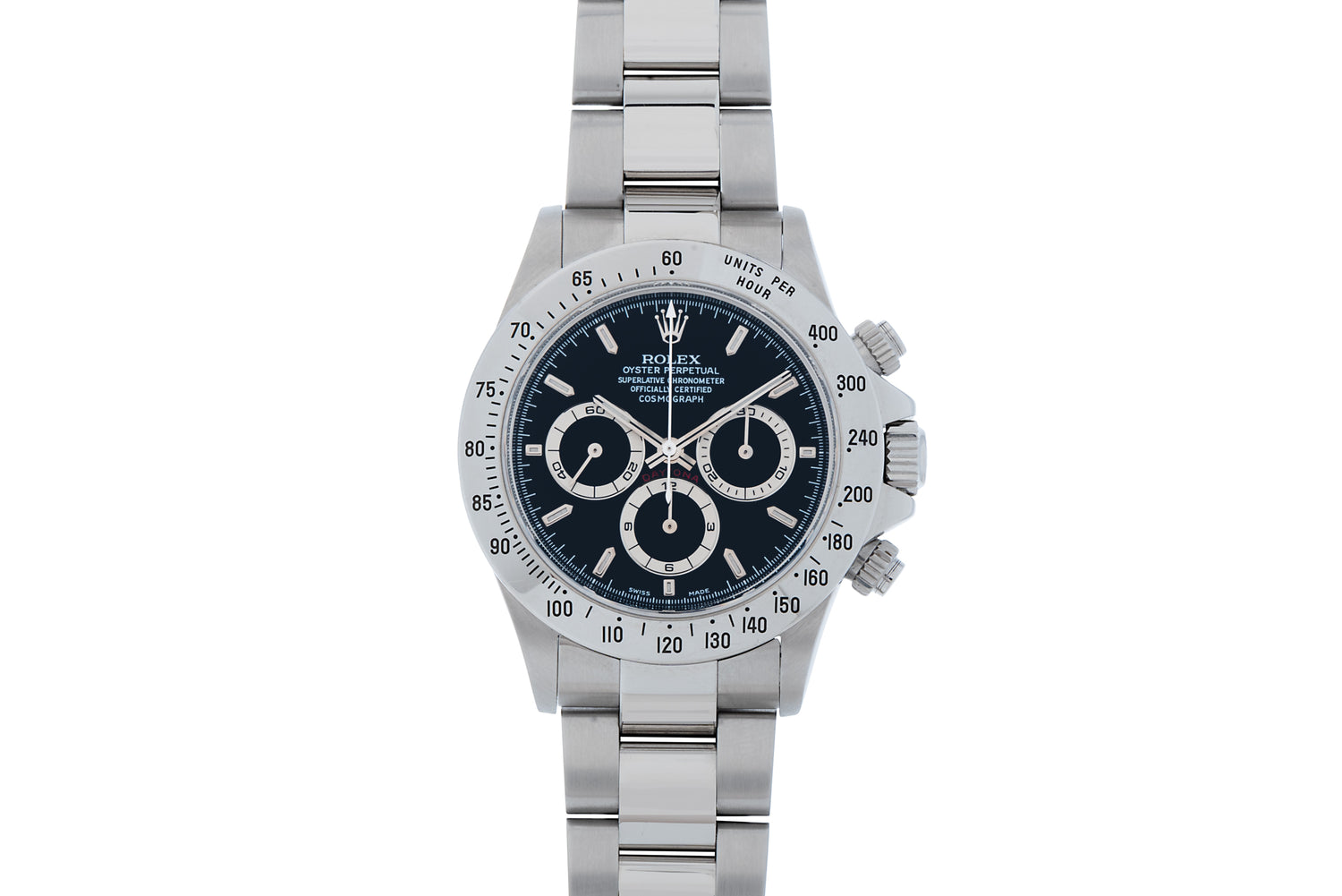 Dating to circa 1999, this piece features an excellent stainless steel case with a sapphire crystal, a polished steel tachymeter bezel, a luminous glossy black dial with lightly patinated white sub register rings giving it a vaguely "Reverse-panda-like" feel, and a matching Oyster Bracelet with signed fliplock clasp.