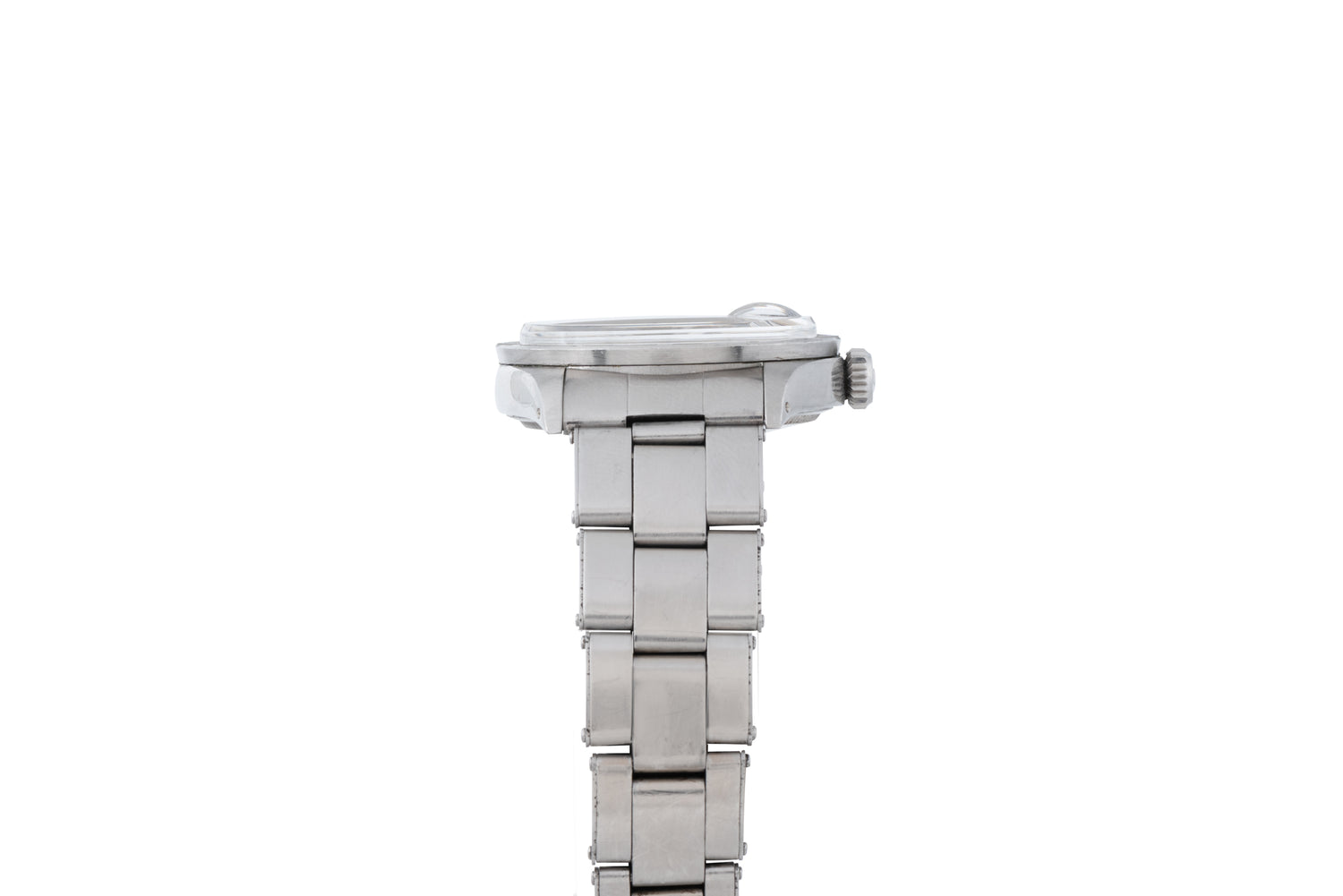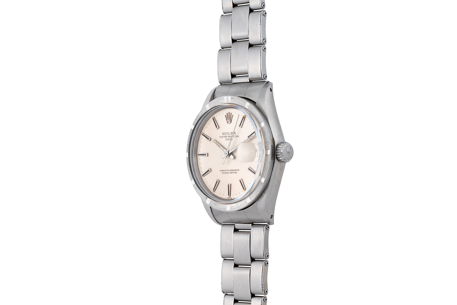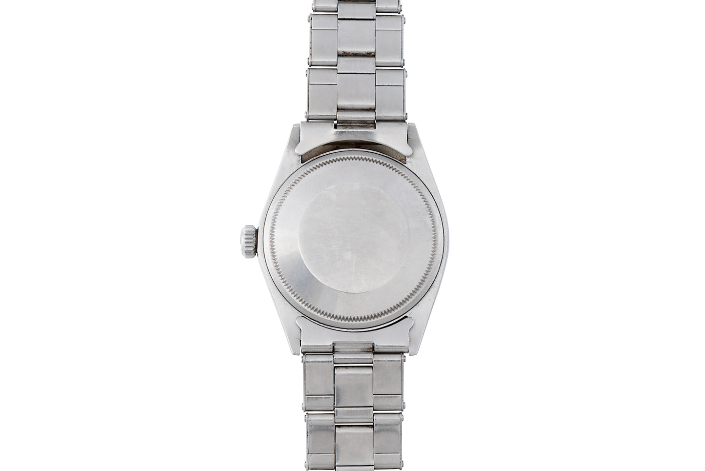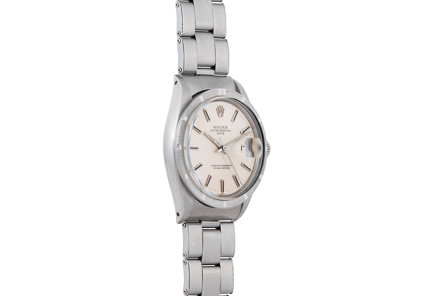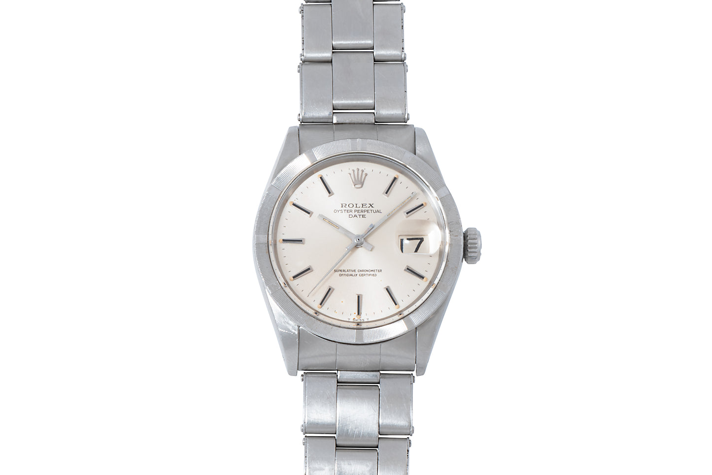 This particular watch, a Reference 1501, dates to circa 1971 and features a 35mm stainless steel oyster case with 'holey' lugs, a sunburst silver dial with applied baton indices and a matching handset, an engine-turned steel bezel with hour markers, and a stainless steel Oyster bracelet with a signed blade clasp.