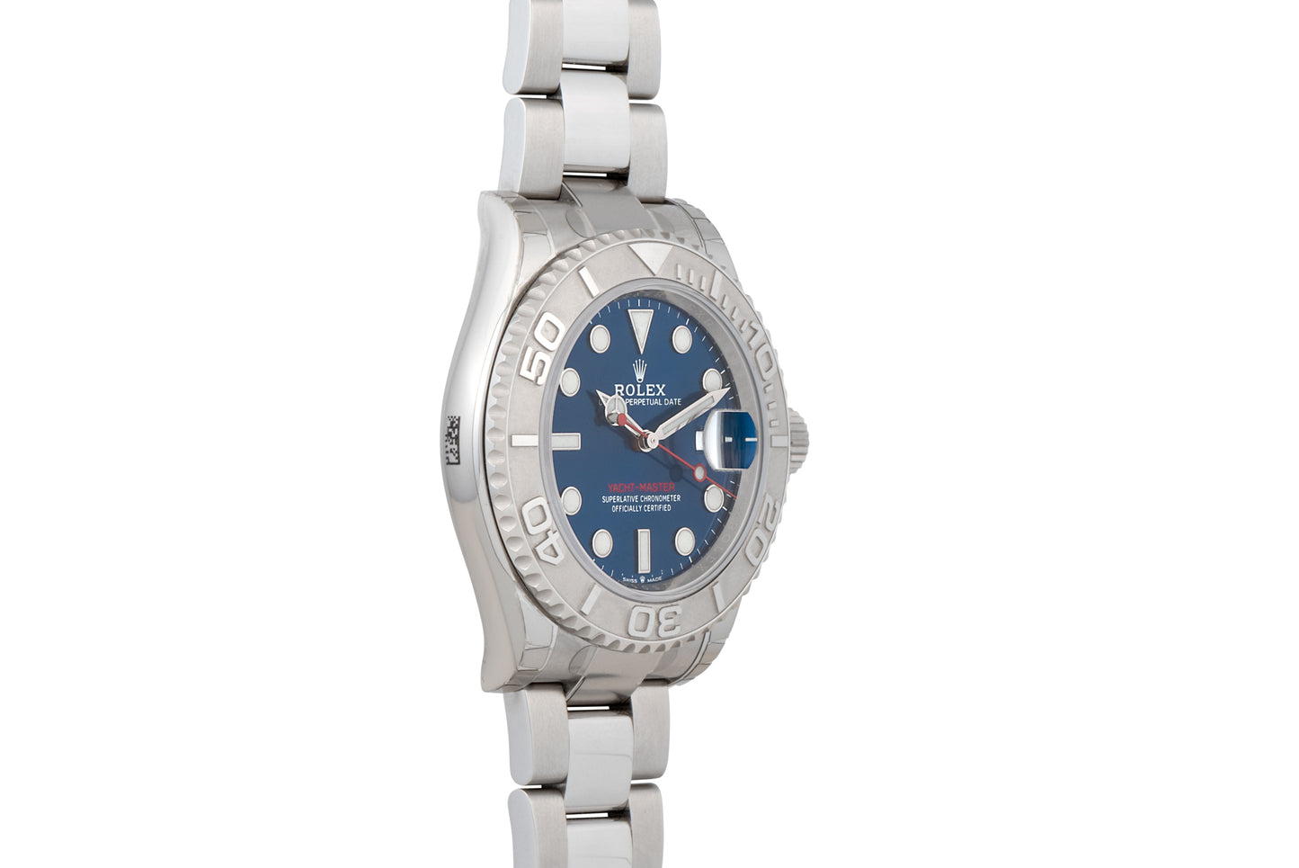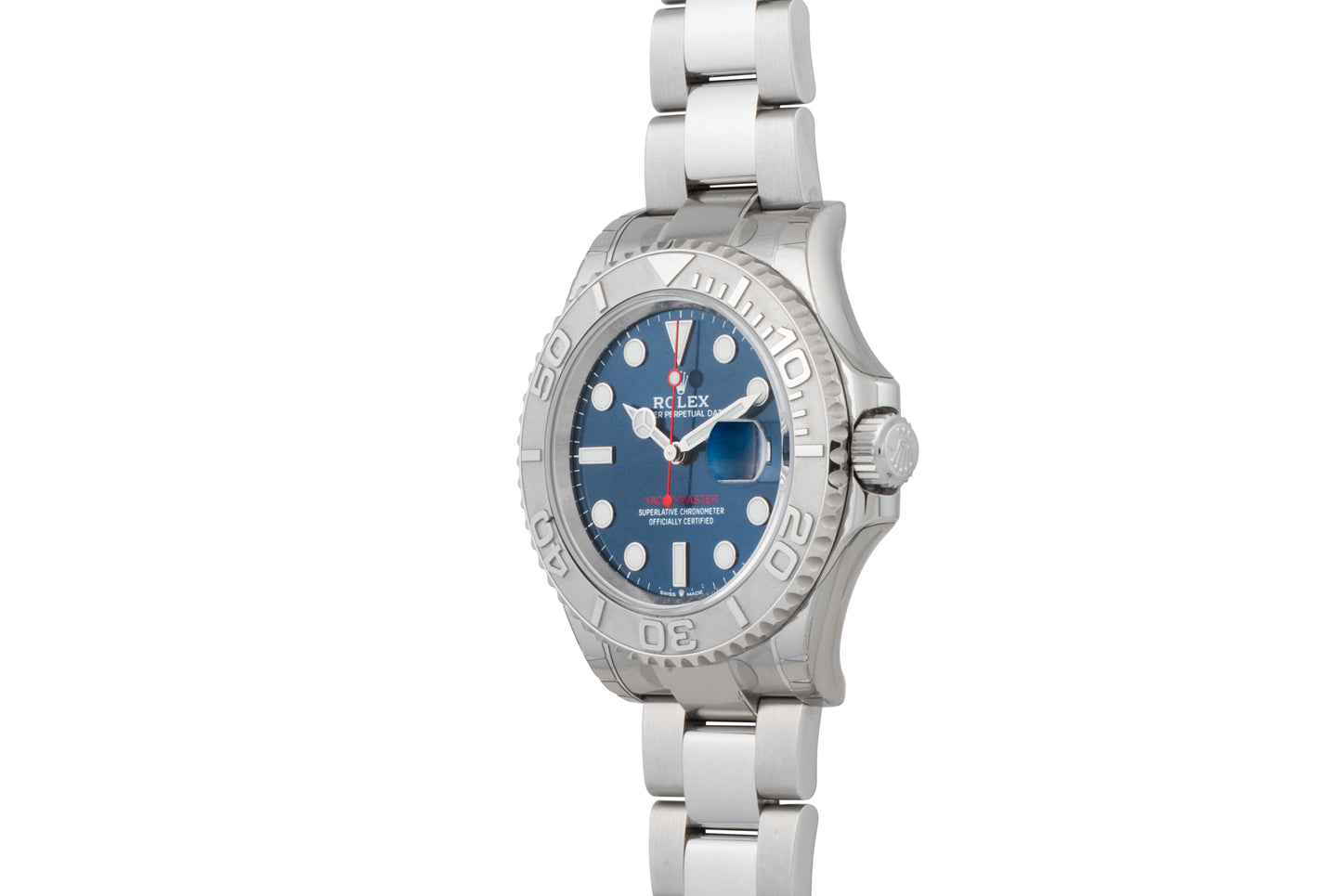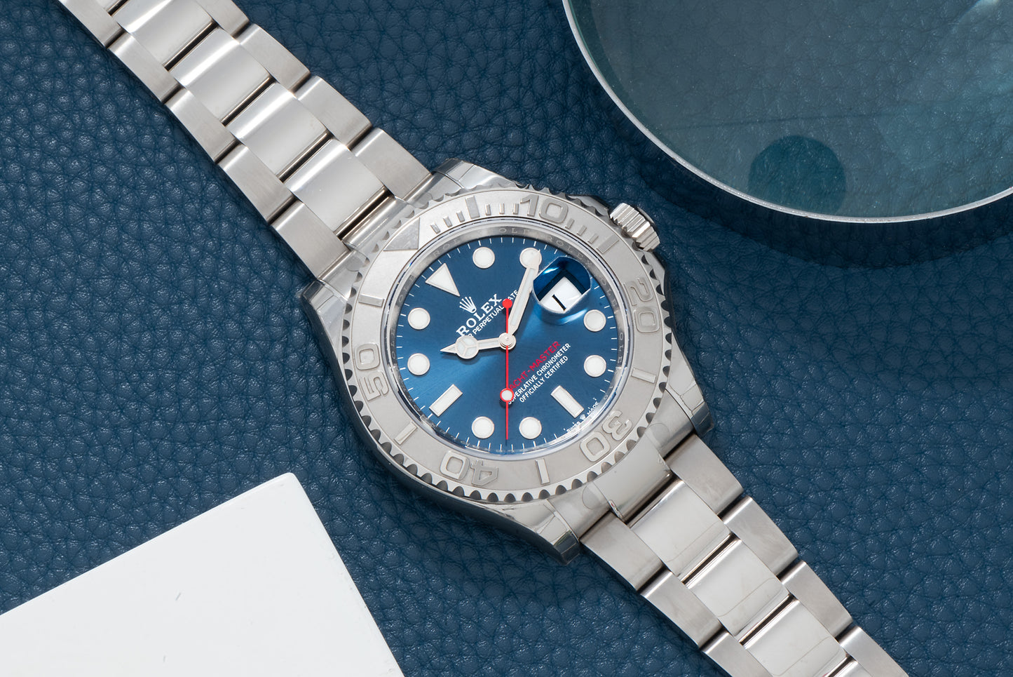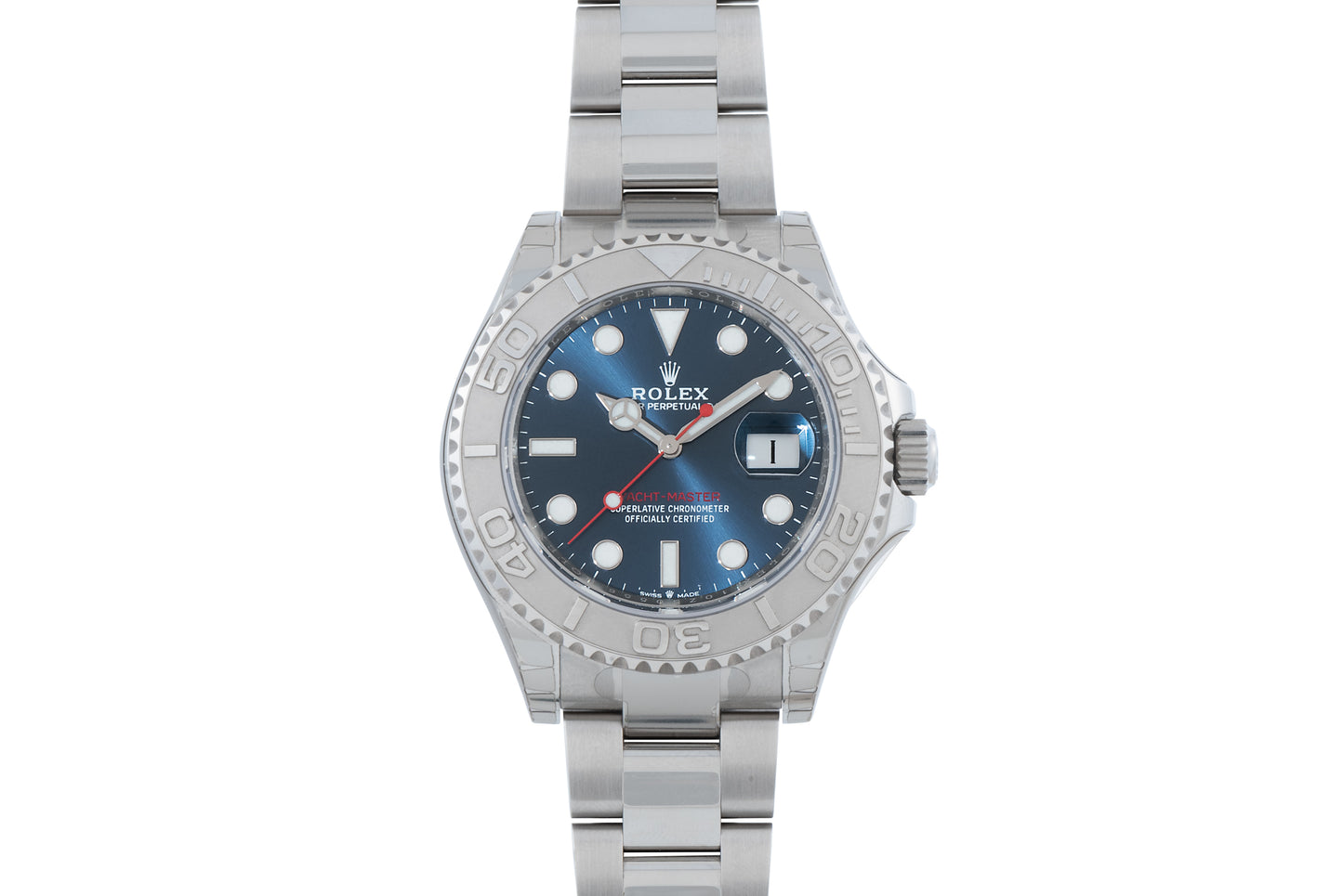 This particular example, a Reference 126622, features a 40mm Oyster case with a magnified sapphire crystal, a platinum filled bi-directional rotating bezel, a stunning, luminous sunburst blue dial with red accents and a matching handset, and a matching Oyster bracelet with a signed fliplock clasp with Rolex's fantastic Easylink system.