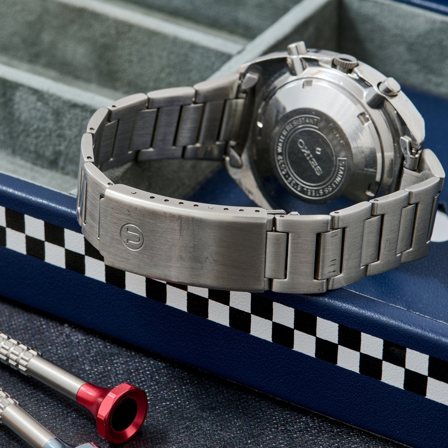 Powered by the automatic Seiko 6139 movement, it comes paired to an awesome stainless steel multi-link bracelet with a signed flip-lock clasp.