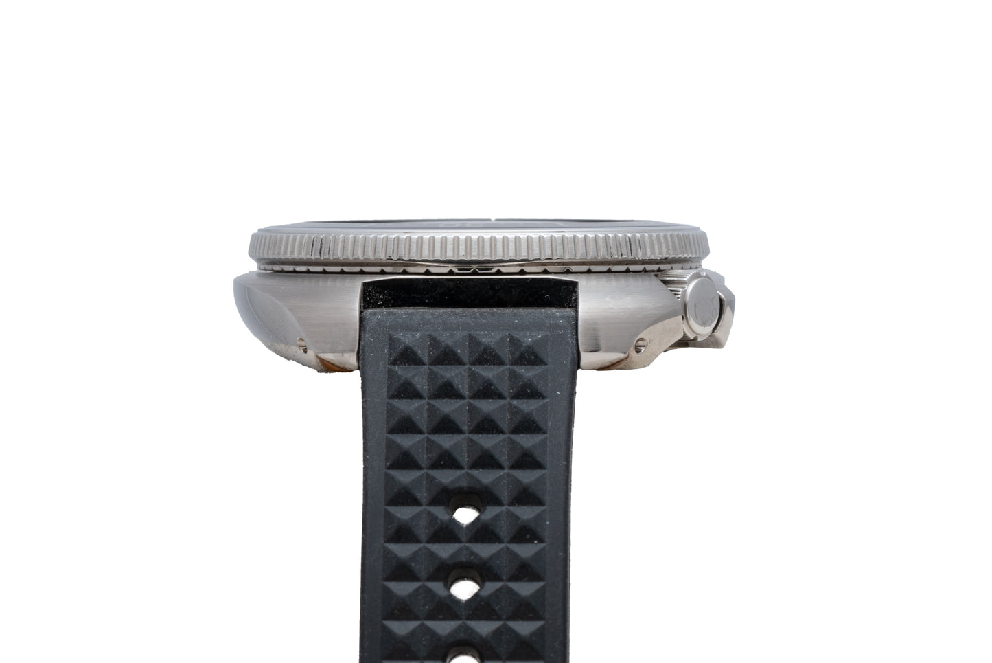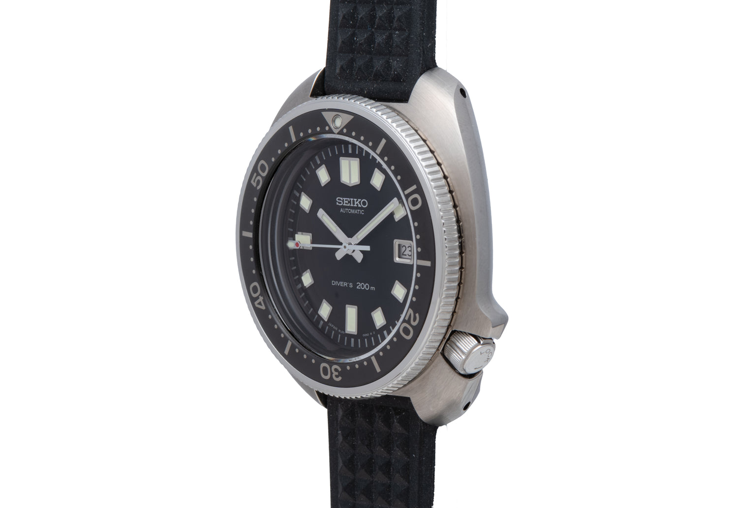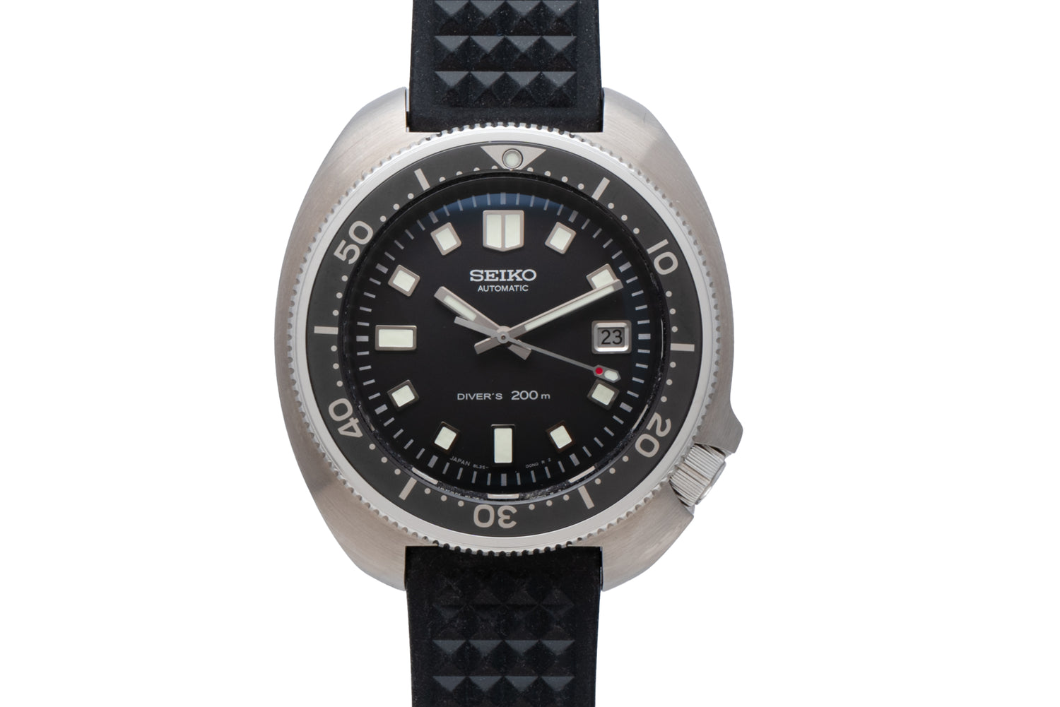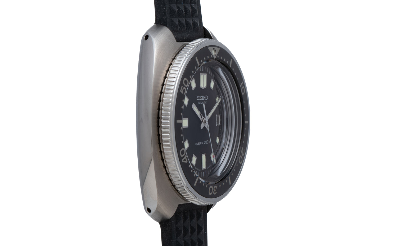 As a diver's tool, the 6105 is a worthy instrument in all regards. Developed by Seiko in the late 1960s, the large asymmetrical watch boasted 150 meters of water resistance, a bi-directional bezel for dive timing and large swaths of luminescent material for high visibility underwater. Used extensively in the field by soldiers and frogmen, the 6105 developed a reputation as a no-nonsense timepiece for professional use, a reputation that has lasted through to this day and undoubtedly inspired countless diving watches in the subsequent decades.