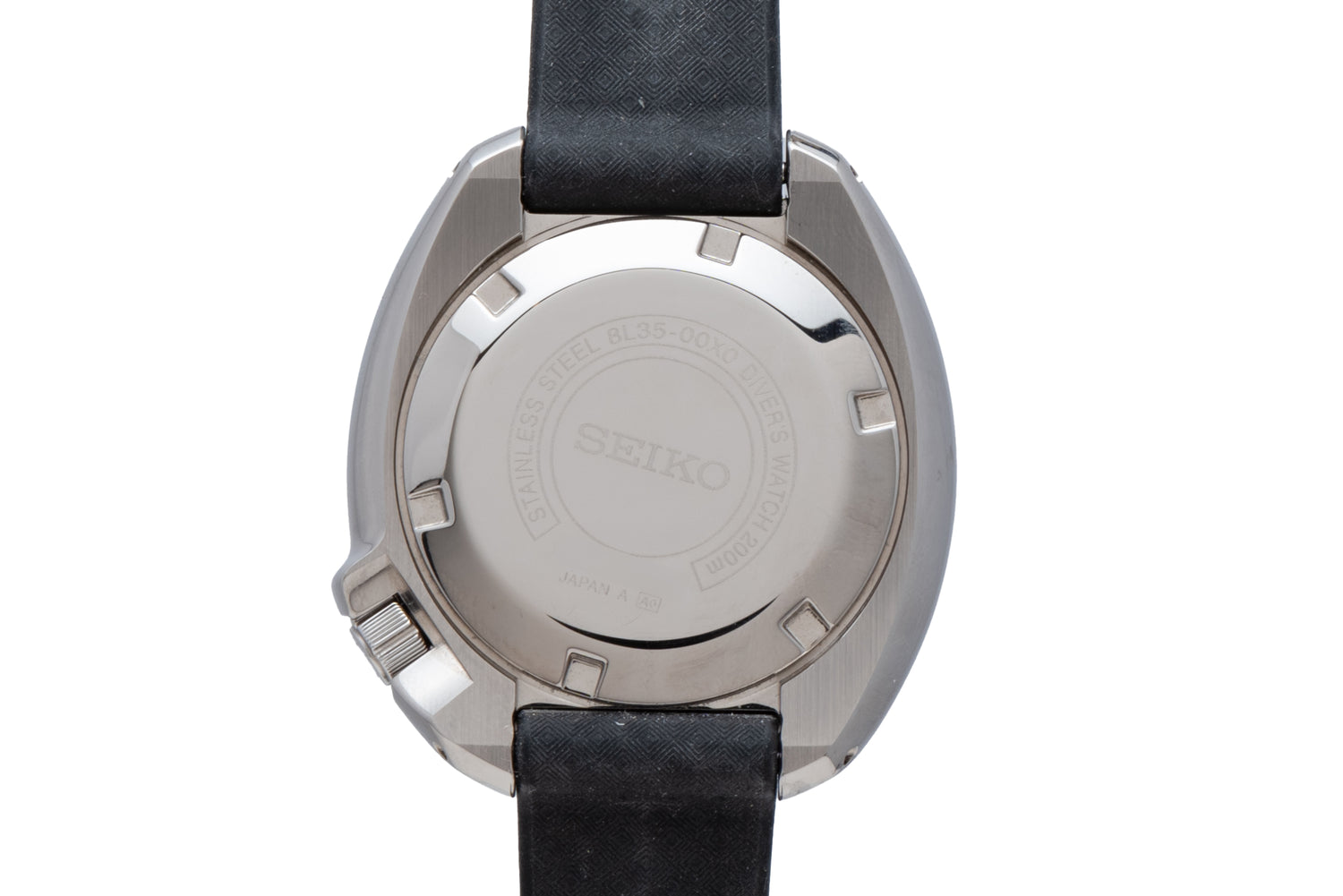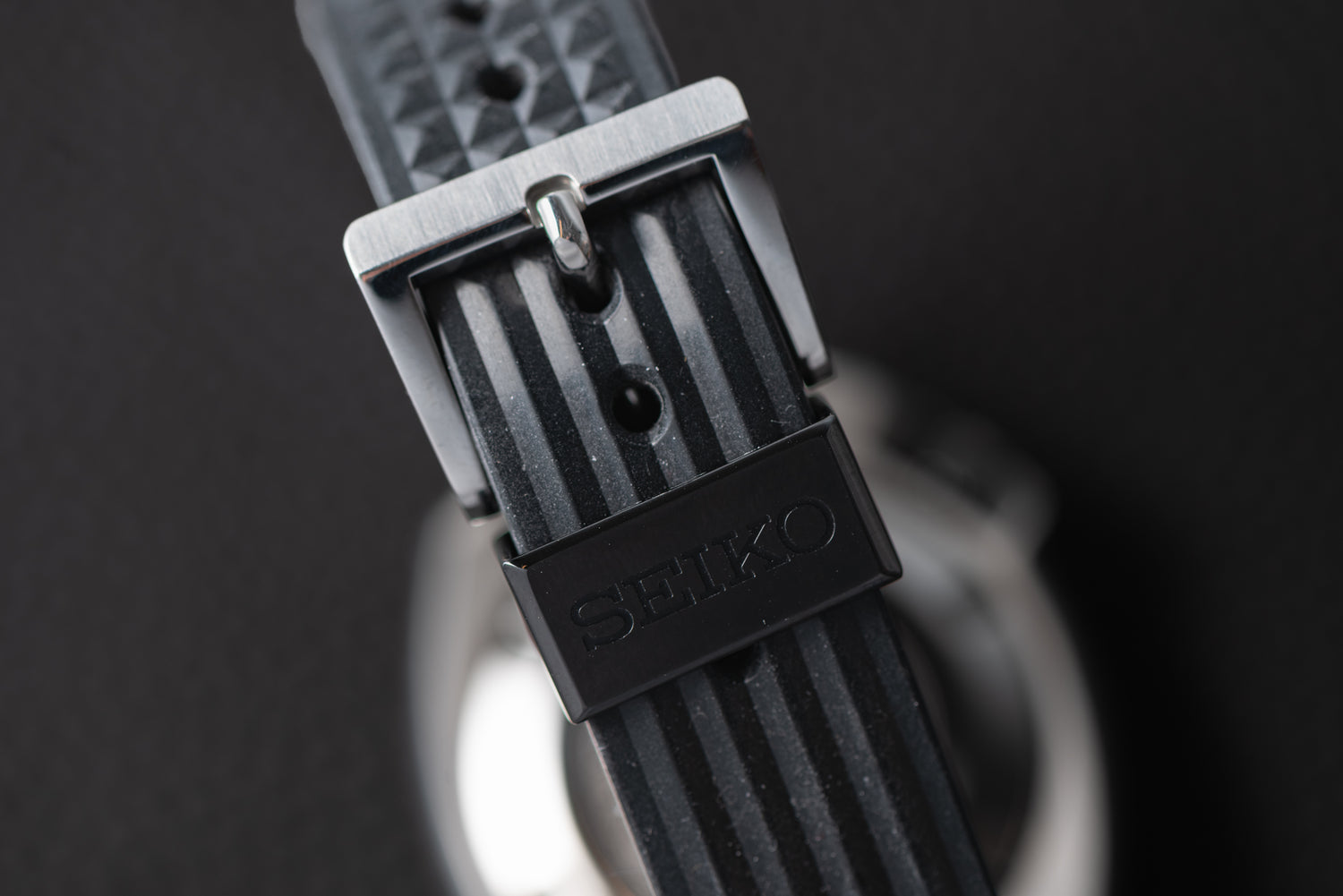 The black gloss dial shows a set of applied indices, a matching stick handset with a ‘stoplight’ seconds hand and a framed date window at 3 o’clock. It comes fitted on a Seiko's comfortable rubber 'waffle' textured strap, and includes its box, booklets, and warranty card, dated 2019.
