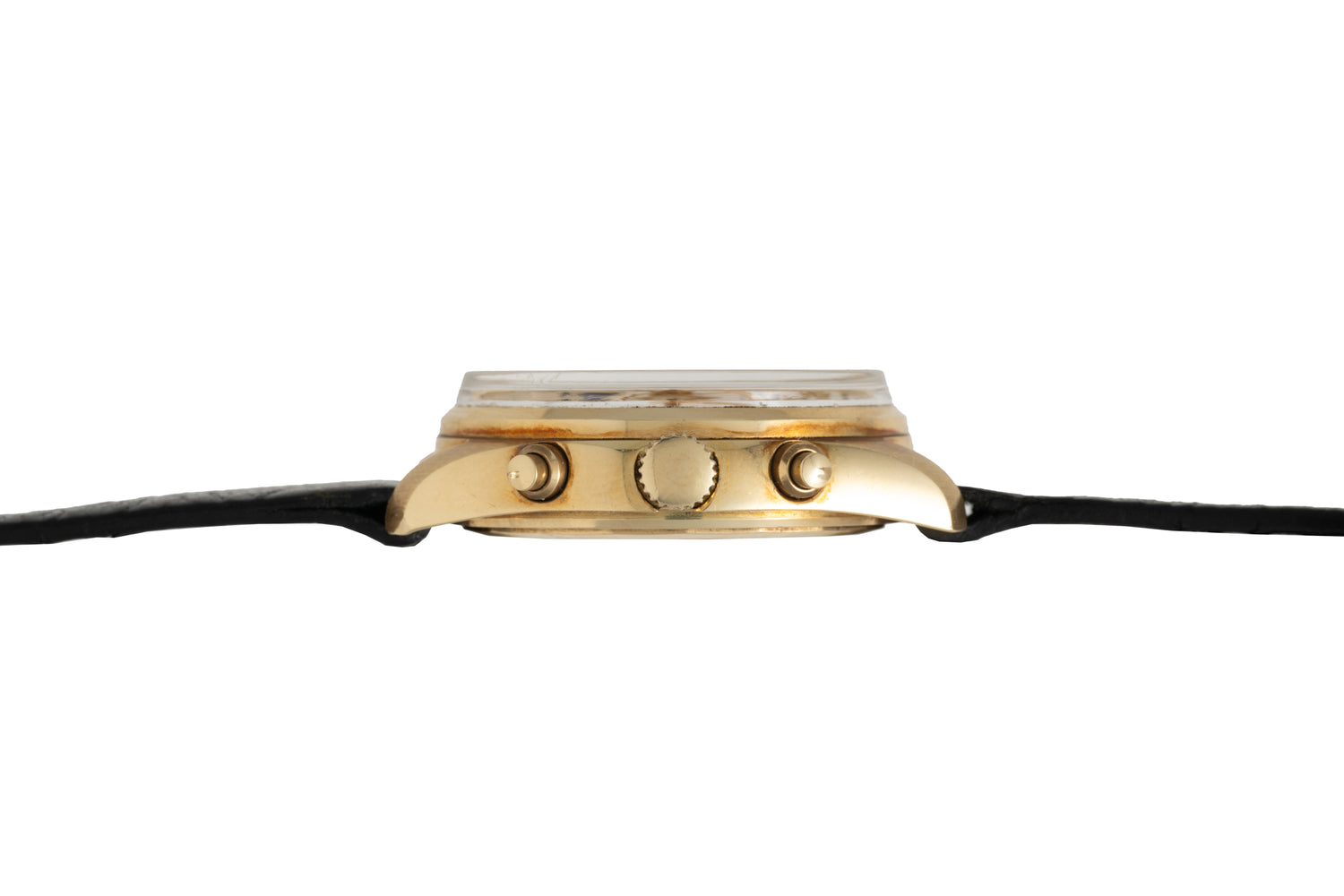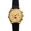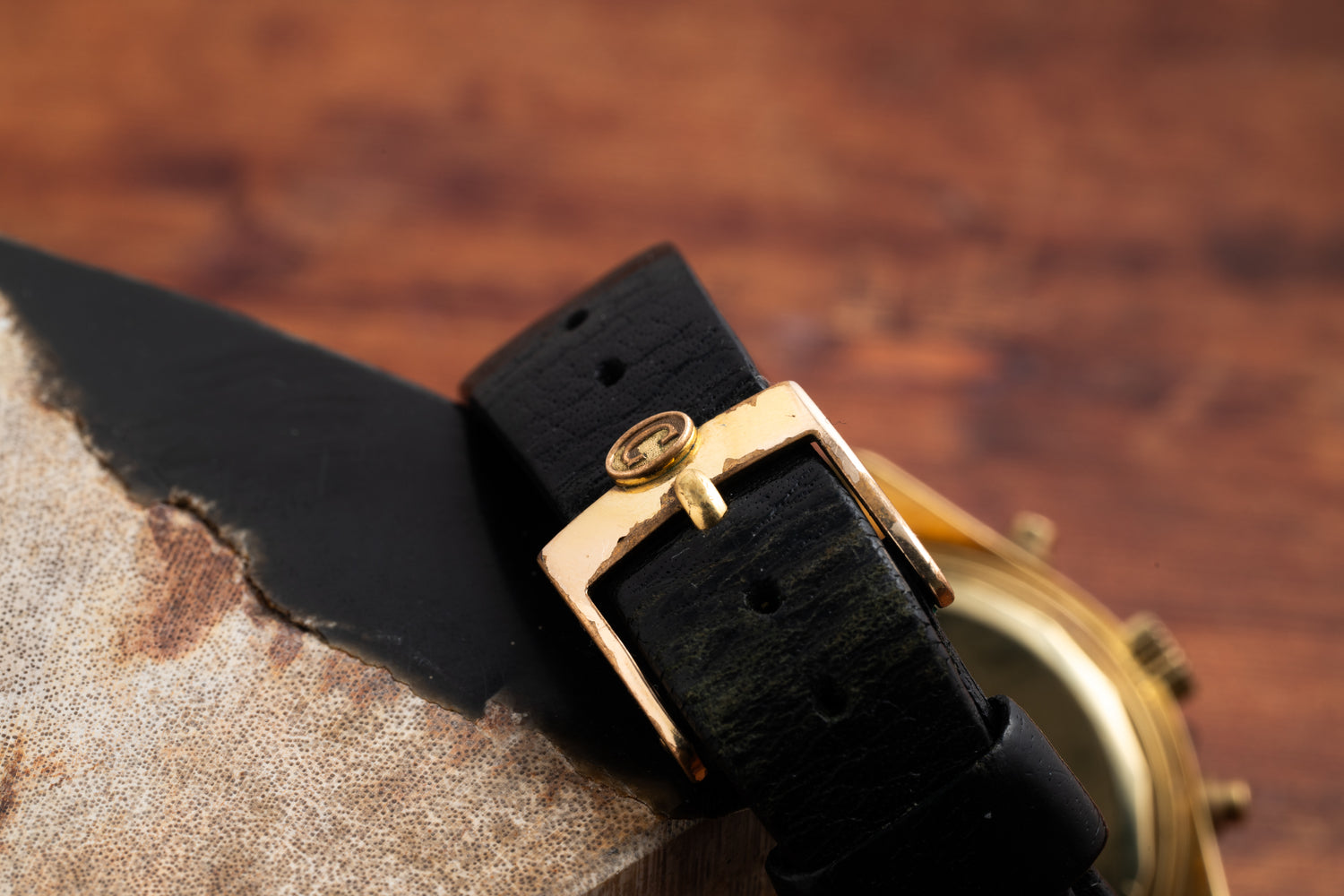 This watch, although not sporting the El-Primero movement, carries the same design ethos of its Zenith based counterparts. Under the hood, we find a just as venerable Valjoux 72 based manually wound movement, cased in an elegant 36mm 18K yellow gold case, featuring an unsigned crown and a stunning champagne triple calendar moonphase dial.