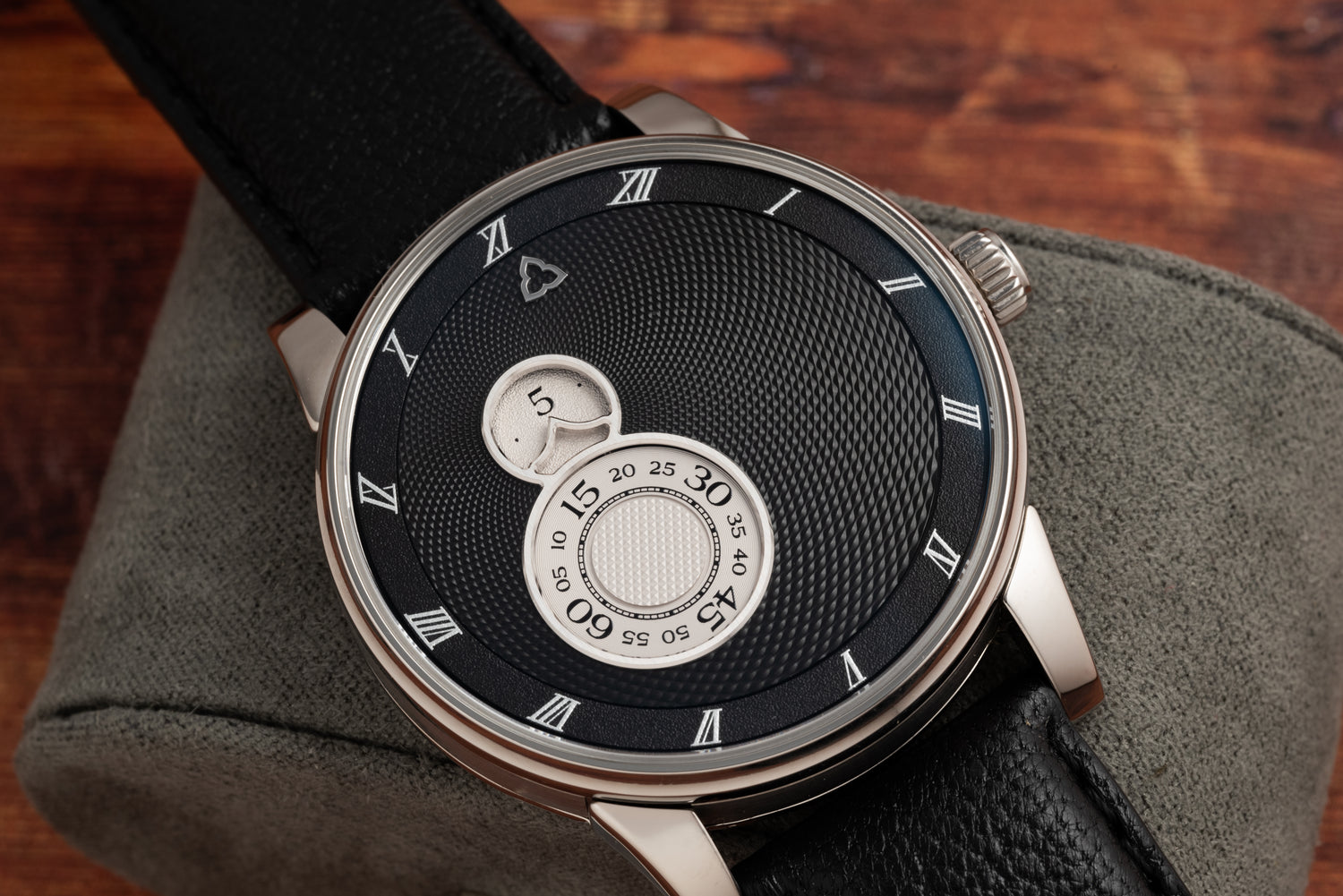 In lieu of the standard Arabic indices, this piece features a more elegant display of telling time with Roman numerals displayed along an outer rotating hour disc. A silver digital minute aperture, as well as a running seconds display are positioned off-center and set against a beautiful, hand-machined guilloche Grain d’Orge.