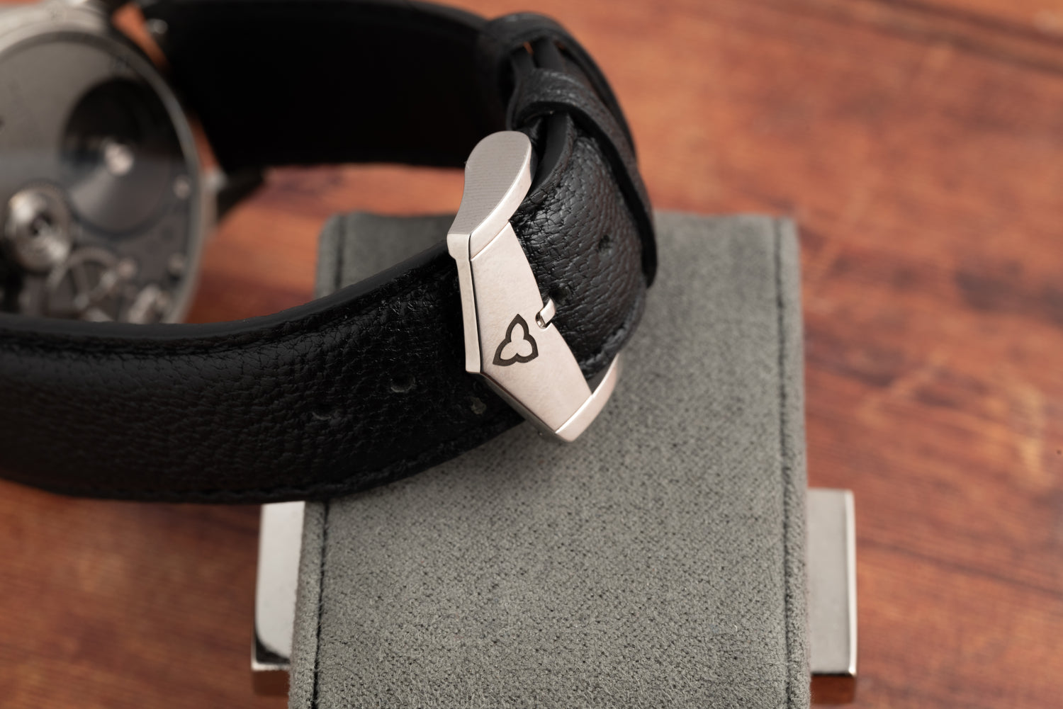 This Trilobe x HODINKEE Nuit Fantastique draws inspiration from their foundational model, but with a certain touch of refinement and monochrome aesthetic that we’ve come to expect with a HODINKEE collab. This piece features a 38.5mm Grade 5 titanium case with brushed finishing, a signed crown and a sapphire exhibition caseback framing a well-executed, finely-finished self-winding X-Centric Calibre micro-rotor movement.