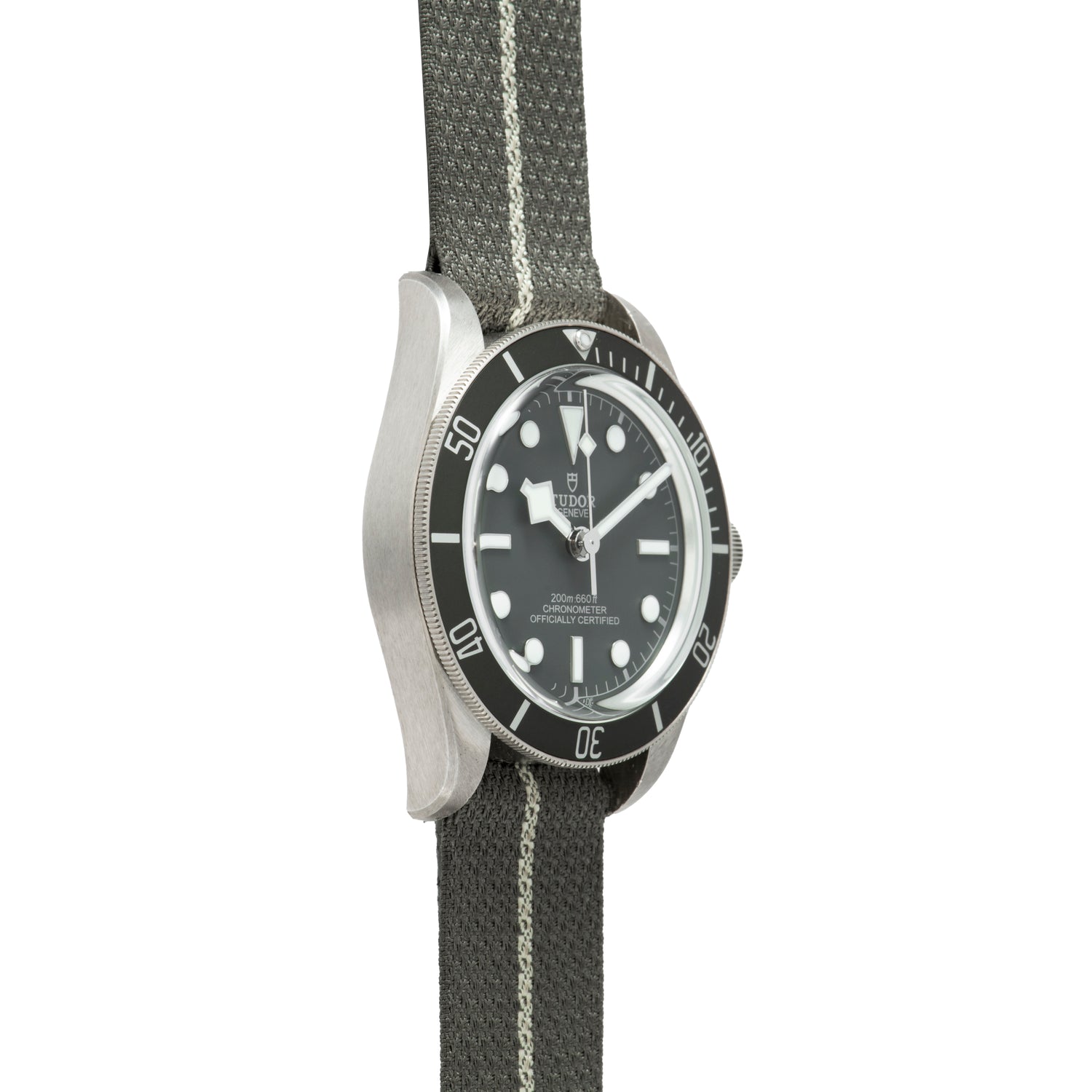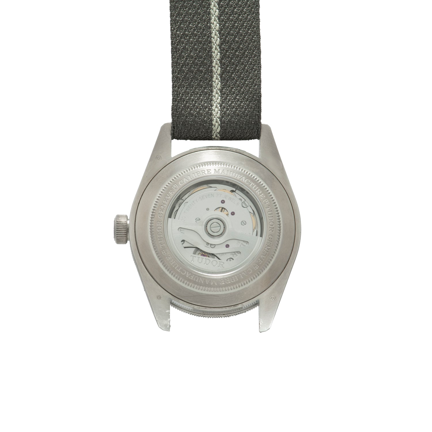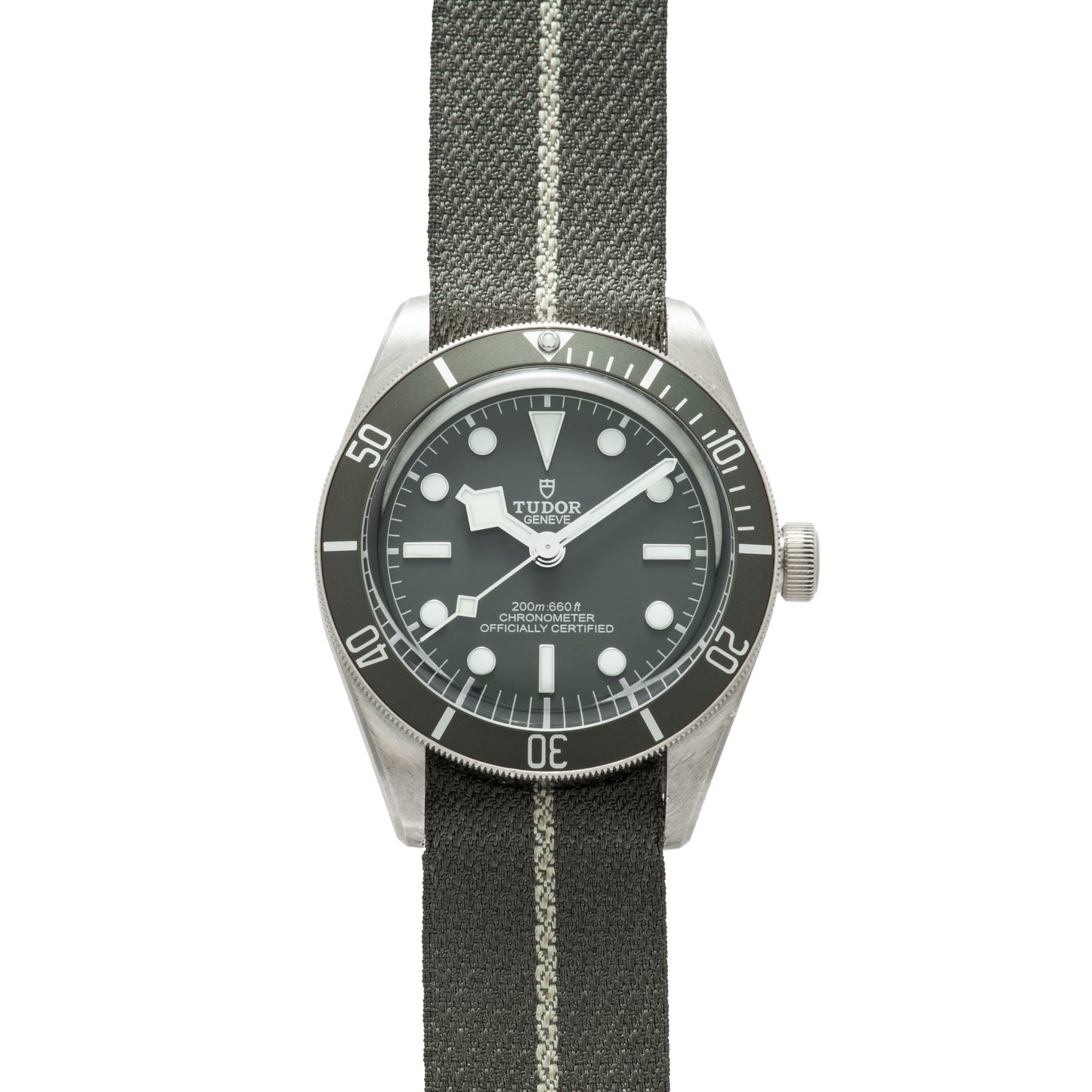 Outfitted with a woven taupe and grey strap with a signed, matching 925 silver pin buckle, this piece is powered by Tudor's automatic, COSC-certified Calibre MT5400.