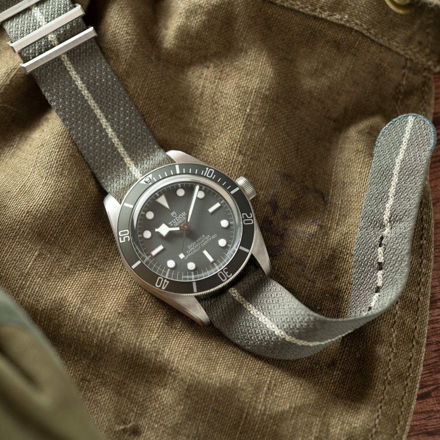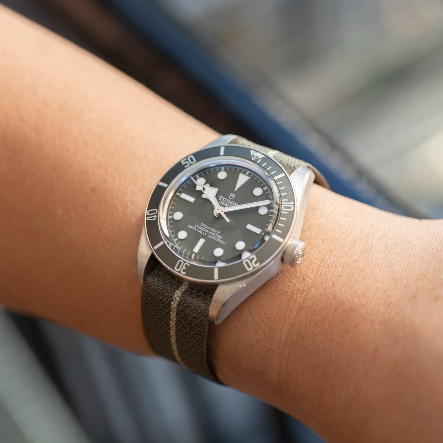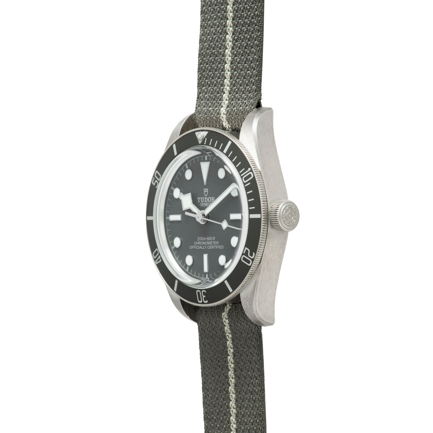 Outfitted with a woven taupe and grey strap with a signed, matching 925 silver pin buckle, this piece is powered by Tudor's automatic, COSC-certified Calibre MT5400.