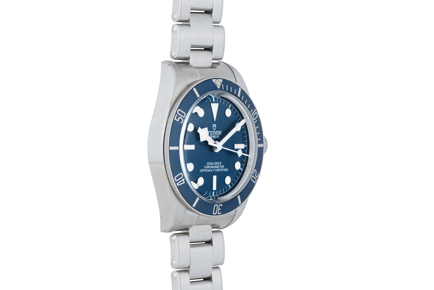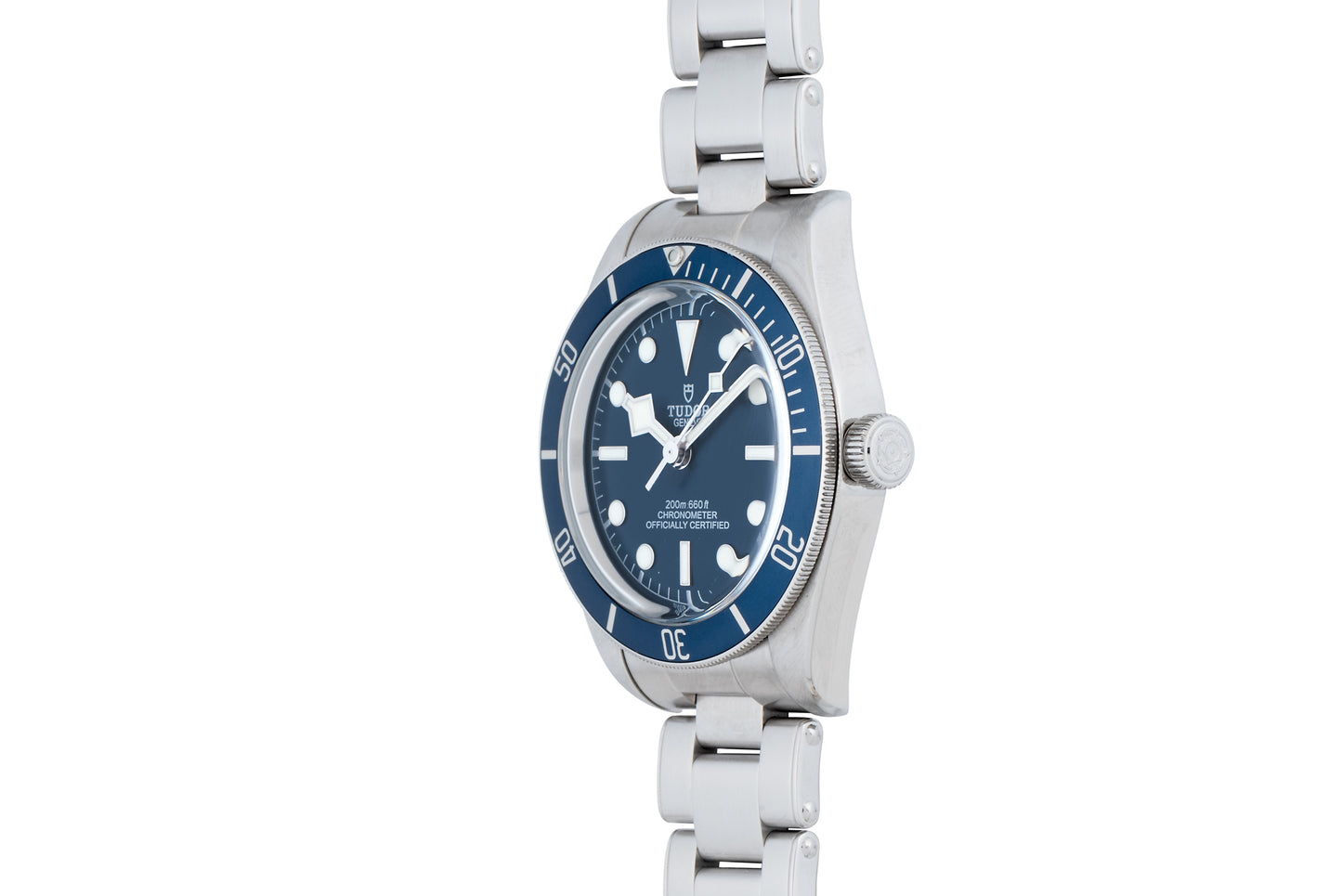 The particular Black Bay Fifty-Eight we have here, a Reference M79030B-0001, features a 39mm stainless steel case with a sapphire crystal, a unidirectional rotating dive timing bezel with a blue insert, a luminous matte blue dial with a matching ‘snowflake’ handset, and a screw-down rose crown. Powered by the automatic, chronometer-certified Tudor MT5400 movement, it comes fitted to a matching stainless steel Oyster bracelet with a signed fliplock clasp.