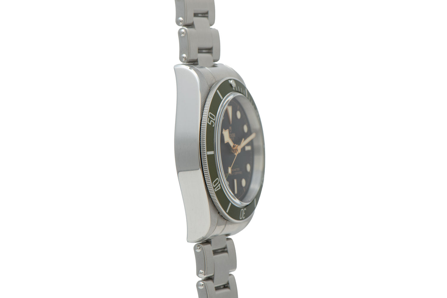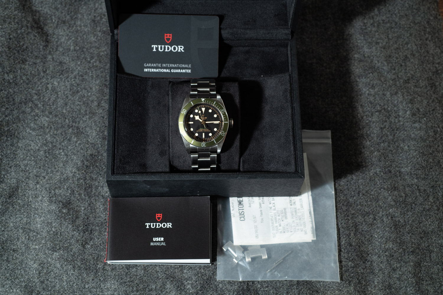 This particular Black Bay, a Reference M79230g, features a 41mm stainless steel case with a sapphire crystal, a 'rose' signed crown, and a unidirectional rotating timing bezel with a special green aluminum insert. The case houses a matte black 'gilt' dial with applied luminous indices, a matching 'snowflake' handset, and Tudor's Calibre MT5602 automatic winding movement.