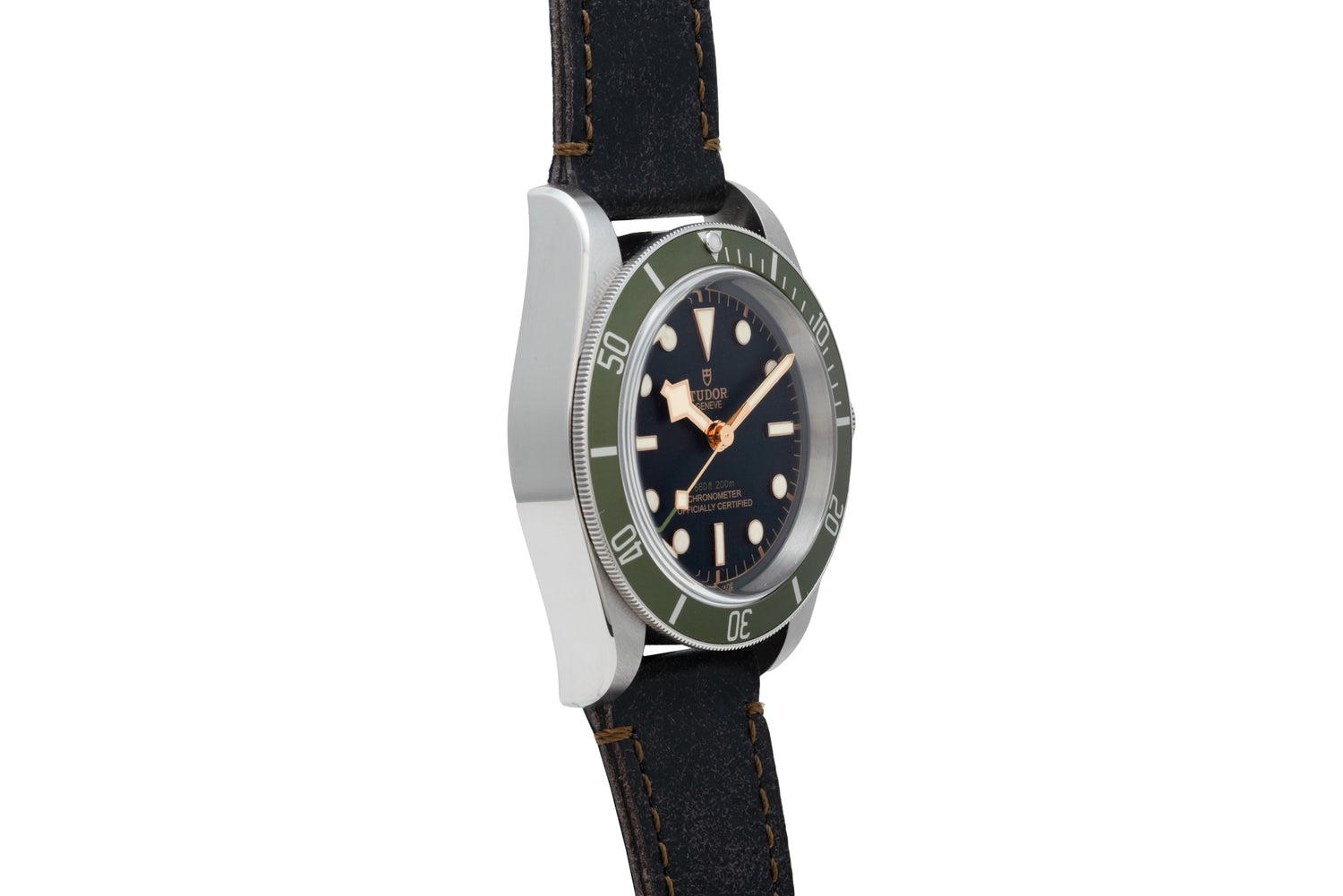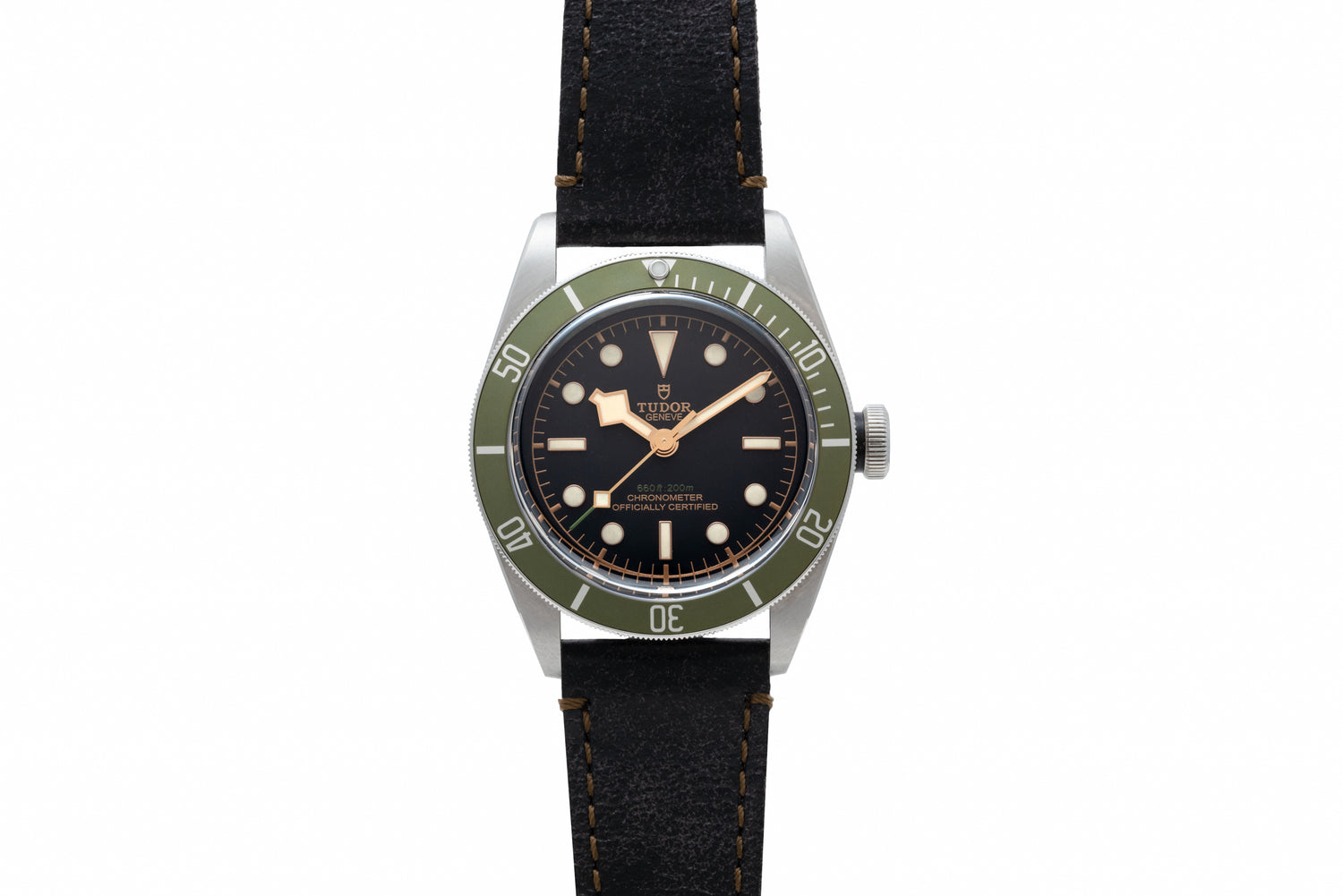 This particular Black Bay, a Reference M79230g, features a 41mm stainless steel case with a sapphire crystal, a 'rose' signed crown, and a unidirectional rotating timing bezel with a special green aluminum insert. The case houses a matte black 'gilt' dial with applied luminous indices, a matching 'snowflake' handset, and Tudor's Calibre MT5602 automatic winding movement.