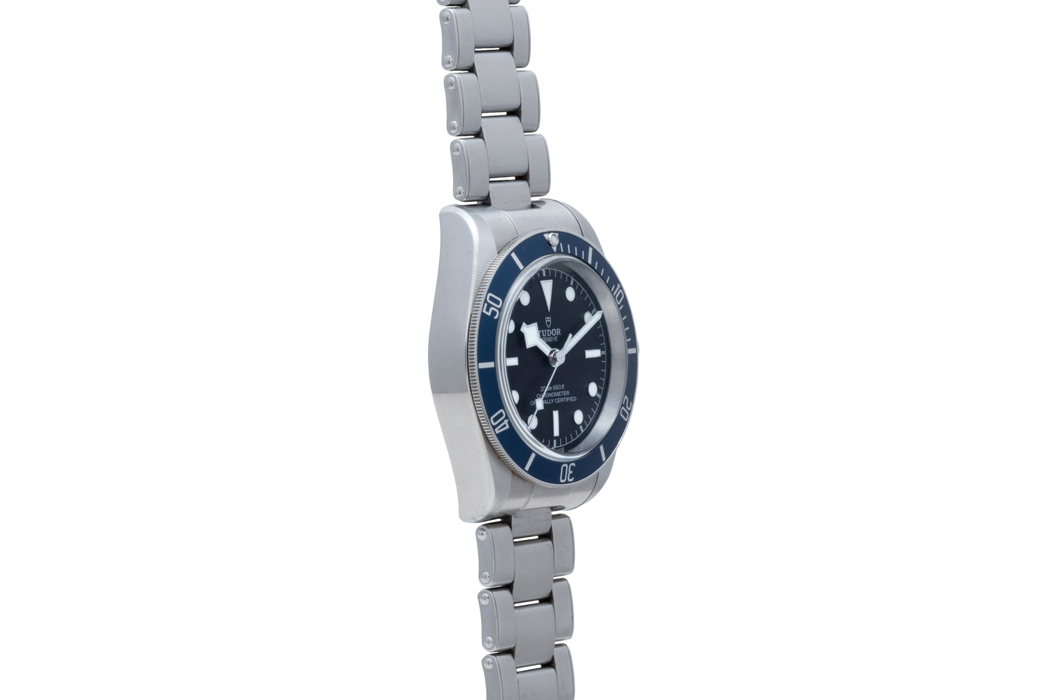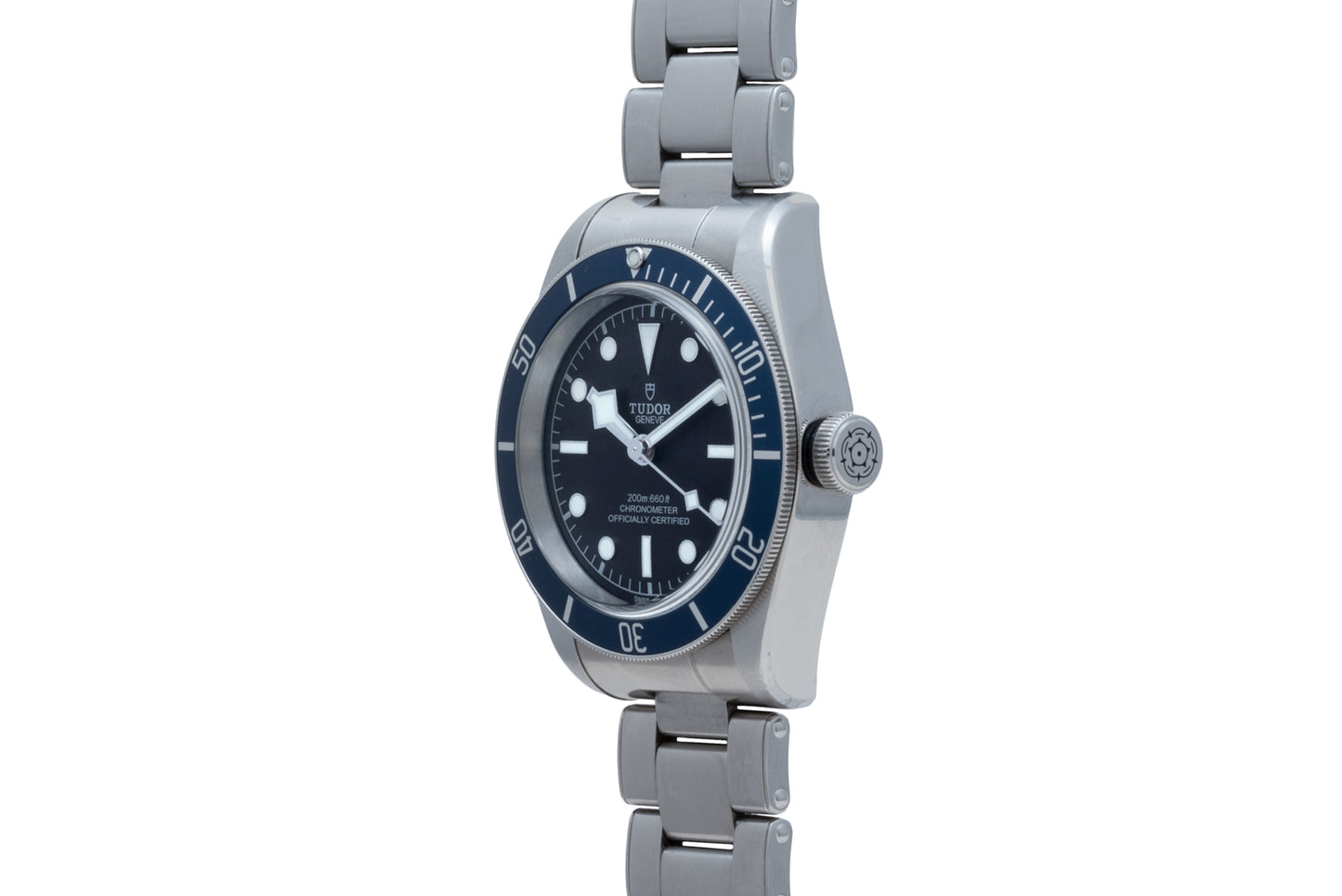 This modern Black Bay 41, a Reference 79230B, features a robust 41mm stainless steel case with a sapphire crystal, signed 'rose' screw-down crown and an anodized matte blue rotating timing bezel. The luminous black dial features highly legible markers and Tudor's signature 'snowflake' handset.