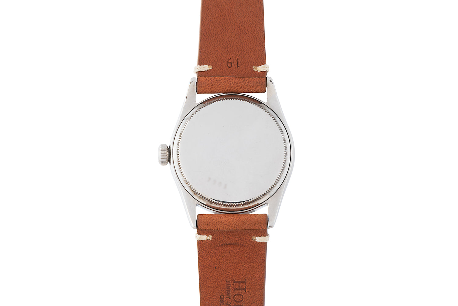 Powered by an automatic Swiss movement from Fluerier and paired to a brown vintage-style leather strap with a steep pin buckle, this beautiful piece from circa the mid-1950s looks as handsome today as it did in the decade of explosive economic growth and prosperity that followed the Second World War in America.