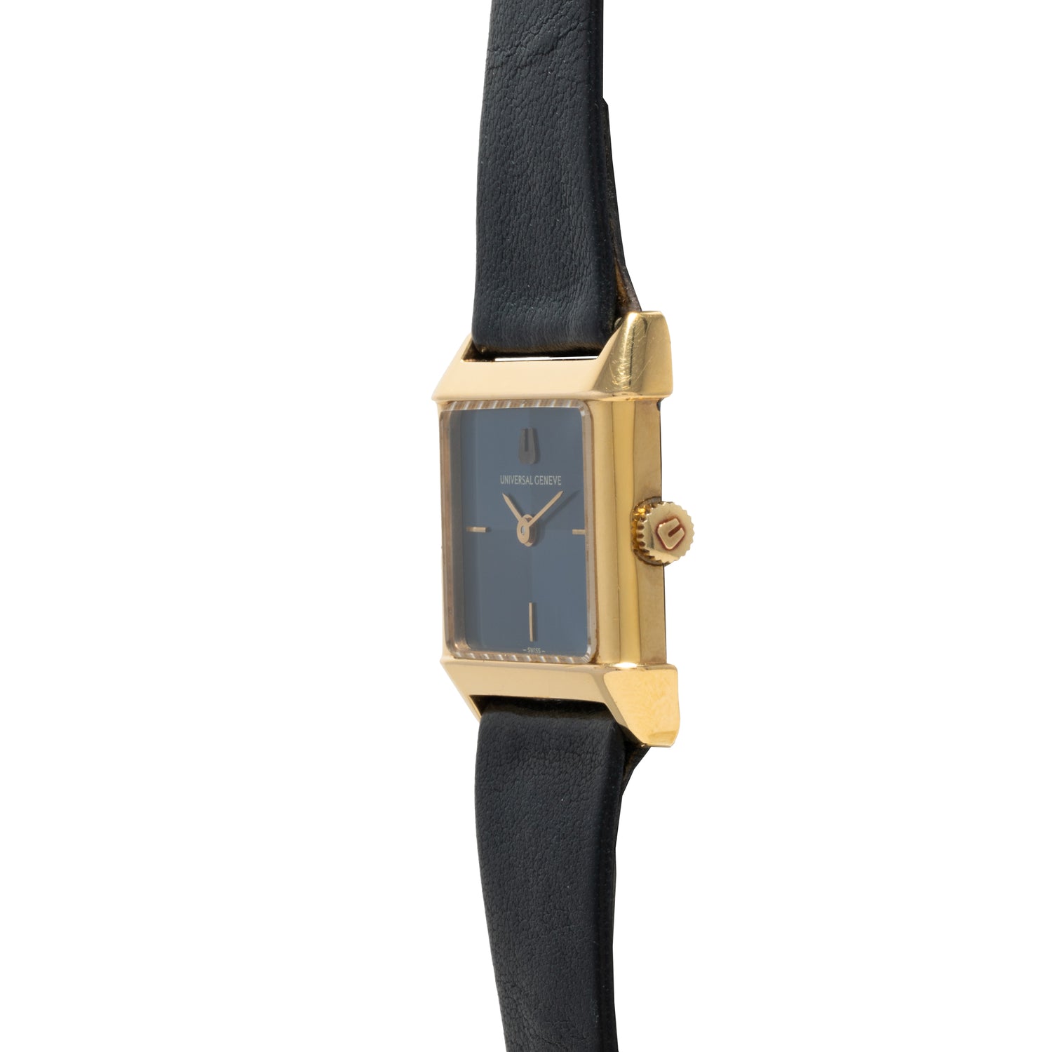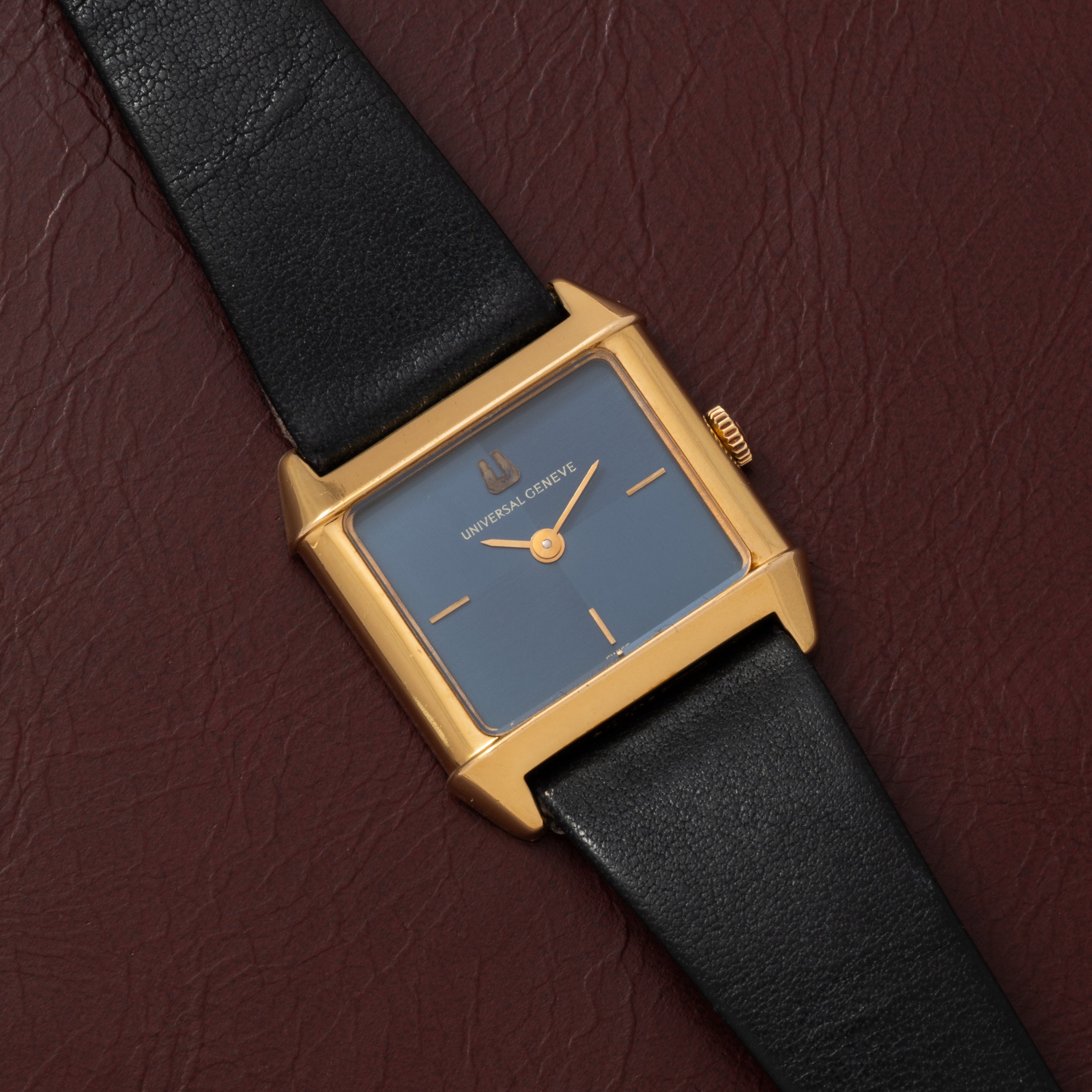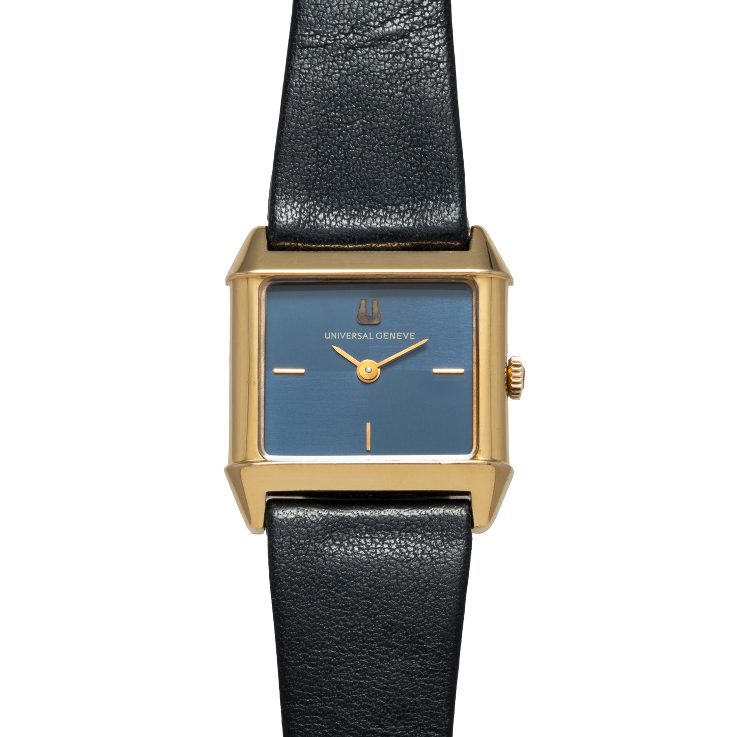 Take this dressy timepiece, for example: it features a 25mm gold-plated rectangular case with a smooth bezel, a signed crown, and an acrylic crystal. Its cool blue 'checker' dial, meanwhile, features applied gold indices, a matching gold 'pencil' handset, and an applied Universal Genève logo. Powered by a hand-wound movement and paired to a signed, black leather strap with a gold-plated pin buckle, it's a handsome and unobtrusive piece that's perfect for both men and women.