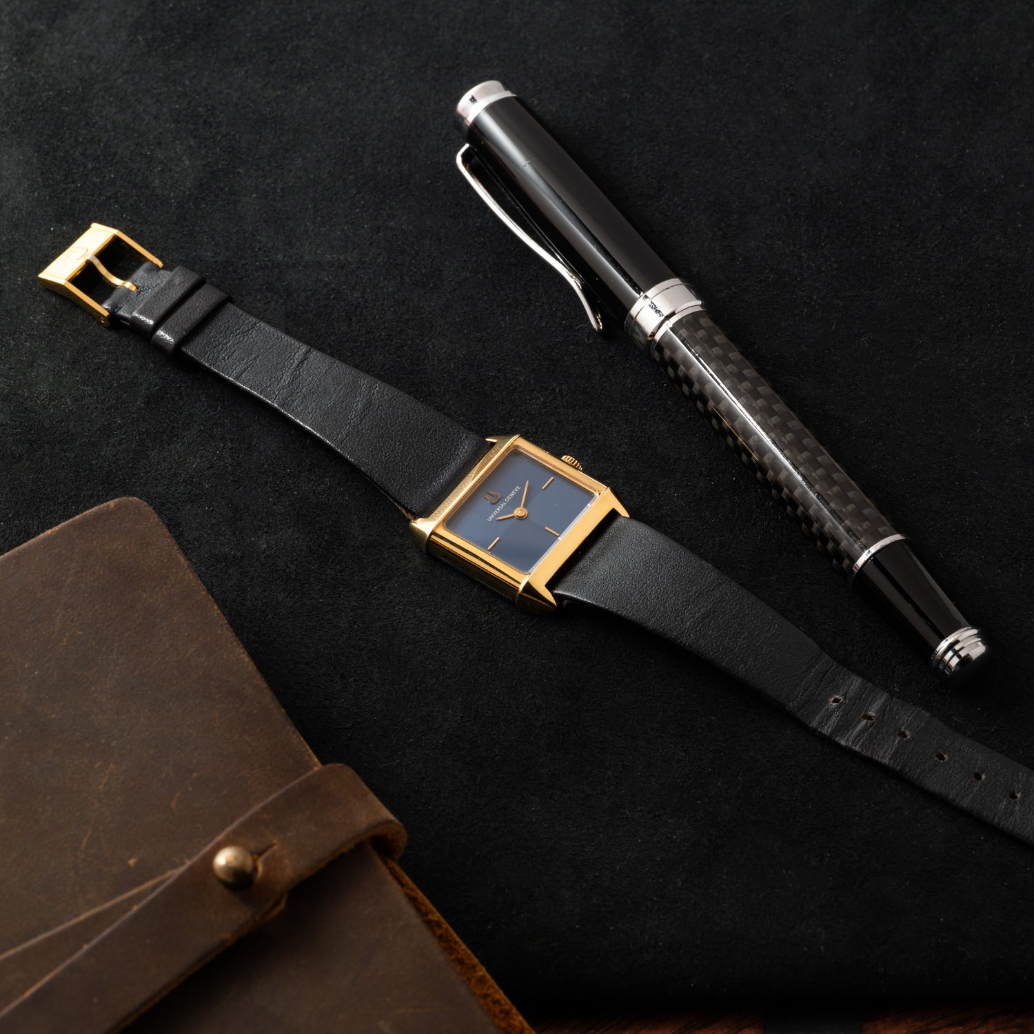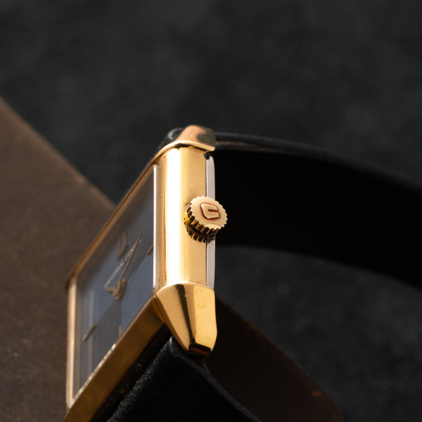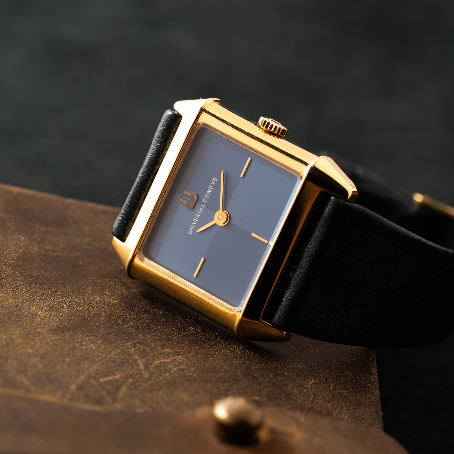 Take this dressy timepiece, for example: it features a 25mm gold-plated rectangular case with a smooth bezel, a signed crown, and an acrylic crystal. Its cool blue 'checker' dial, meanwhile, features applied gold indices, a matching gold 'pencil' handset, and an applied Universal Genève logo. Powered by a hand-wound movement and paired to a signed, black leather strap with a gold-plated pin buckle, it's a handsome and unobtrusive piece that's perfect for both men and women.