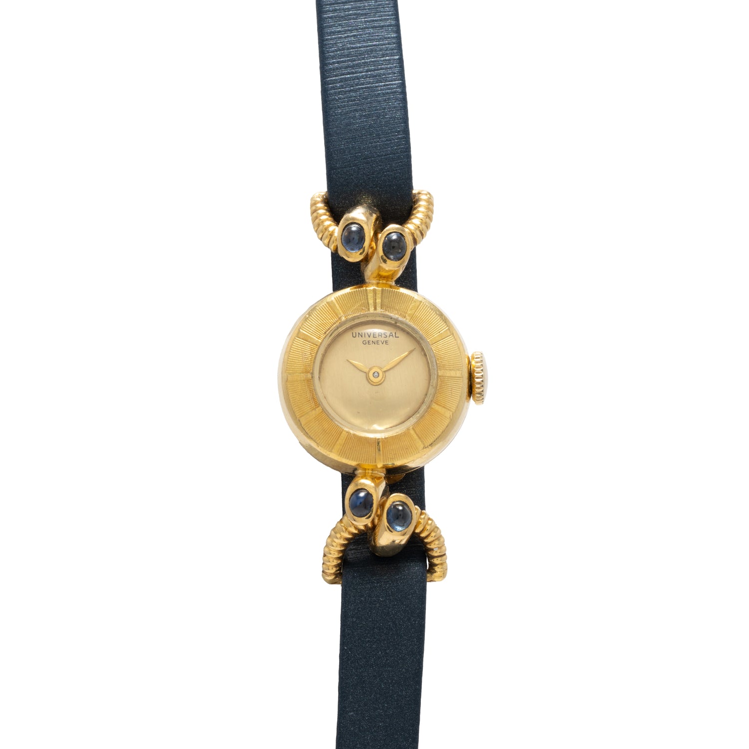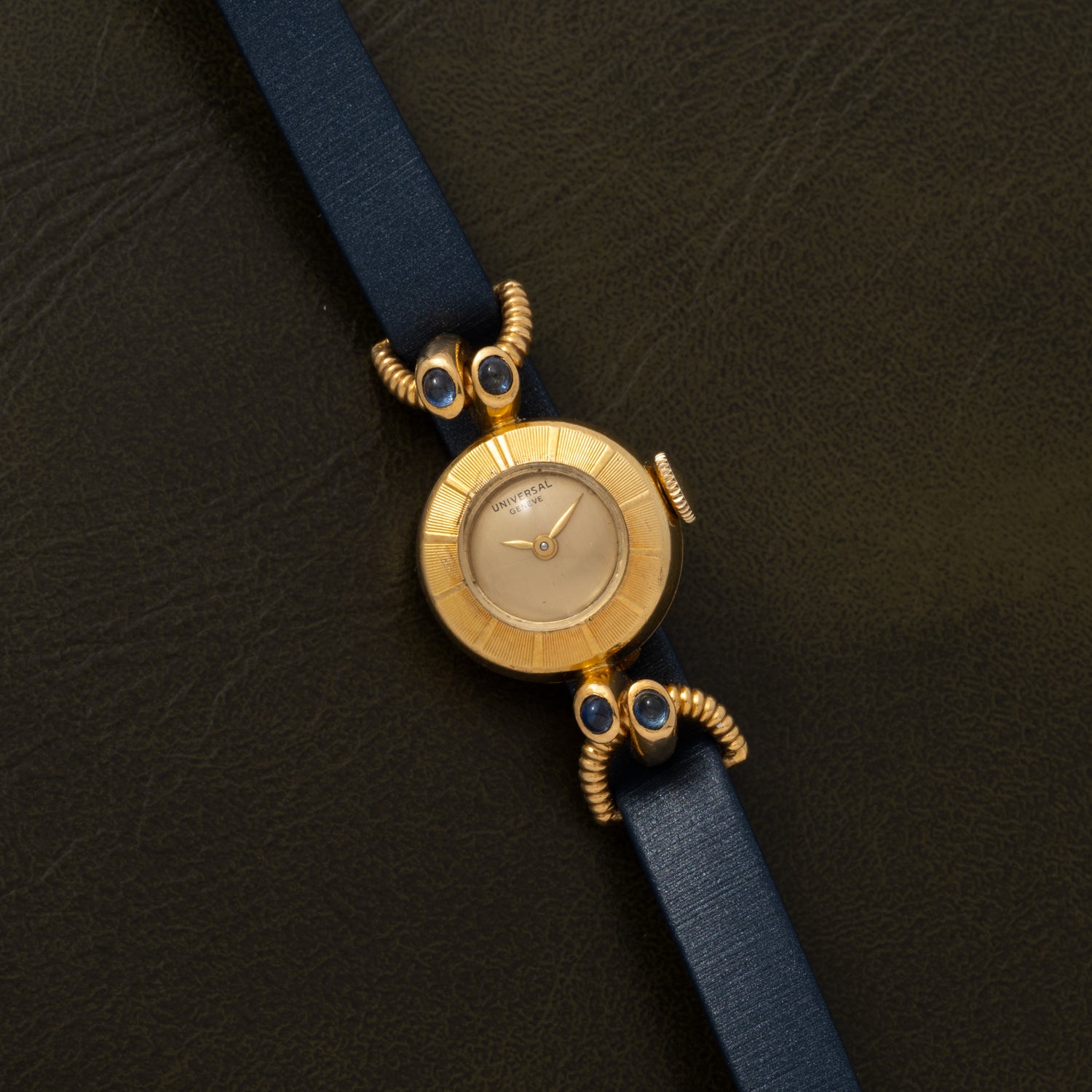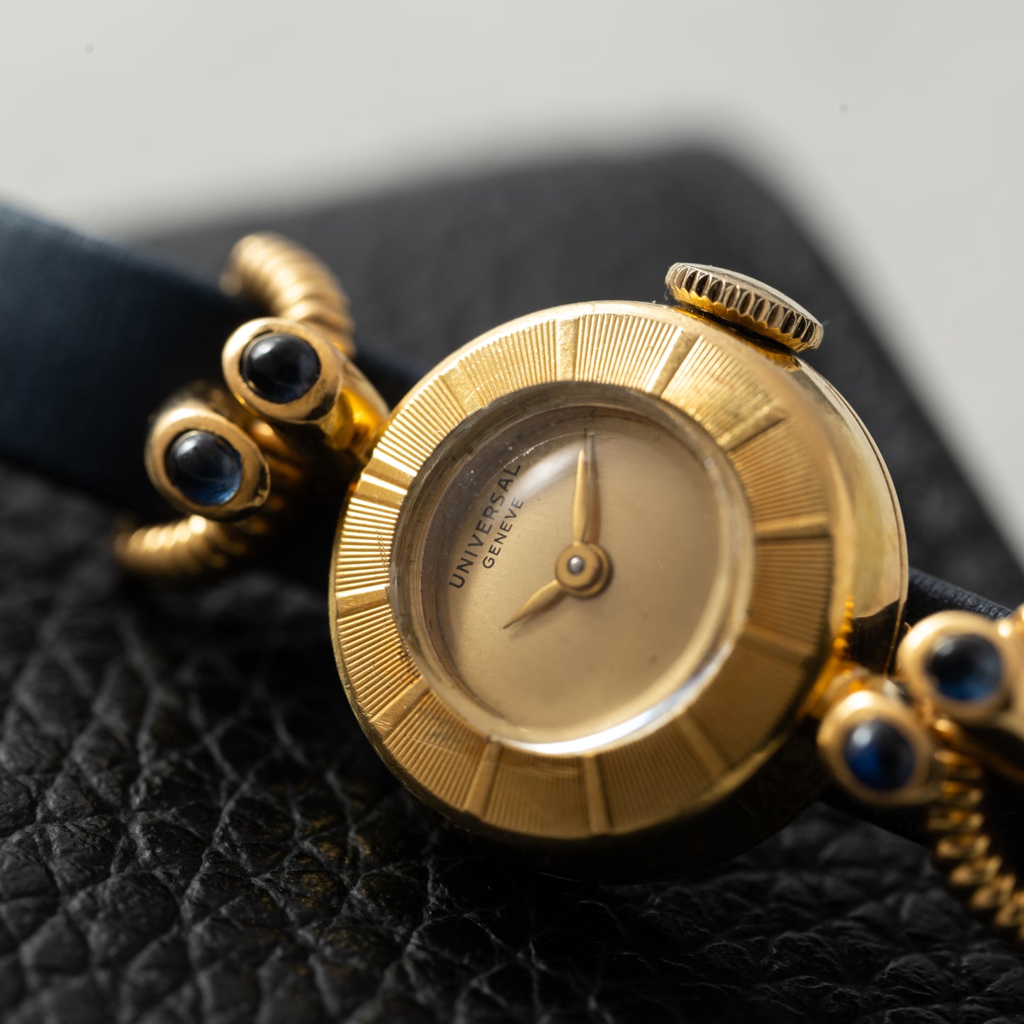 U.G.'s output was incredibly varied, as is evidenced by this gorgeous cocktail watch. Housed in a round yellow gold case with an unsigned crown, a fluted bezel, and an acrylic crystal, it features a gold-tone dial with matching gold leaf hands and the Universal Genève wordmark printed in black.