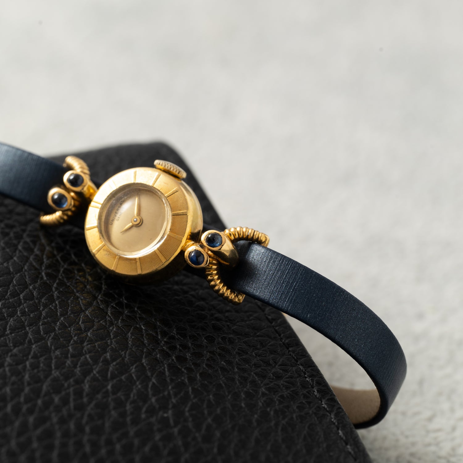 Attached to a simple black leather strap with a yellow gold buckle via ornate, stirrup-shaped yellow gold lugs fitted with blue cabochons, this cocktail watch packs 1950s charm into a potent package. Perfect for more formal events, it'll proudly add some mid 20th-century glamor to a 21st-century outfit.