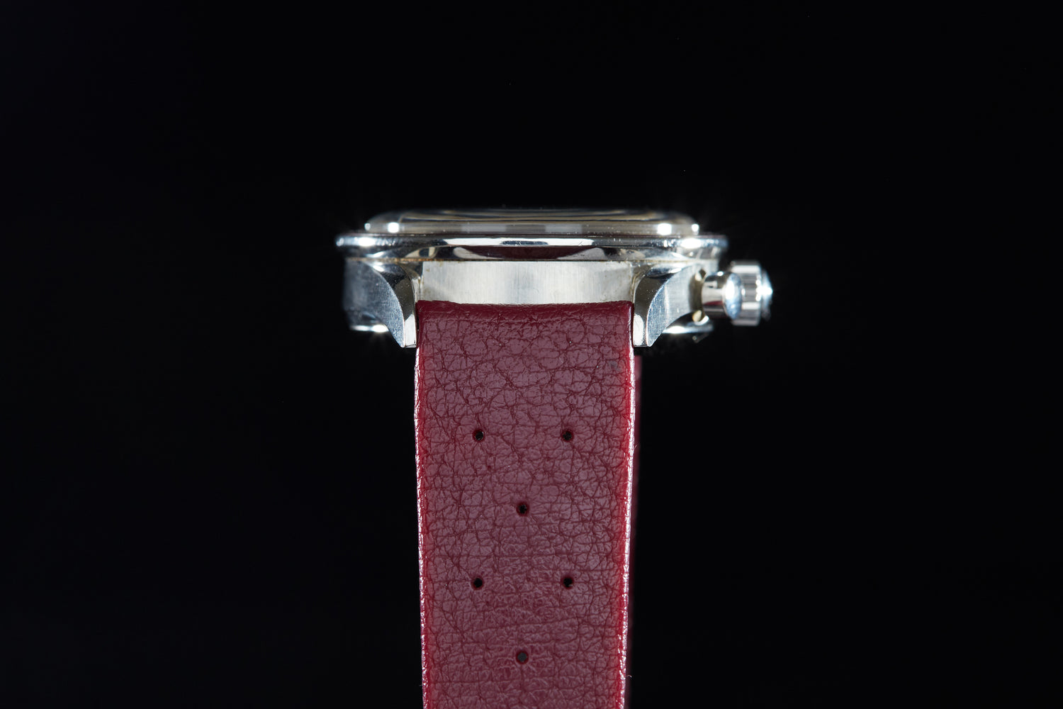 With its sharp twisted lugs and tachymeter bezel, the Compax 1950 is a nice wink not only to its predecessors on the UG side, but also to the Omega Speedmaster. As with the 1960s models, Universal Genève also experimented with a kaleidoscope of exotic dial colors. This one, a Reference 884.47) features a burgundy bezel and subsidiary registers, making it one of the most playful takes on the panda dial language of its forebears.