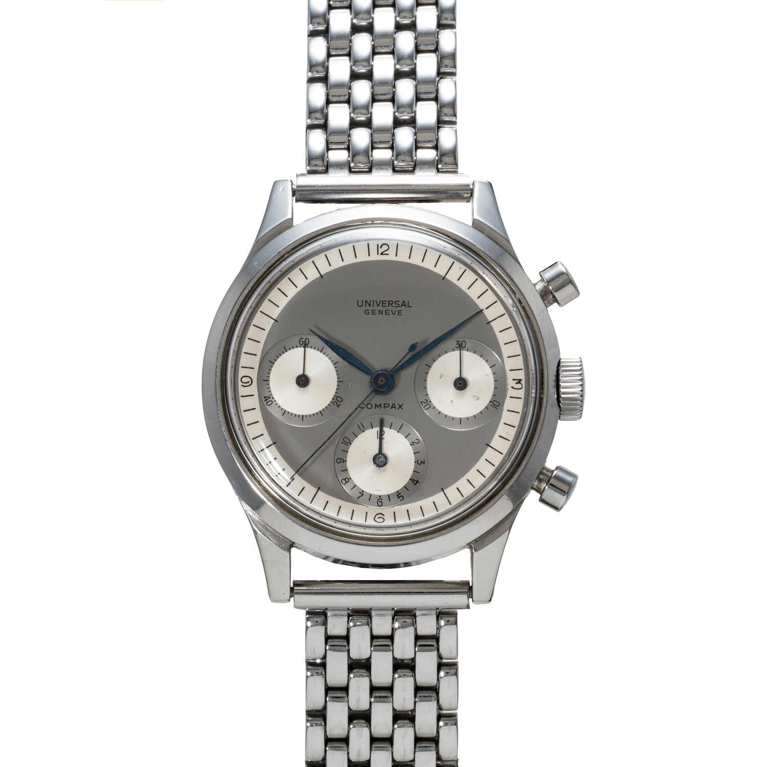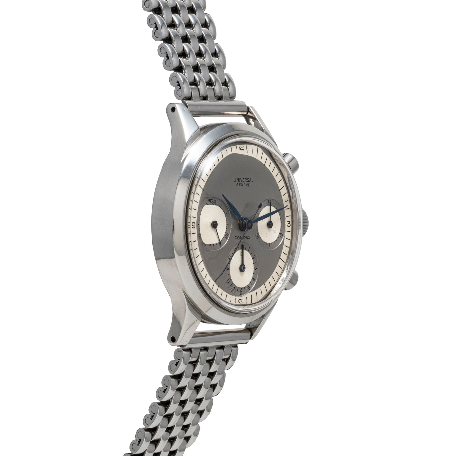 This watch is a Compax, one of the most notable chronos in history. In 1934, U.G. launched the Compur dual-register chronograph model at Basel. Two years later in 1936, it debuted two additional models: a dual-register 'Uni-Compax' with 45-minute and running seconds totalizers, and the triple-register Compax with 30-minute, 12-hour, and running seconds registers. The Compax has been viewed as one of the most important chronographs ever since.