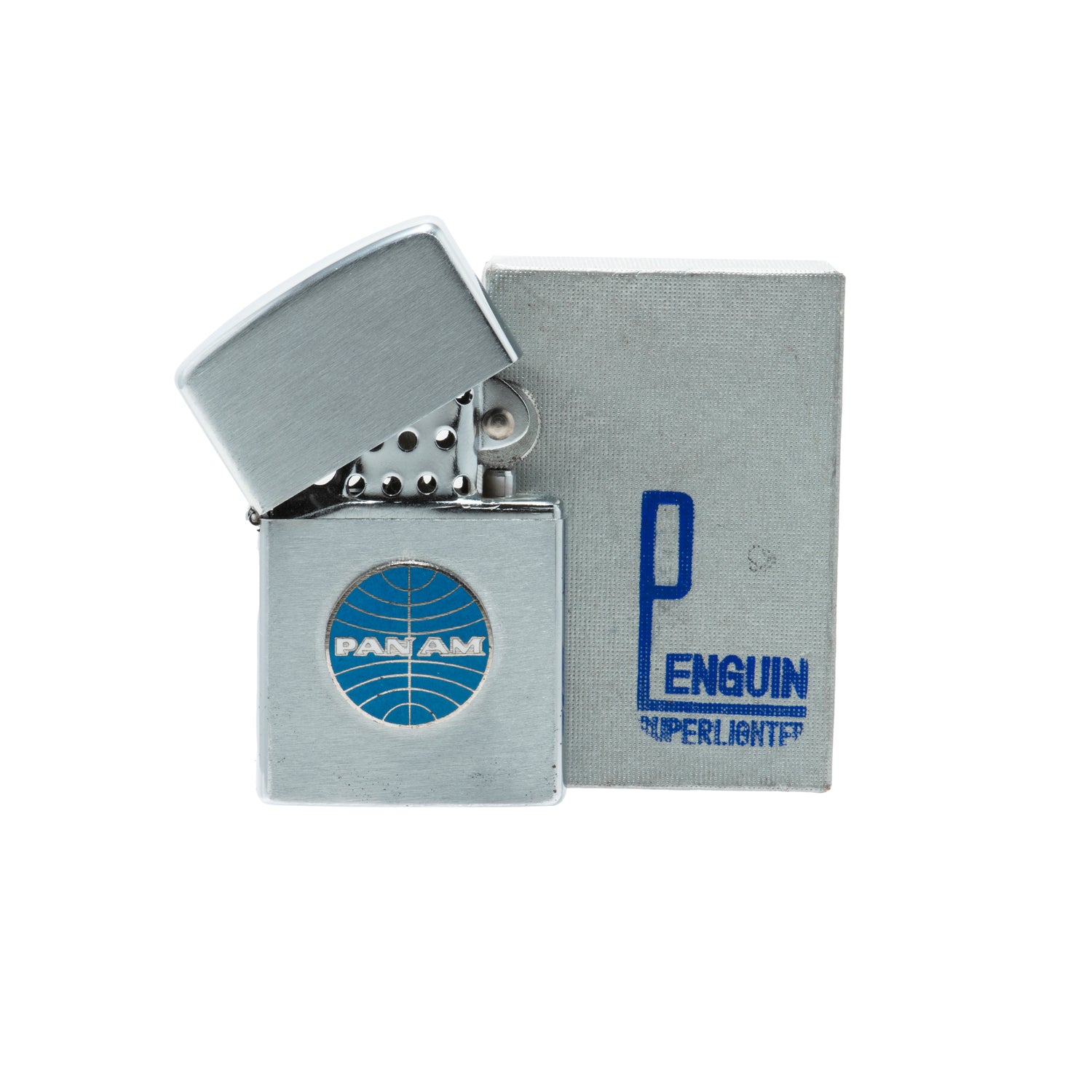 Dating to the 1950s-1960s, this find is a Zippo-style Penguin windproof lighter signed with an applied, blue and white Pan Am globe logo. Measuring 2.24” x 1.48” x 2.17” in stainless steel and including its original packaging and silver-colored cardboard box, this unfired lighter made in Japan is truly a museum piece.